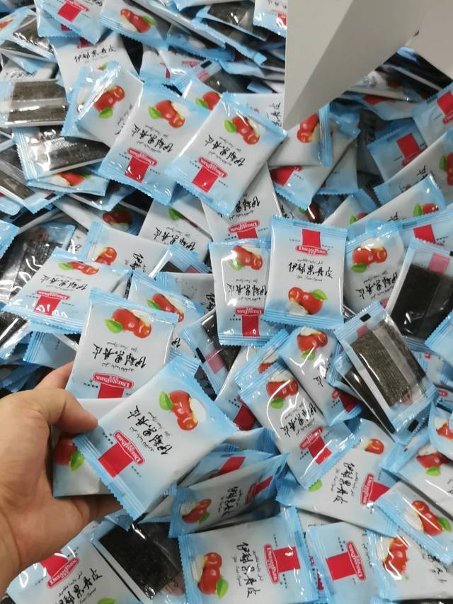 树莓口味。每袋两片。 偏软 ,偏甜。有树莓种子在其中,嚼起来嘎吱嘎吱脆!口味丰富 每年的8.9月份,在新疆伊犁成批的树莓成熟 树莓在这里又叫玛琳娜,是一种很受欢迎的小果酱 它具有化痰止咳 润肺活血 利肾的功效!