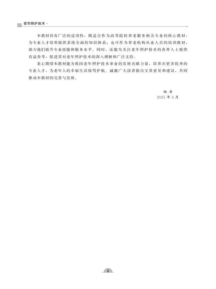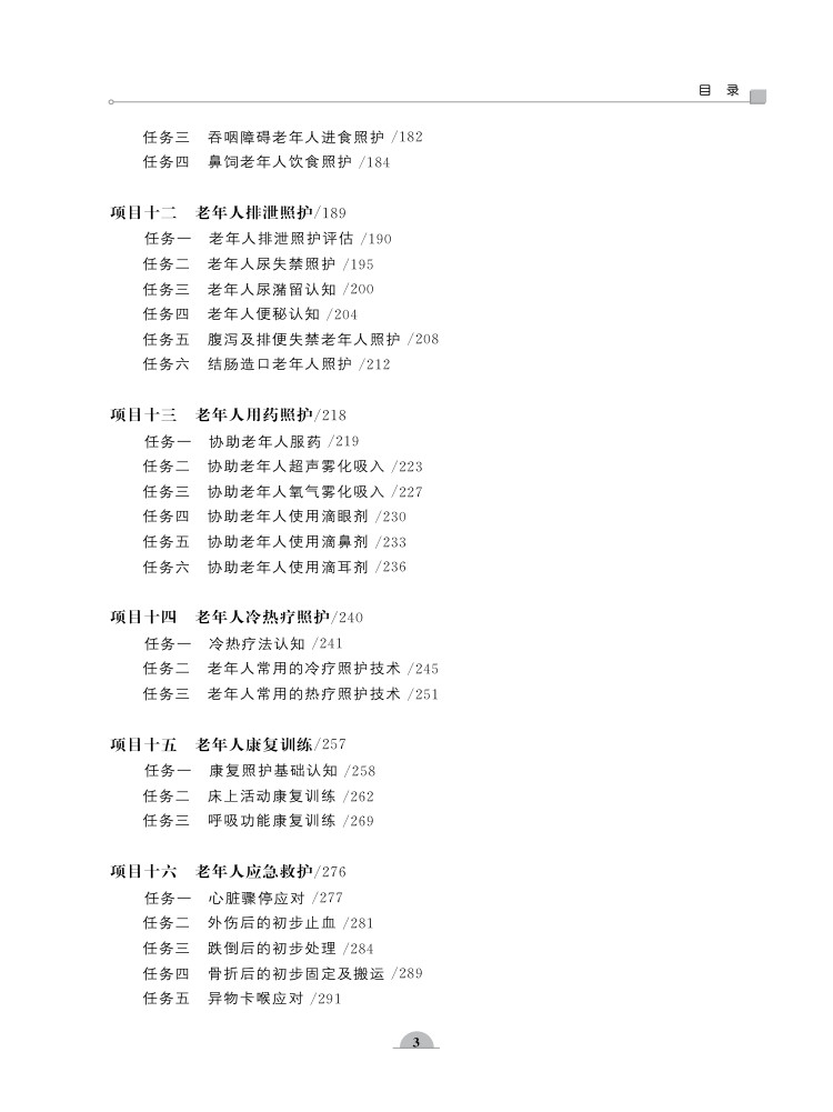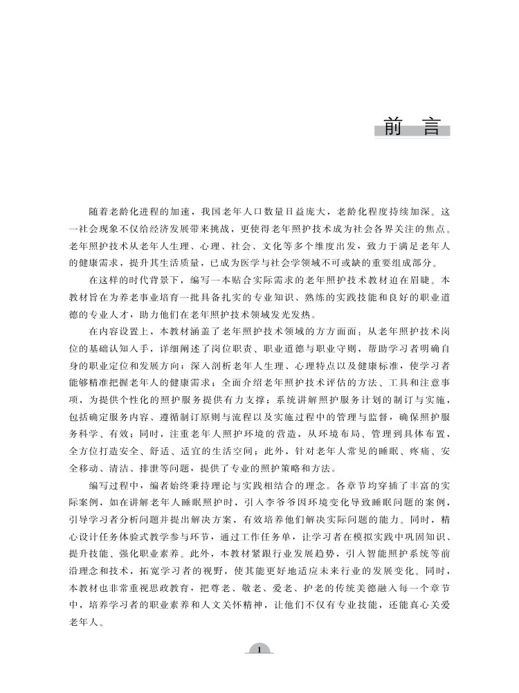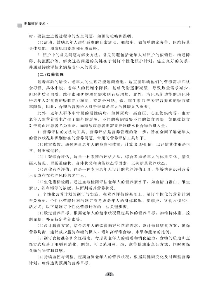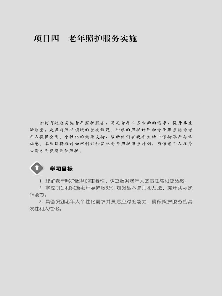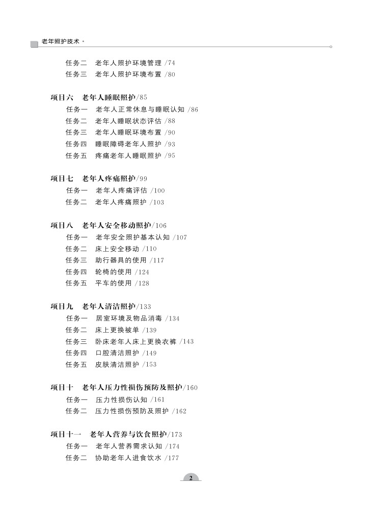 项,为提供个性化的照护服务提供有力支撑;系统讲解照护服务计划的制订与实施,包括确定服务内容、遵循制订原则与流程以及实施过程中的管理与监督,确保照护服务科学、有效;同时,注重老年人照护环境的营造,从环境布局、管理到具体布置,全方位打造安全、舒适、适宜的生活空间;此外,针对老年人常见的睡眠、疼痛、安全移动、清洁、排泄等问题,提供了专业的照护策略和方法。