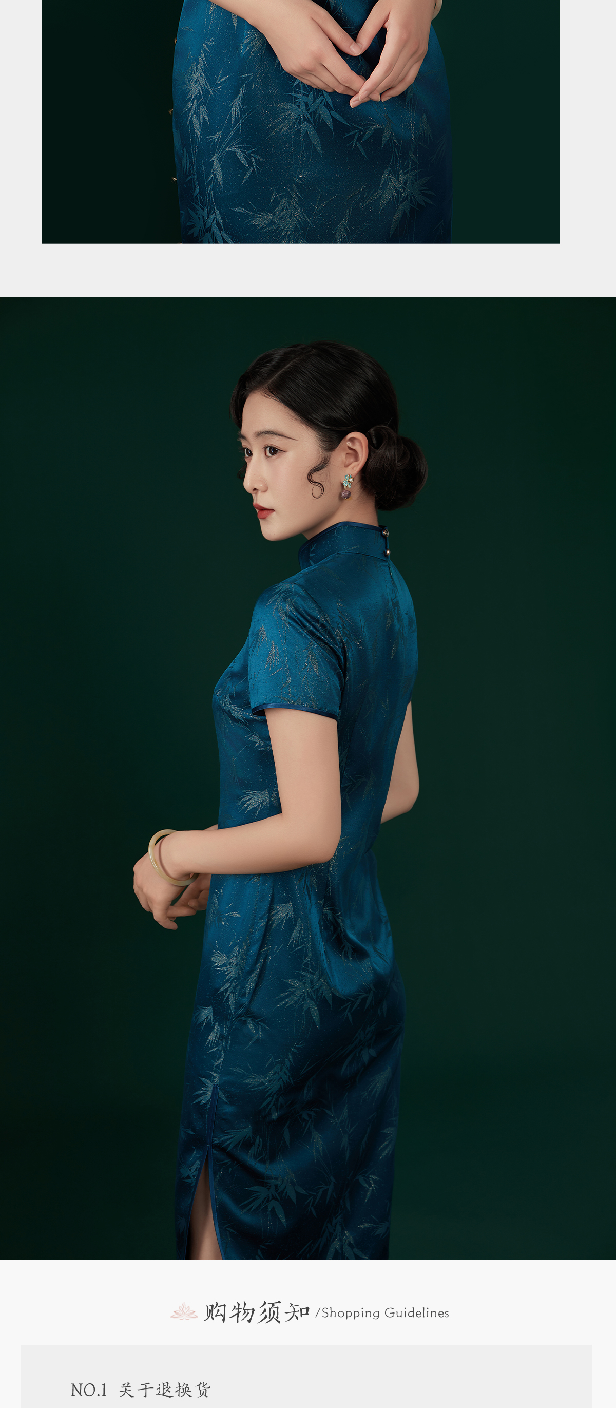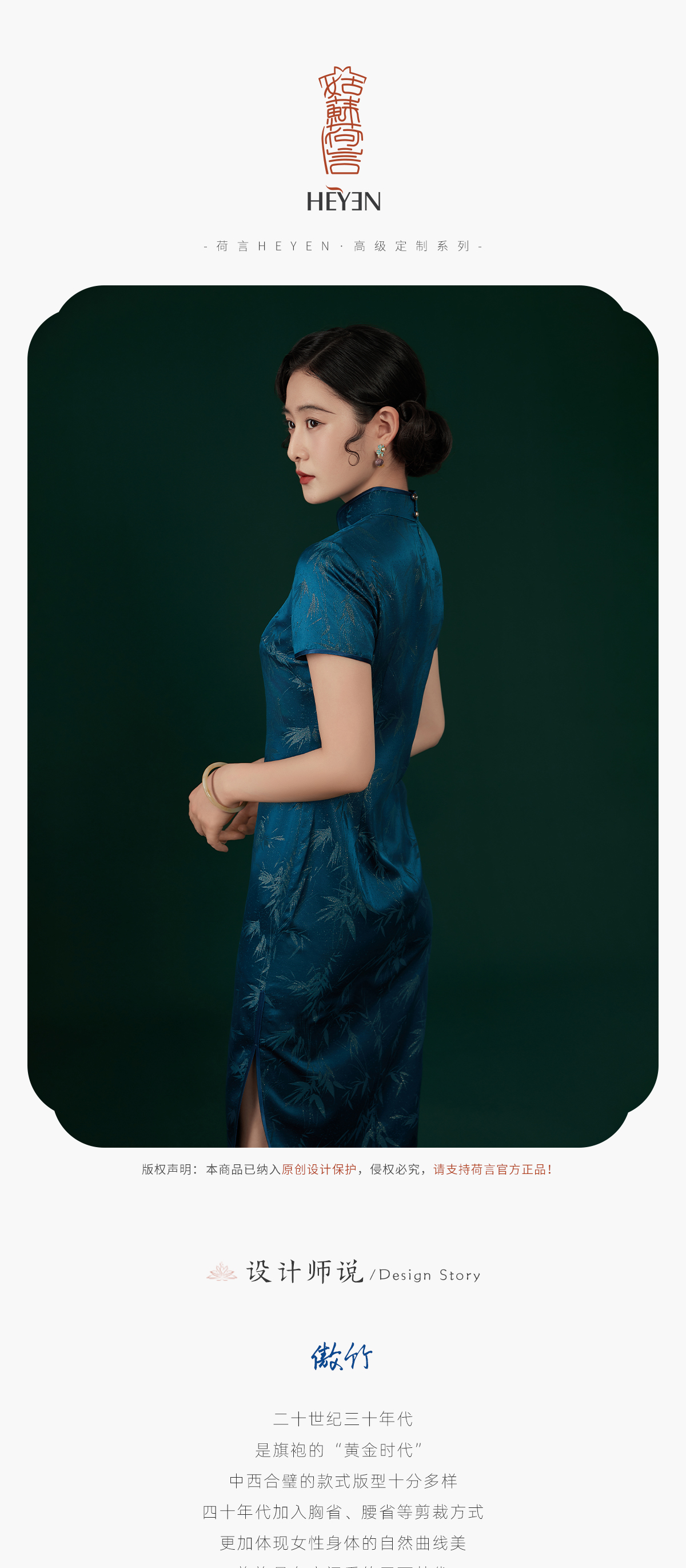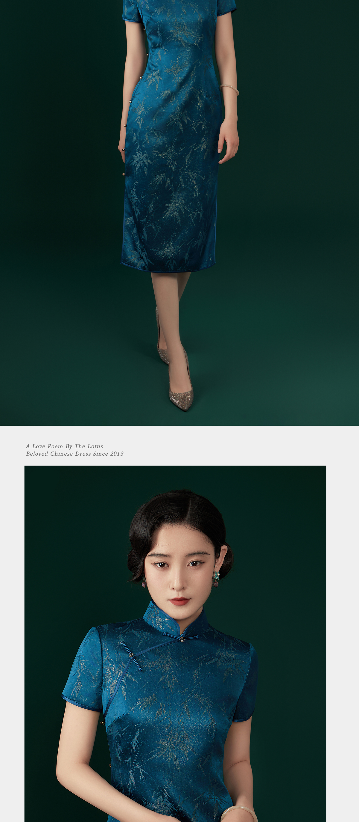 荷言HEYEN 傲竹 桑蚕丝雨打寒竹织金正绢蓝色旗袍手工一字钻扣高定系列
