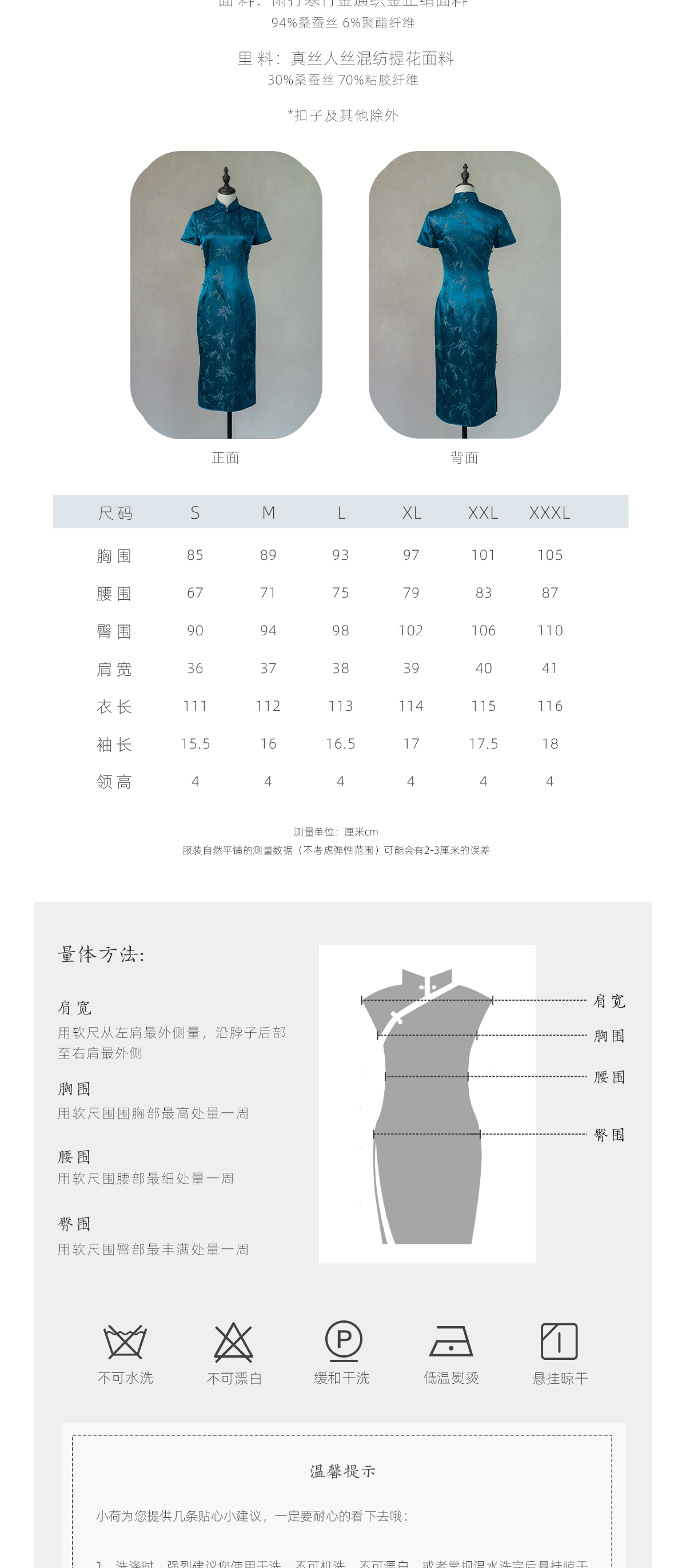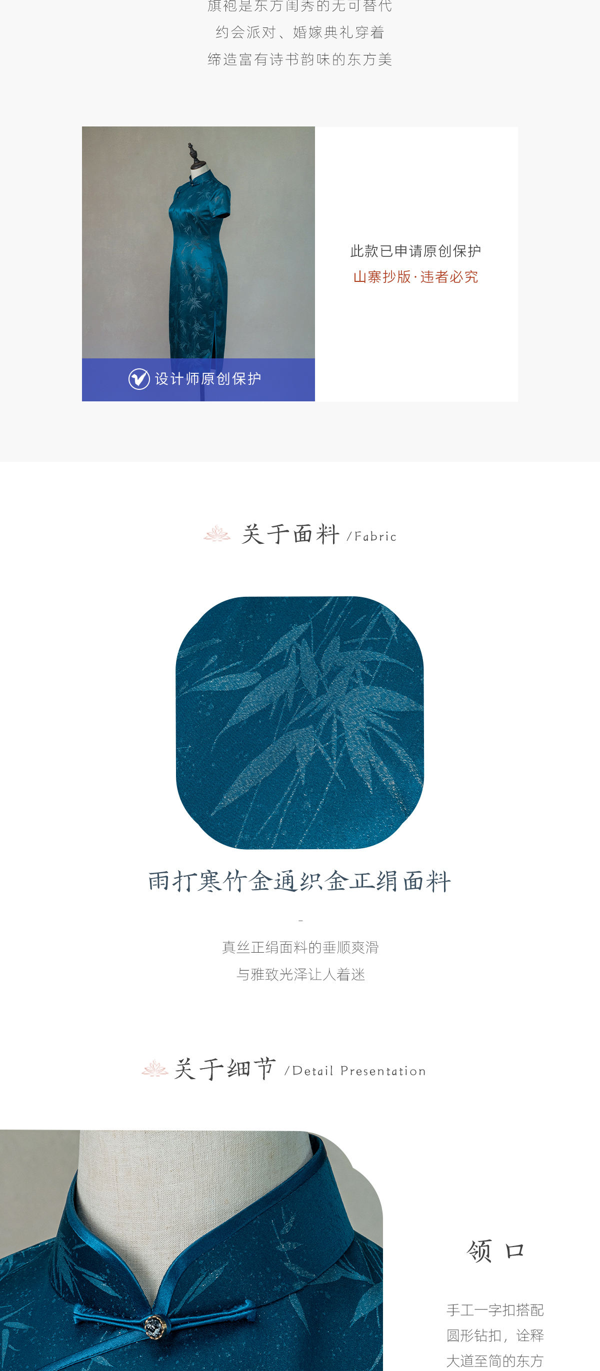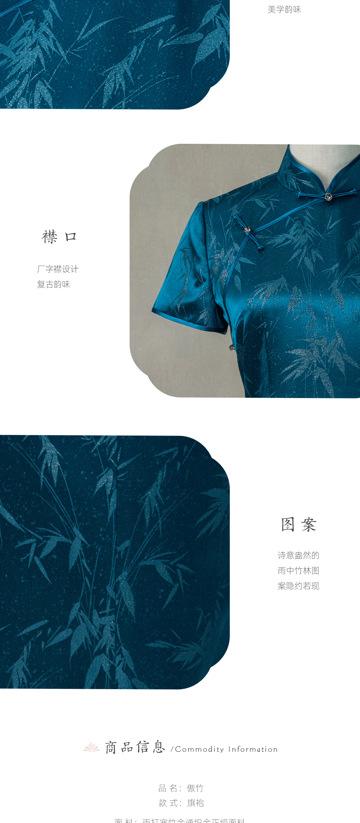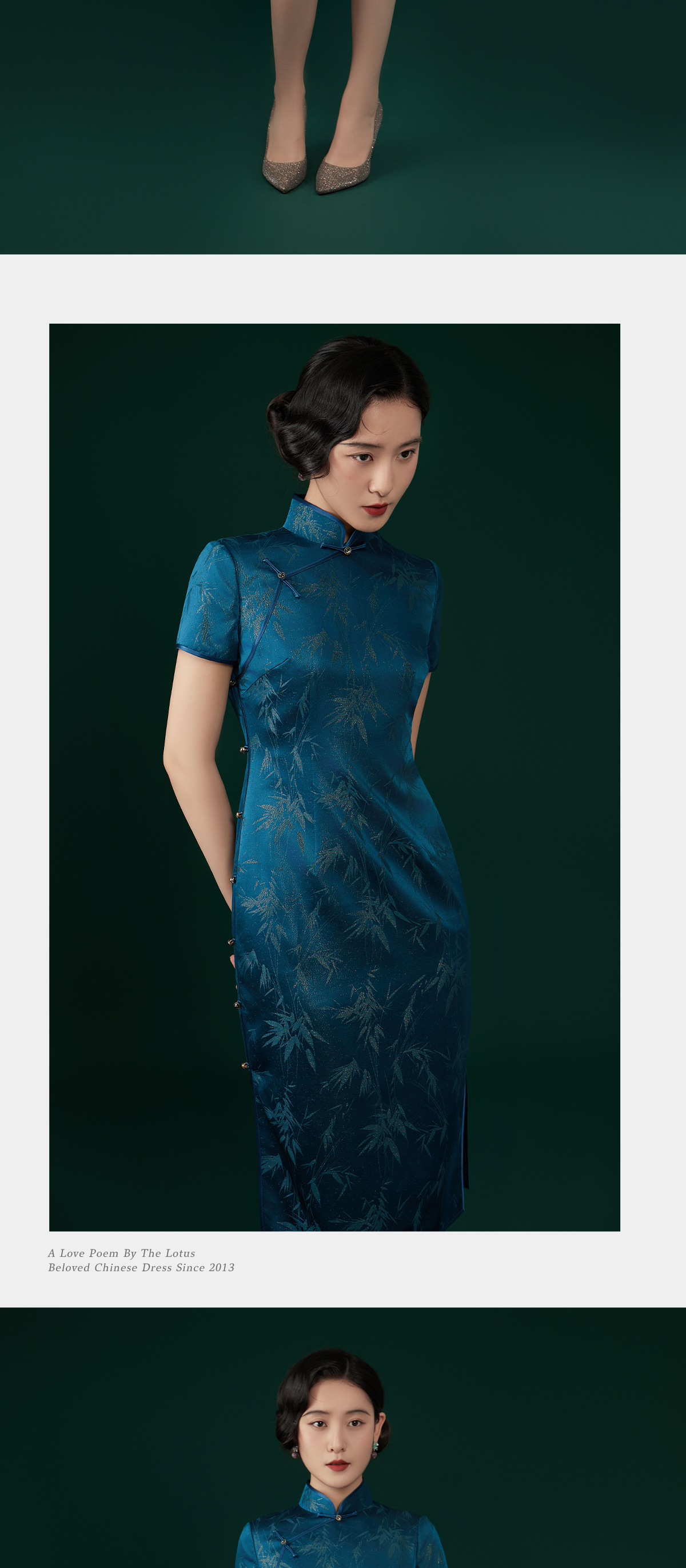 荷言HEYEN 傲竹 桑蚕丝雨打寒竹织金正绢蓝色旗袍手工一字钻扣高定系列