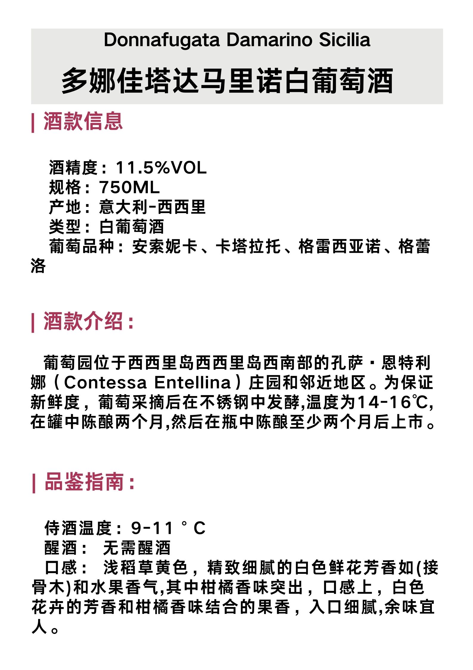 多娜佳塔达马里诺白葡萄酒 Donnatugata Damarino Sicilia