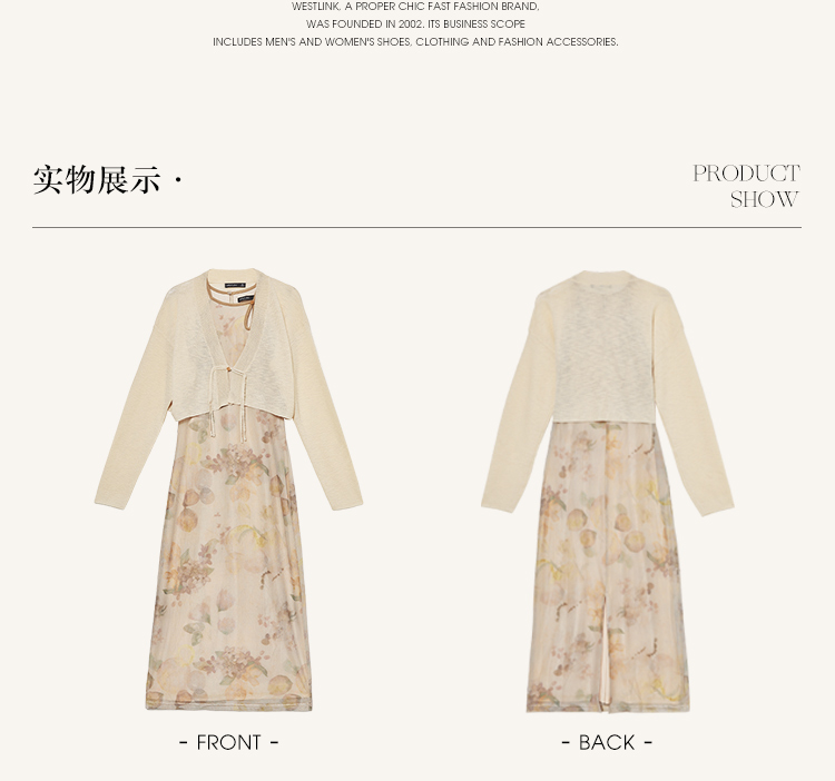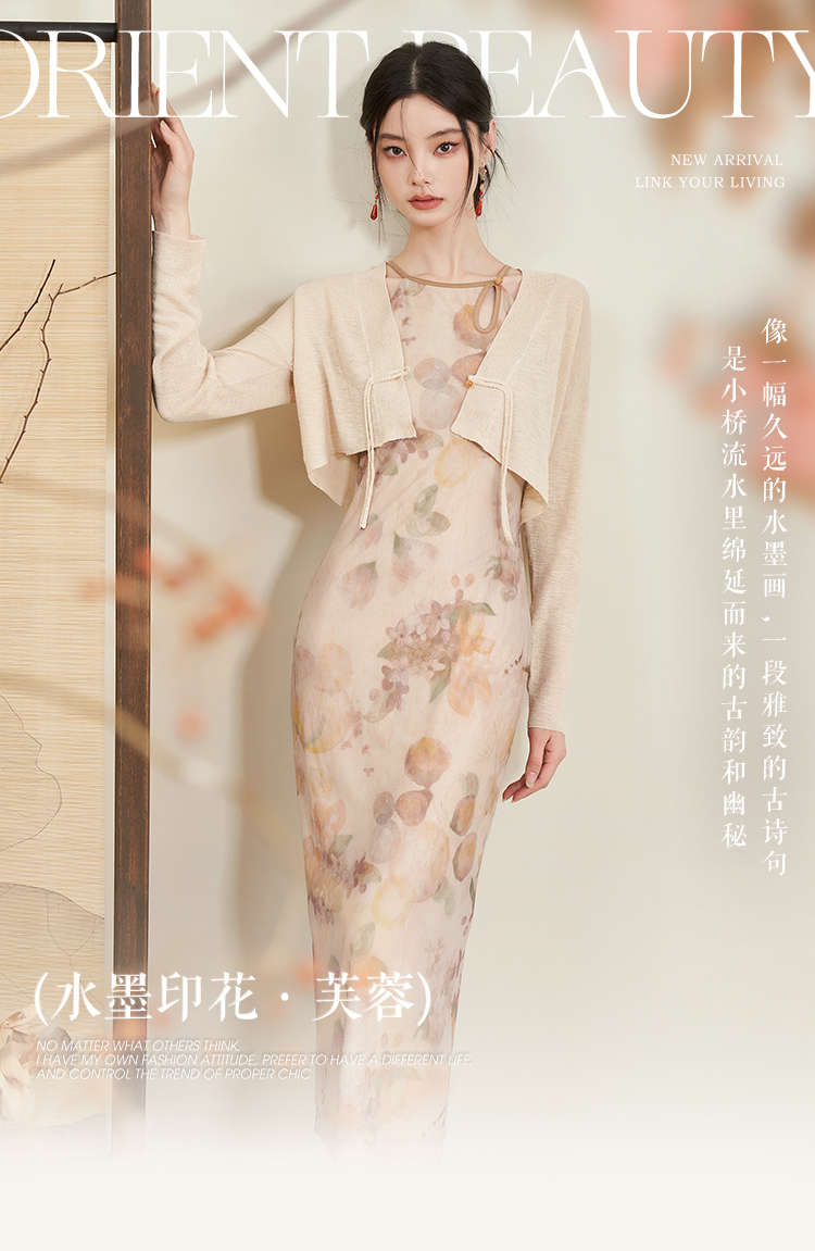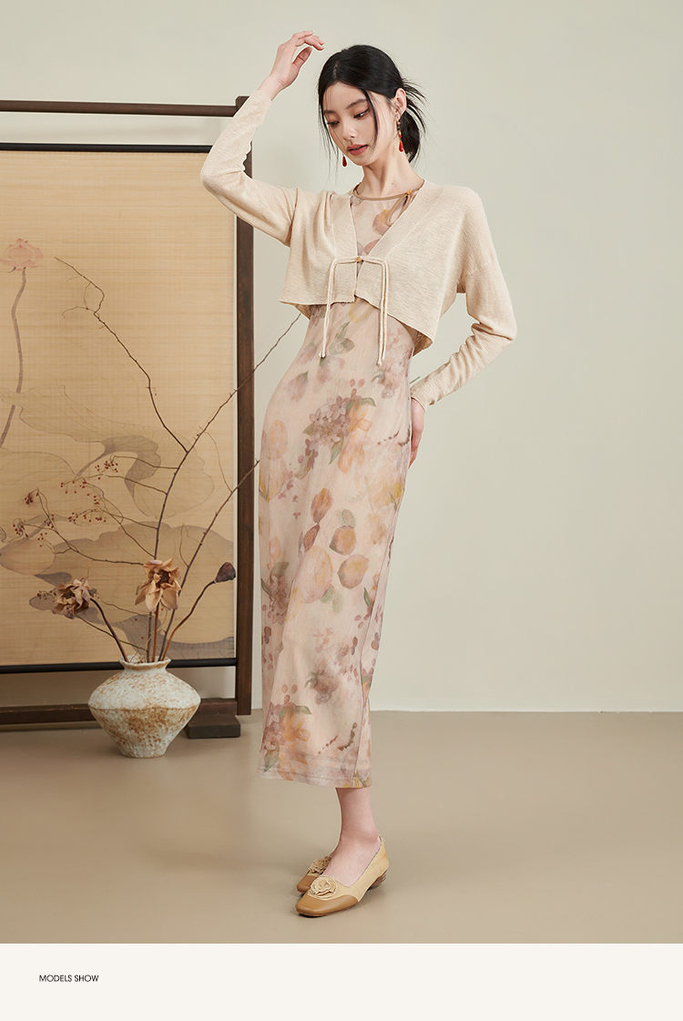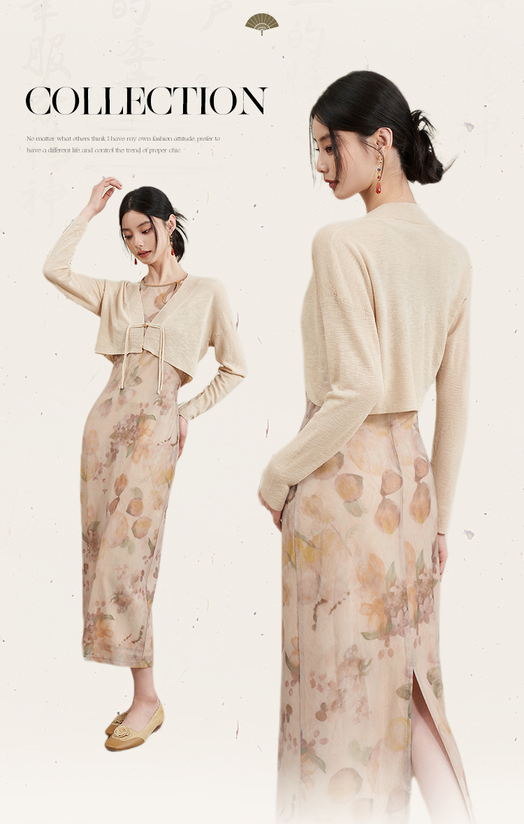 西遇杏色国风气质两件套连衣裙女新款挂脖修身裙配薄开衫D0640373