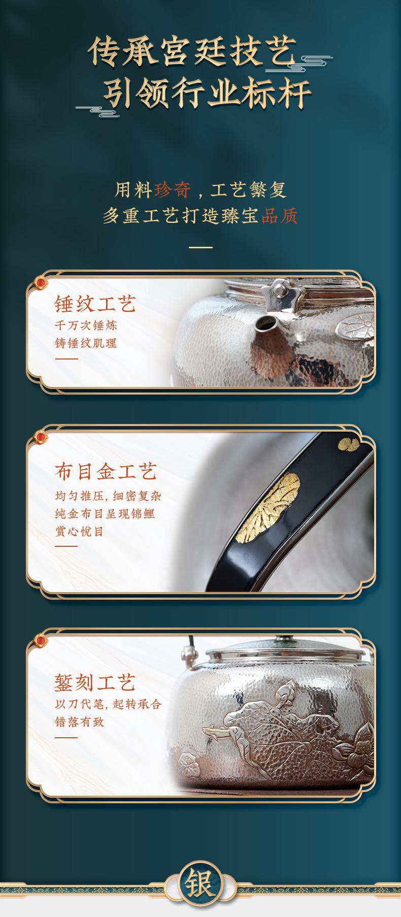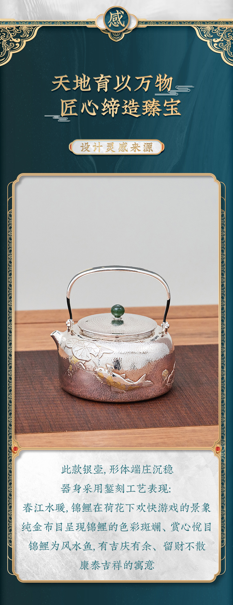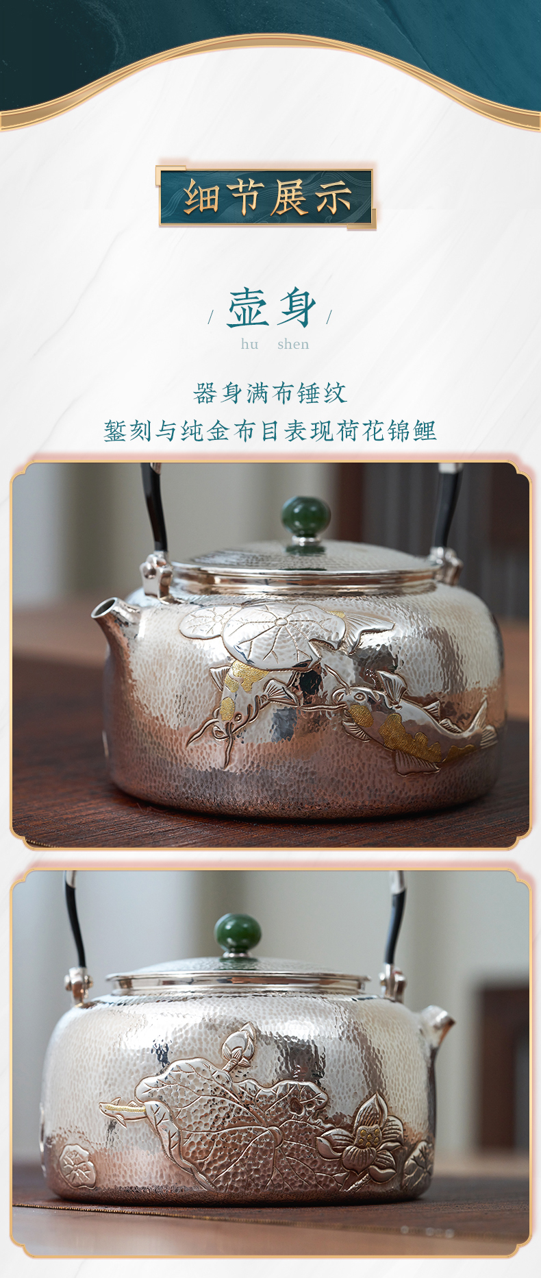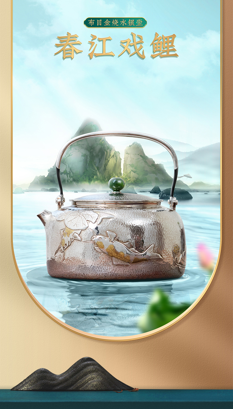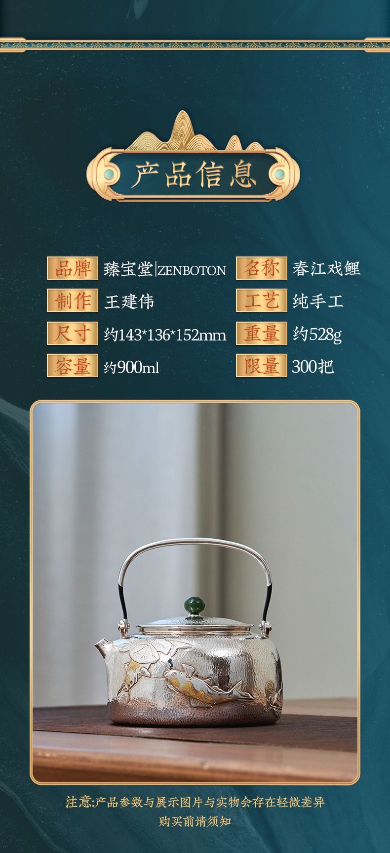 臻宝堂春江戏鲤(布目金)银壶(约900ml)