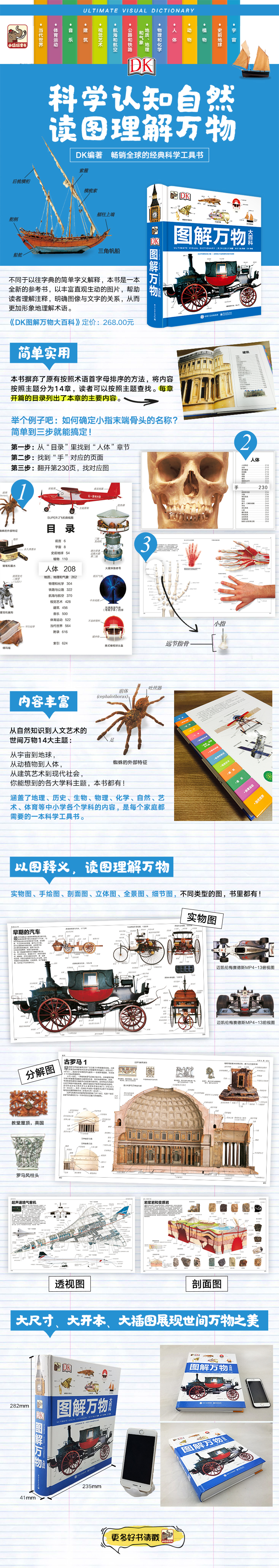 《DK图解万物大百科》全书共有14章,涵盖了宇宙、史前地球、植物、动物、人体等。不同于字典简单的字义解释,除了详细的注释,还有配大量直观的图片介绍,使读者不仅能快速掌握各个部件的名称,还能了解各个部件之间的相互关联及其功能原理。轻松解答您的疑问,丰富您的知识储备,适合所有年龄段读者阅读。