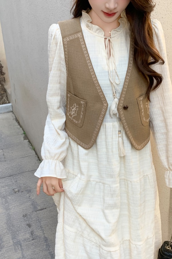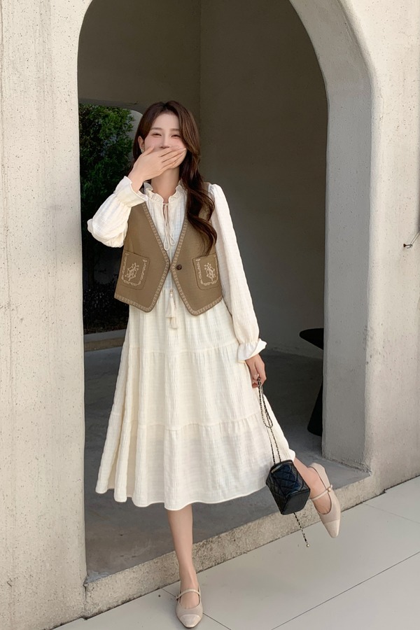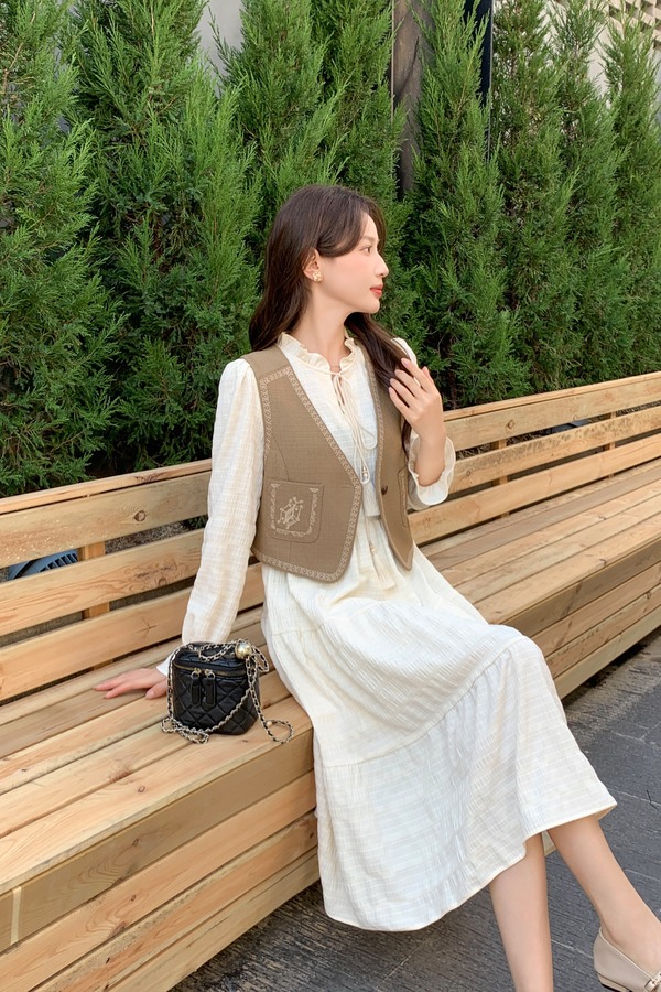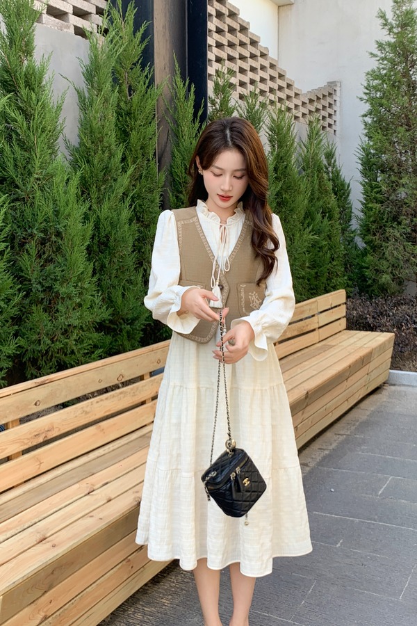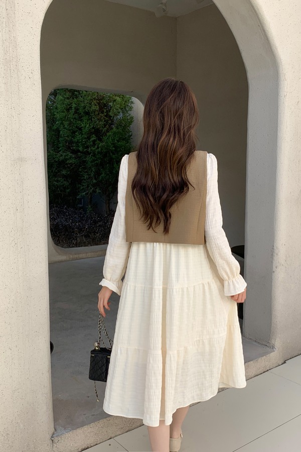 Le Malene 文艺杏色连衣裙马甲套装 19744