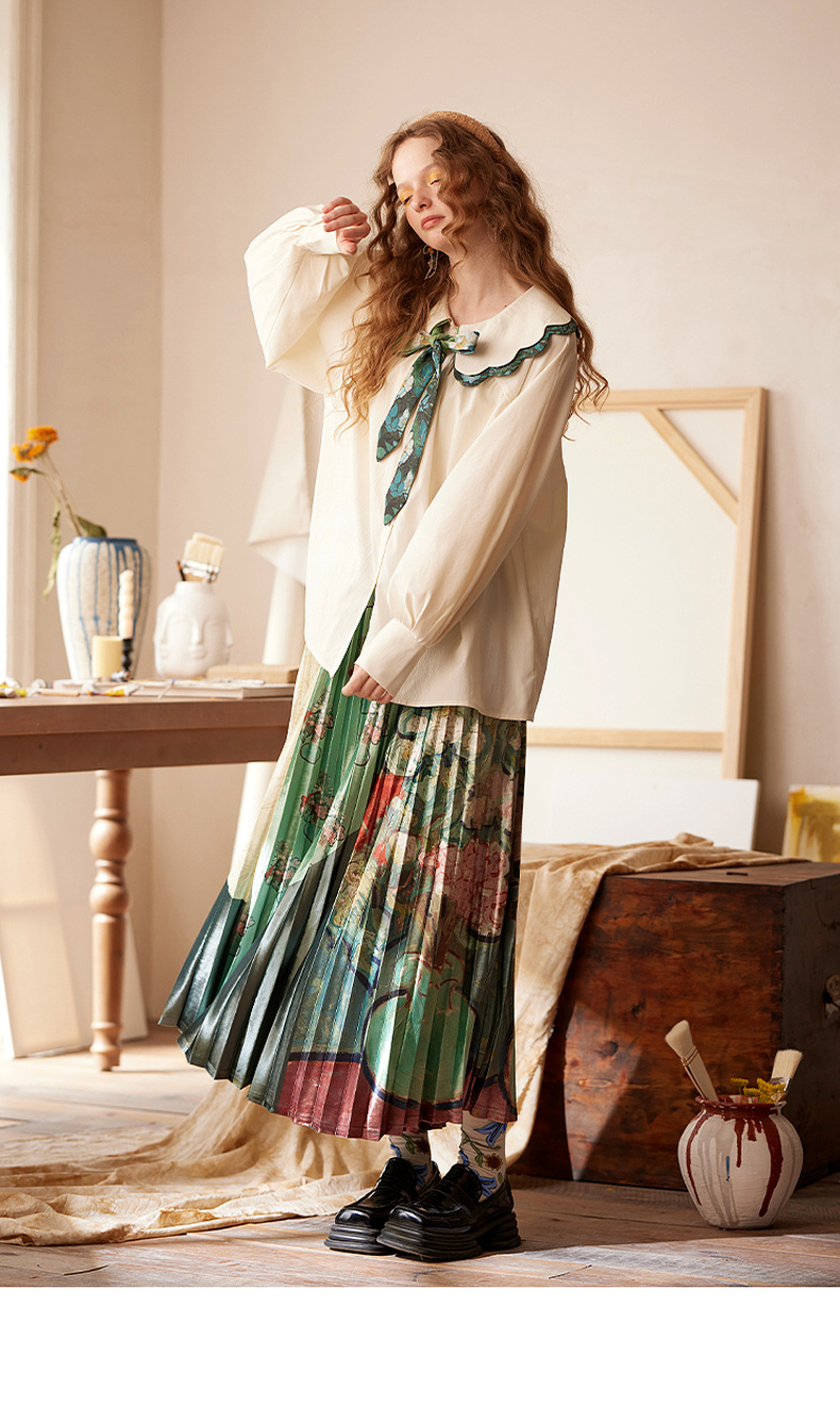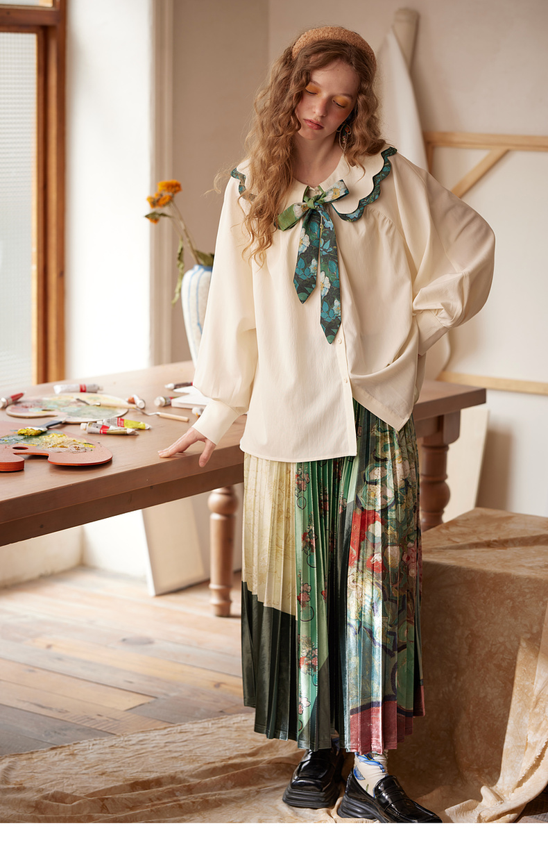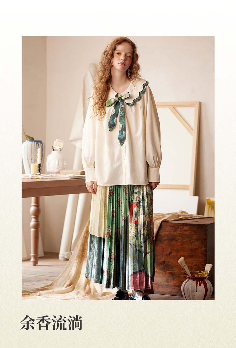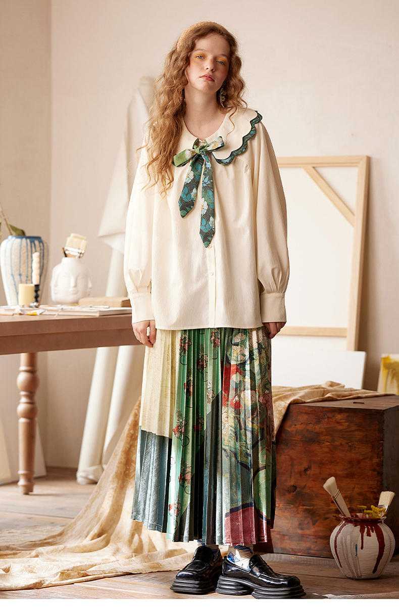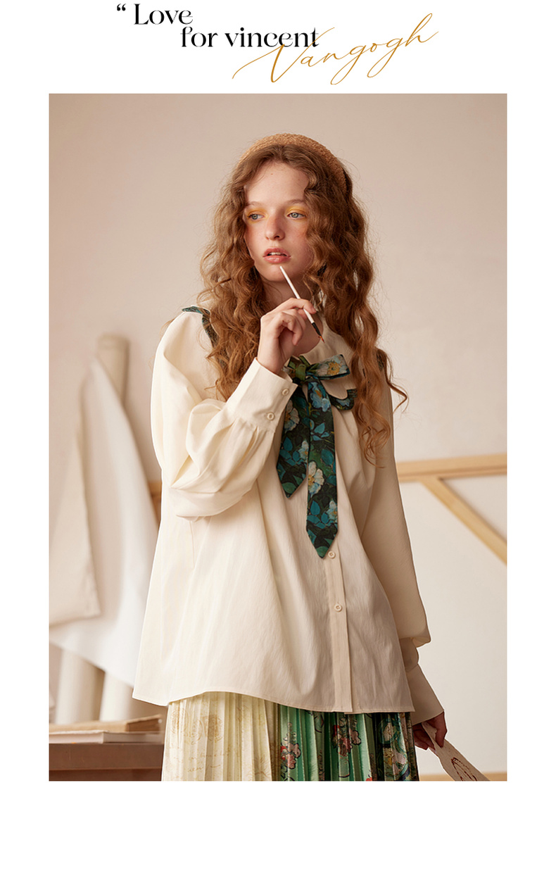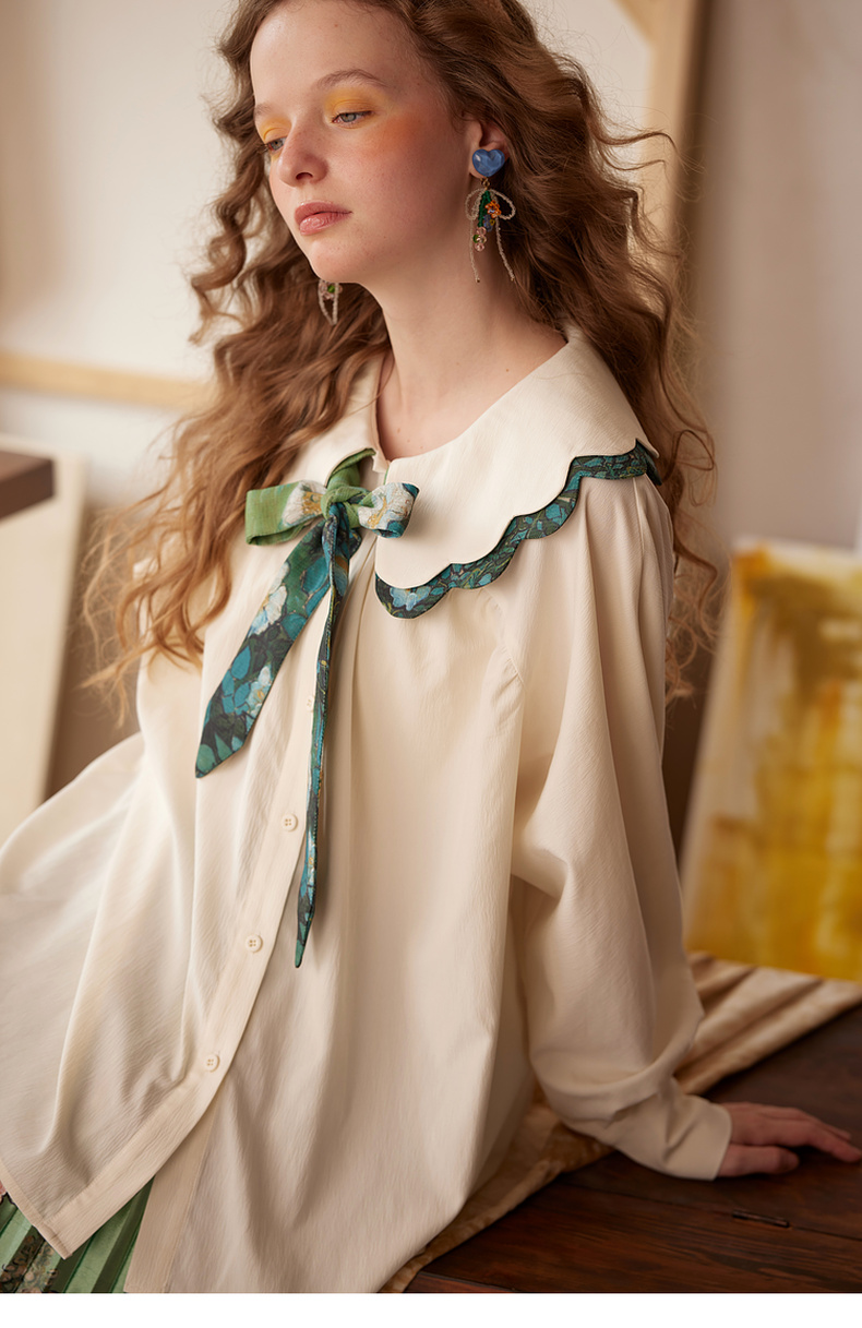 两三事梵高文艺余香流淌印花绑带波浪边翻领衬衫女