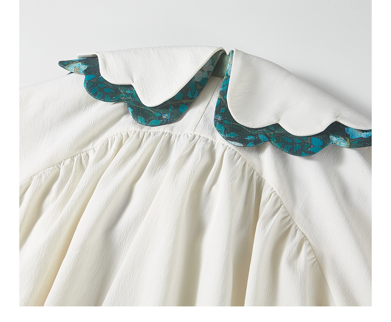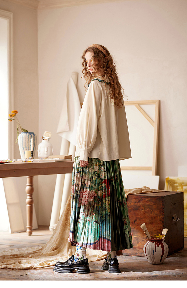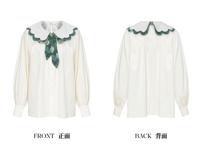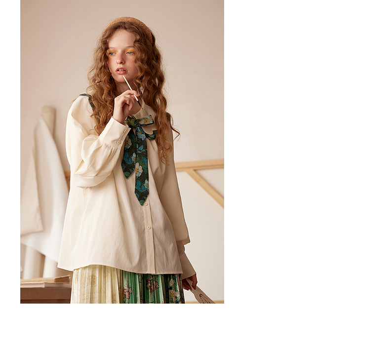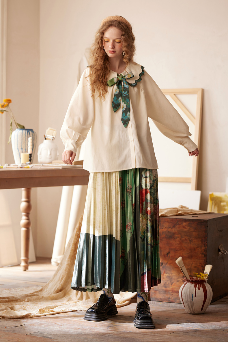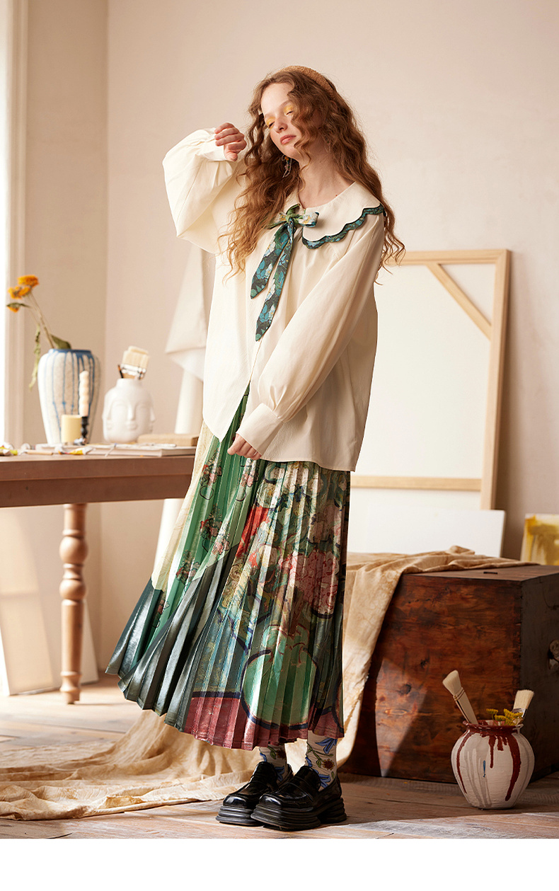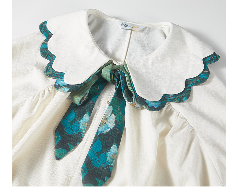 两三事梵高文艺余香流淌印花绑带波浪边翻领衬衫女