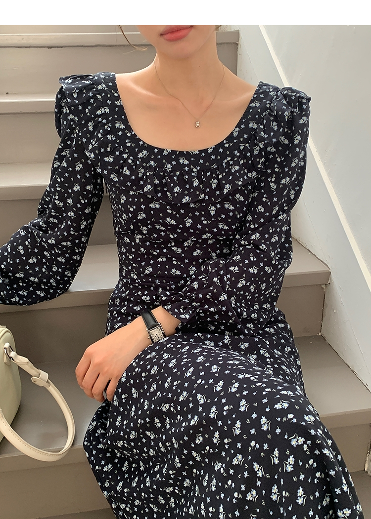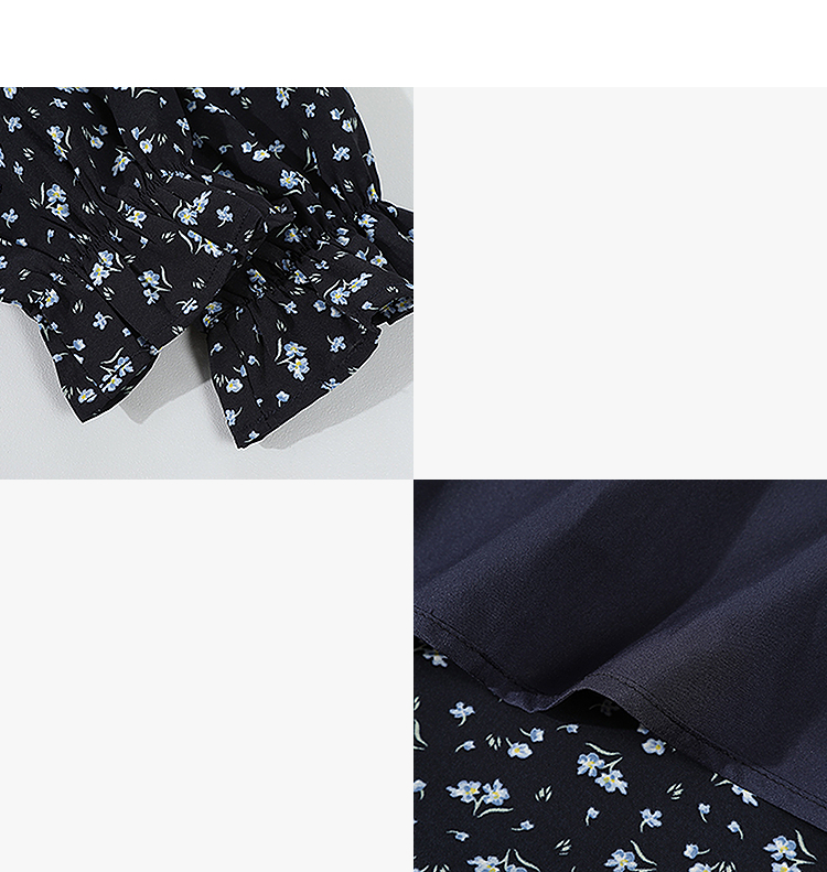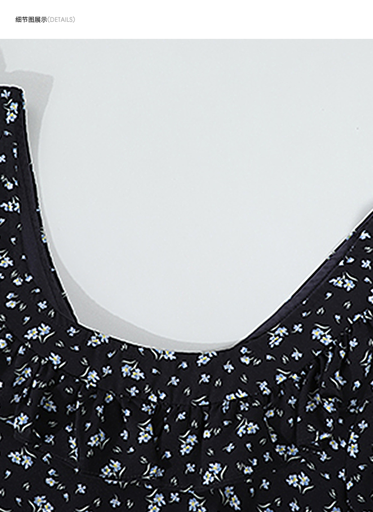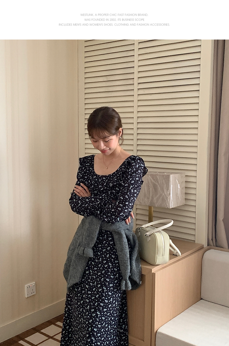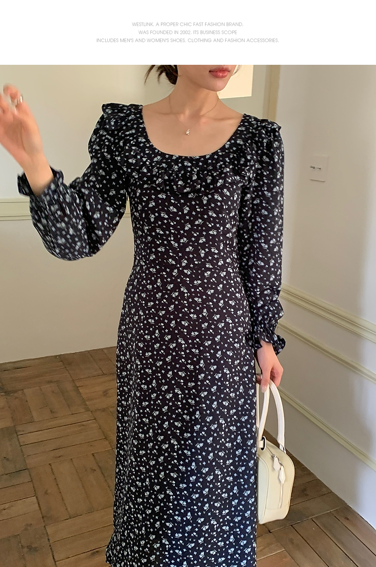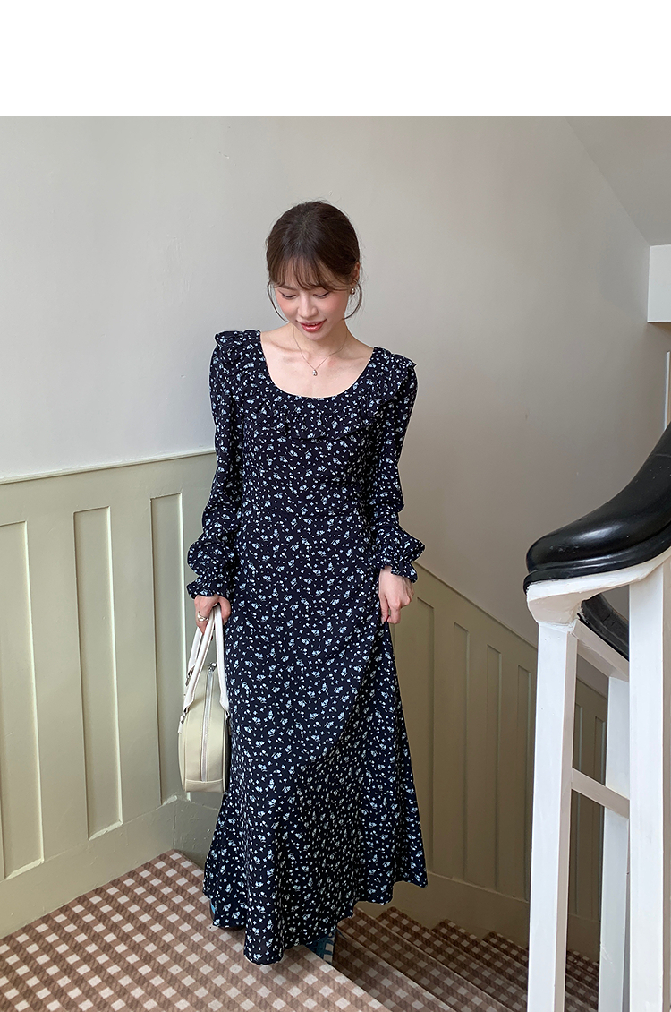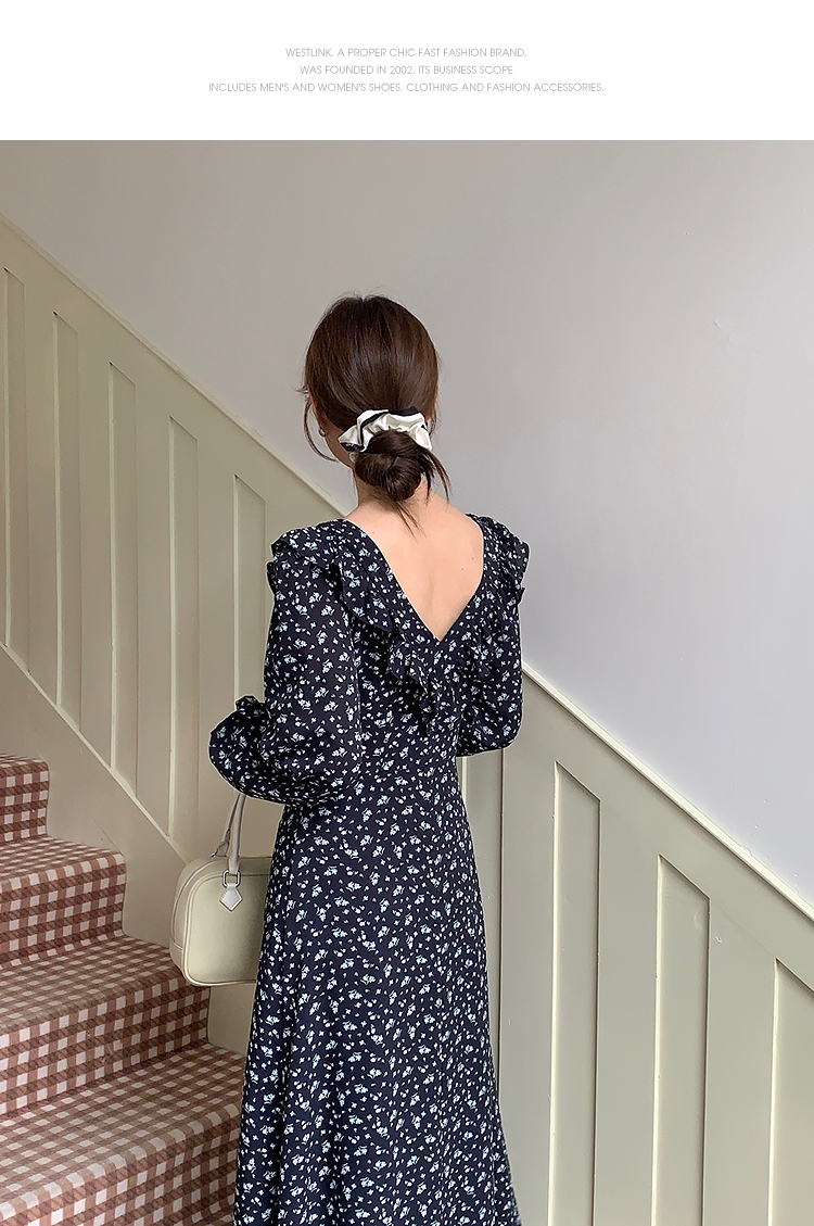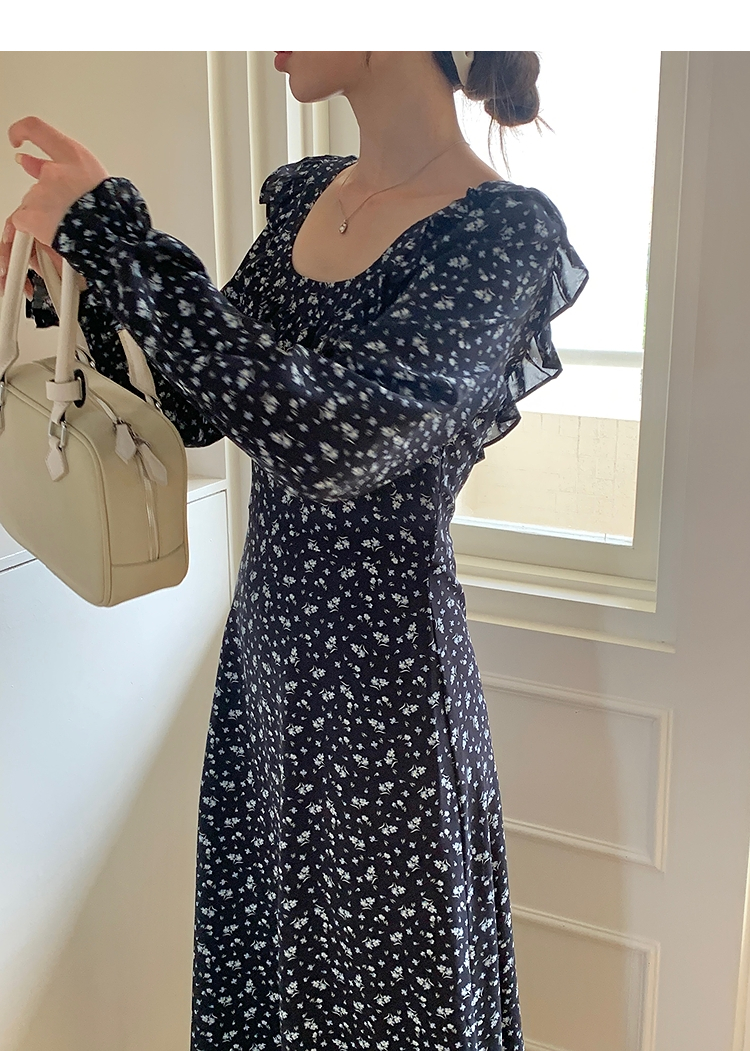 西遇碎花长袖连衣裙女新款藏蓝色法式收腰荷叶边裙子SS150077