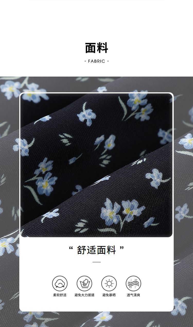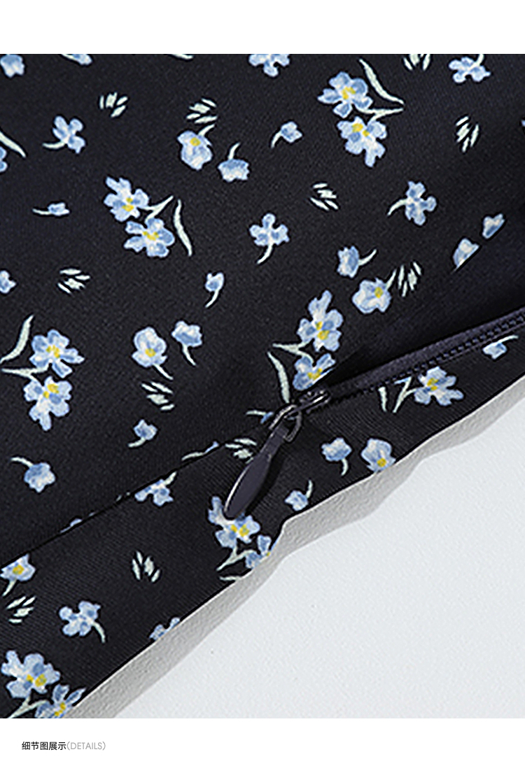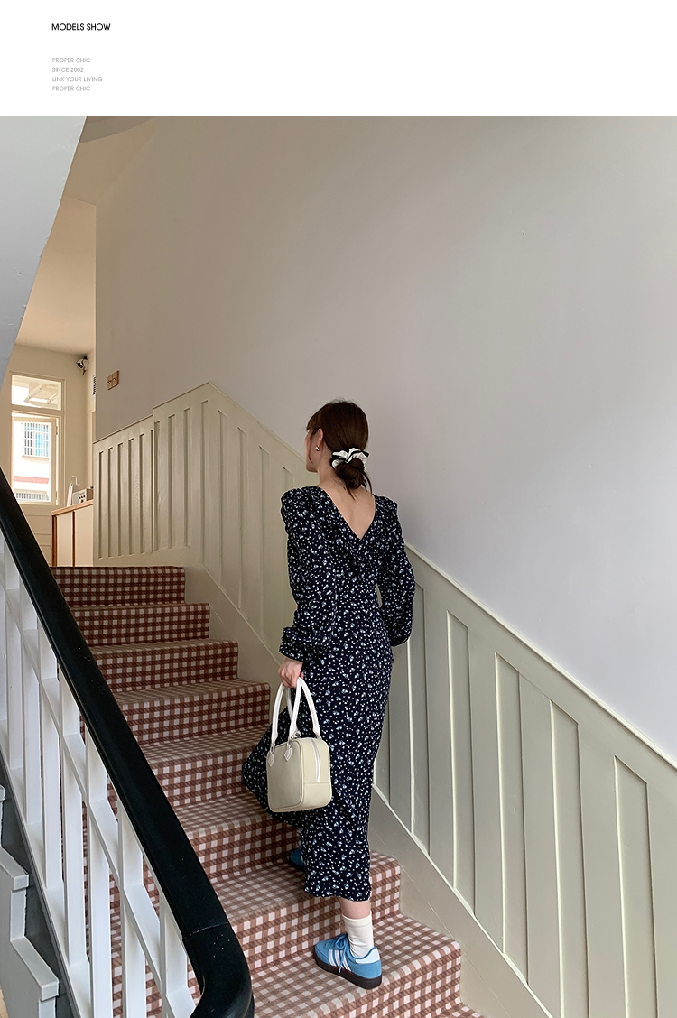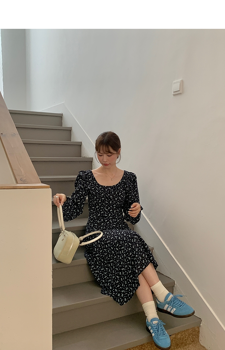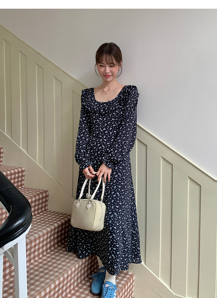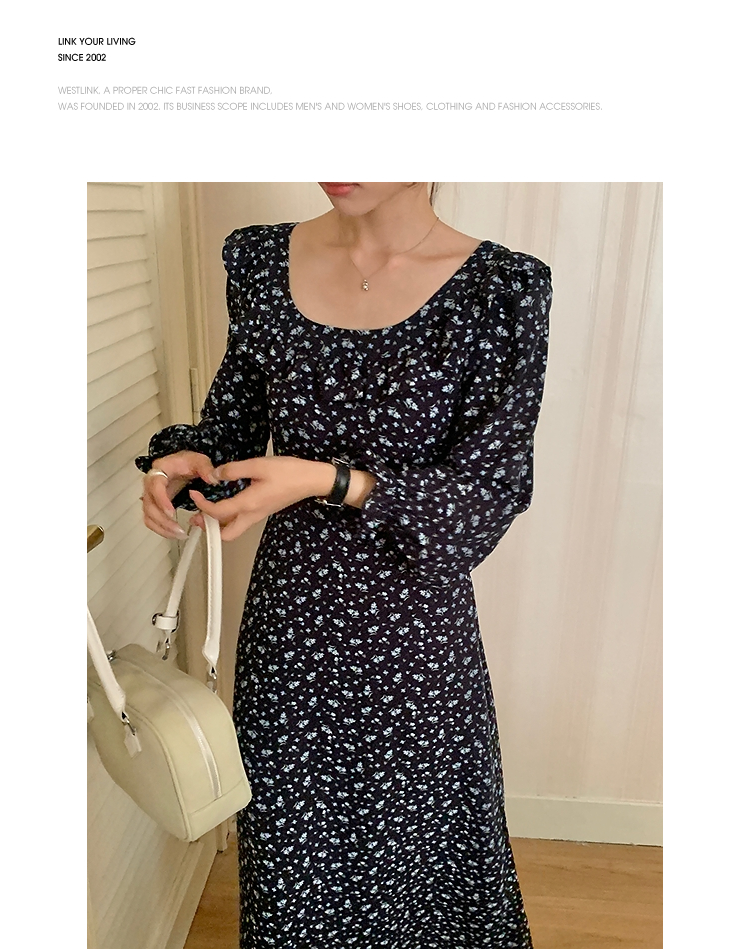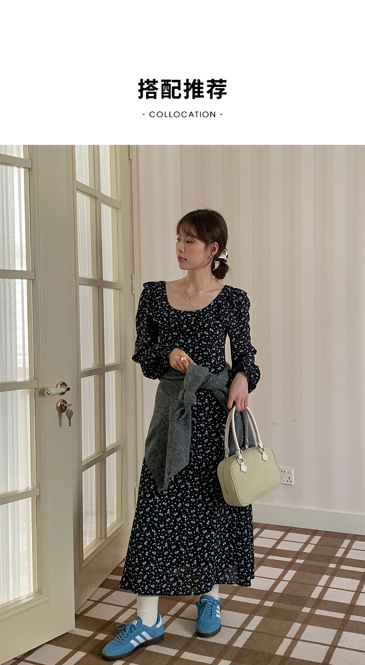 西遇碎花长袖连衣裙女新款藏蓝色法式收腰荷叶边裙子SS150077
