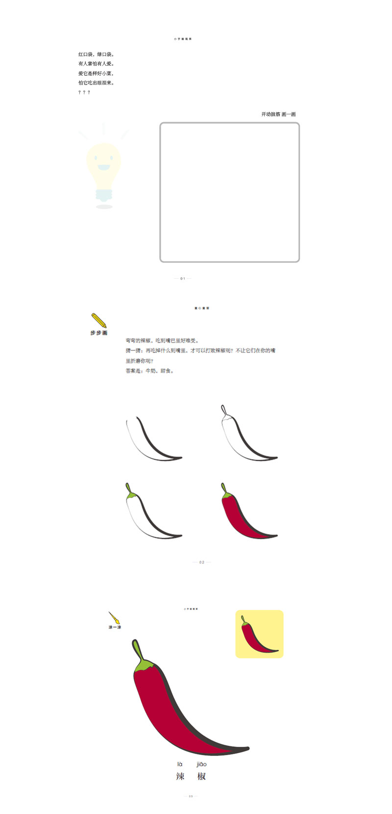 这是一本集儿歌、谜语、拼音、识字、涂色于一体的少儿美术启蒙书,不同于市场上多见的填色书,能给孩子大脑以多方面的刺激,不但有简单易操作的涂色,也有朗朗上口的谜语和儿歌,还有锻炼孩子眼、脑、手协调发展的分步画,色彩明快,难易结合,设计丰富不单调,适合多个年龄段的孩子。