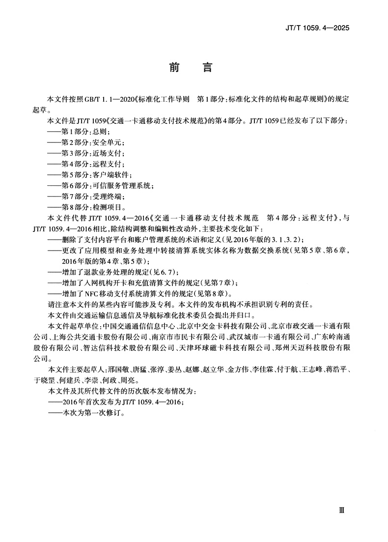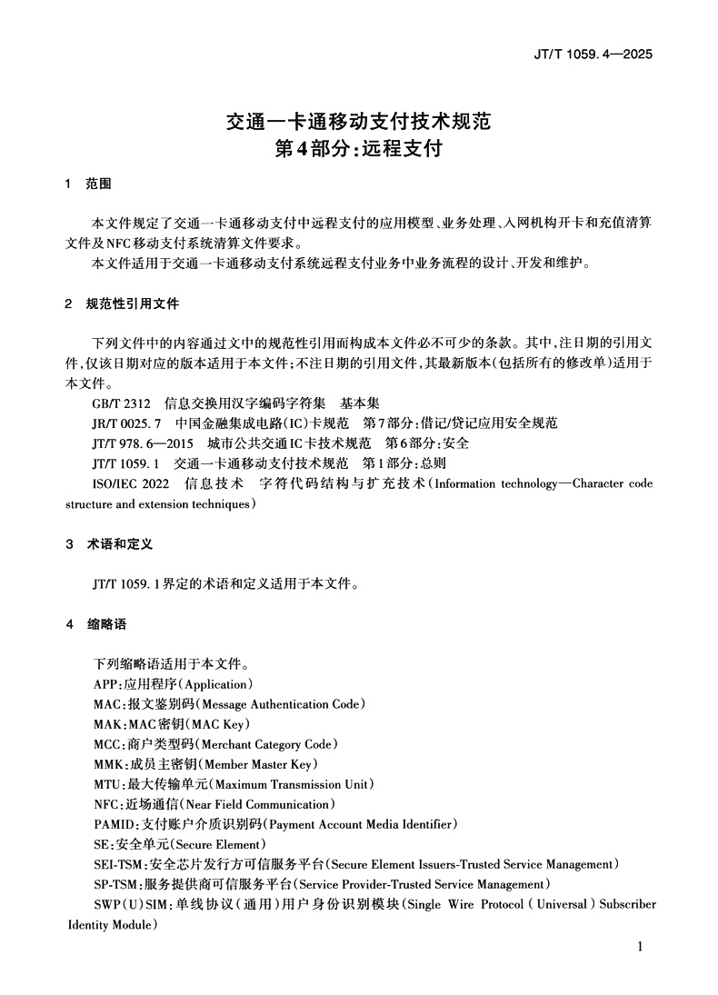 书名:交通一卡通移动支付技术规范 第4部分:远程支付(JT/T 1059.4—2025)