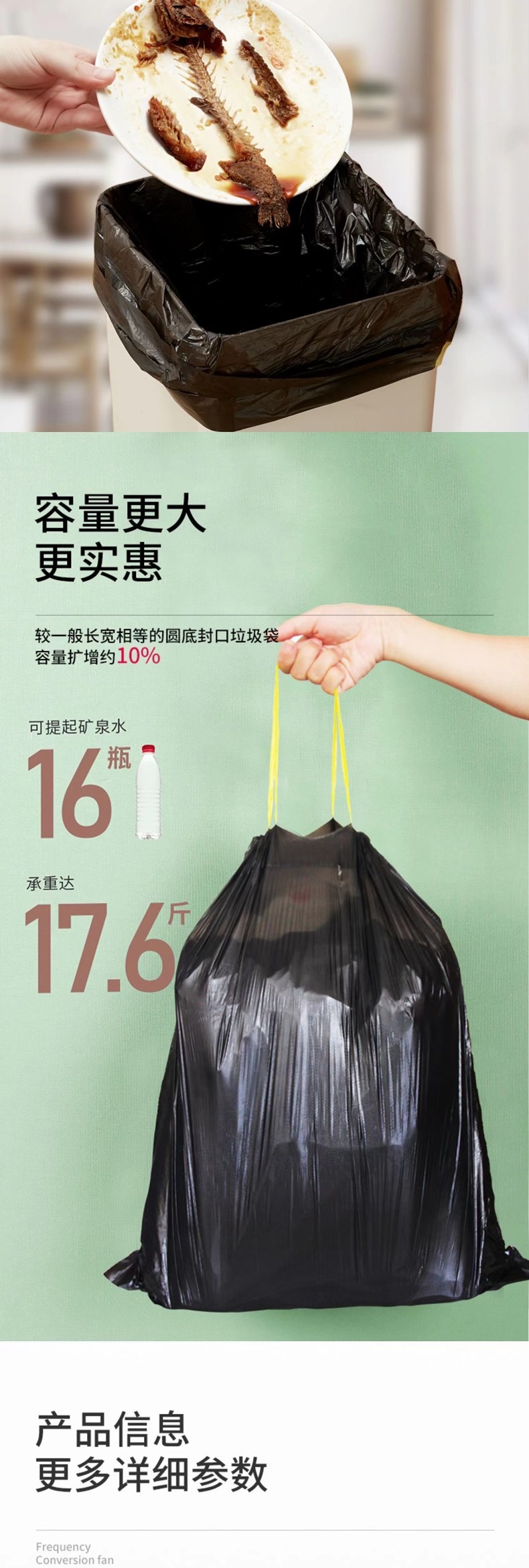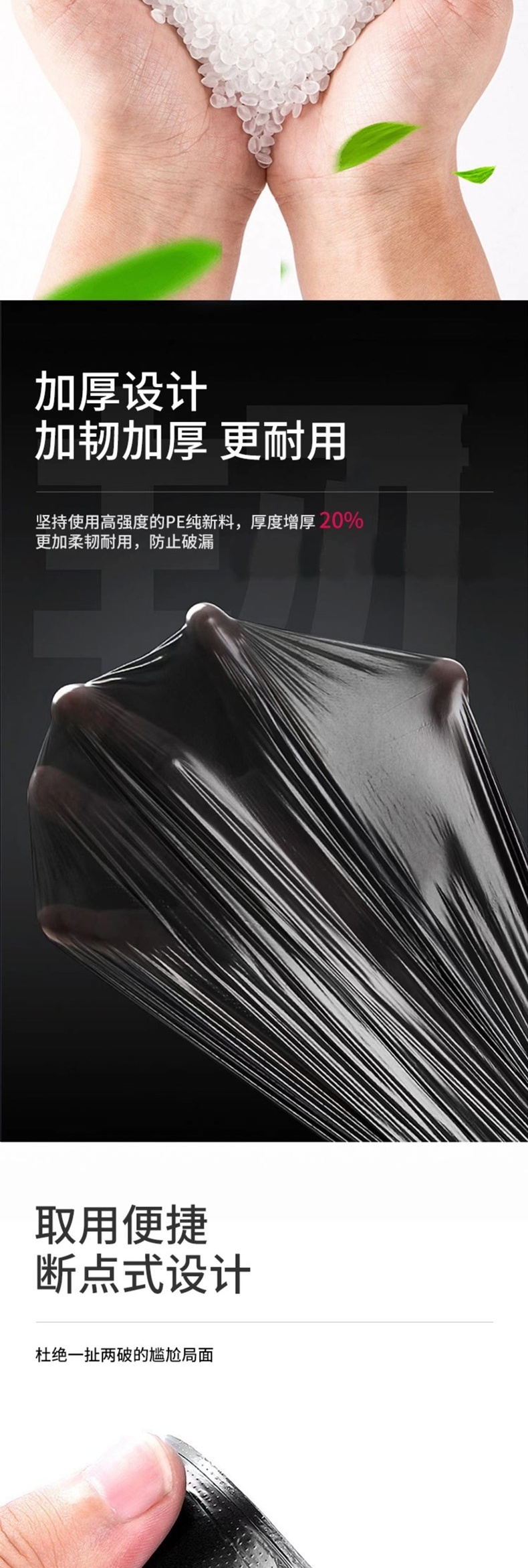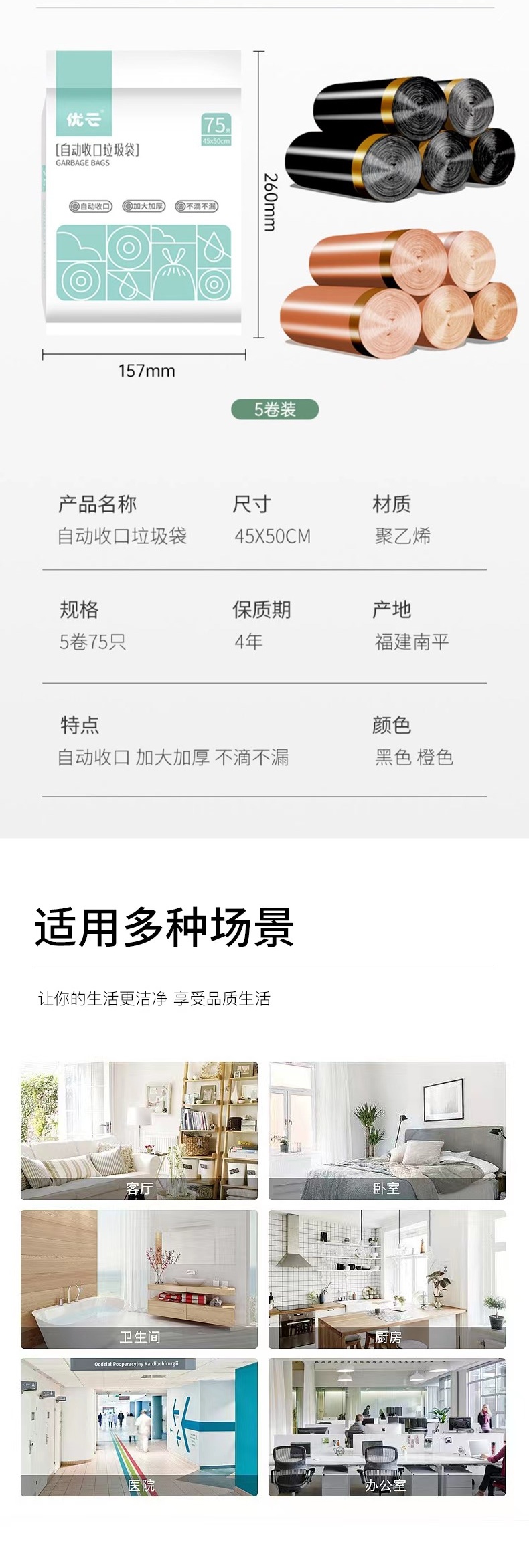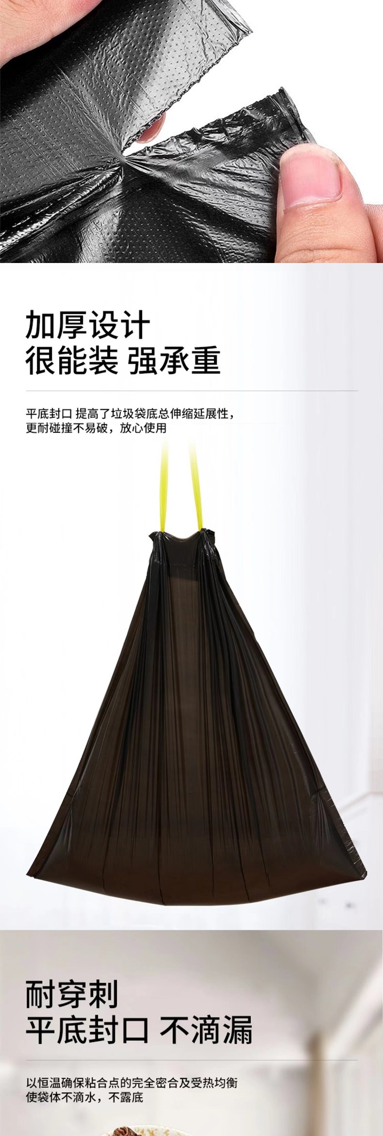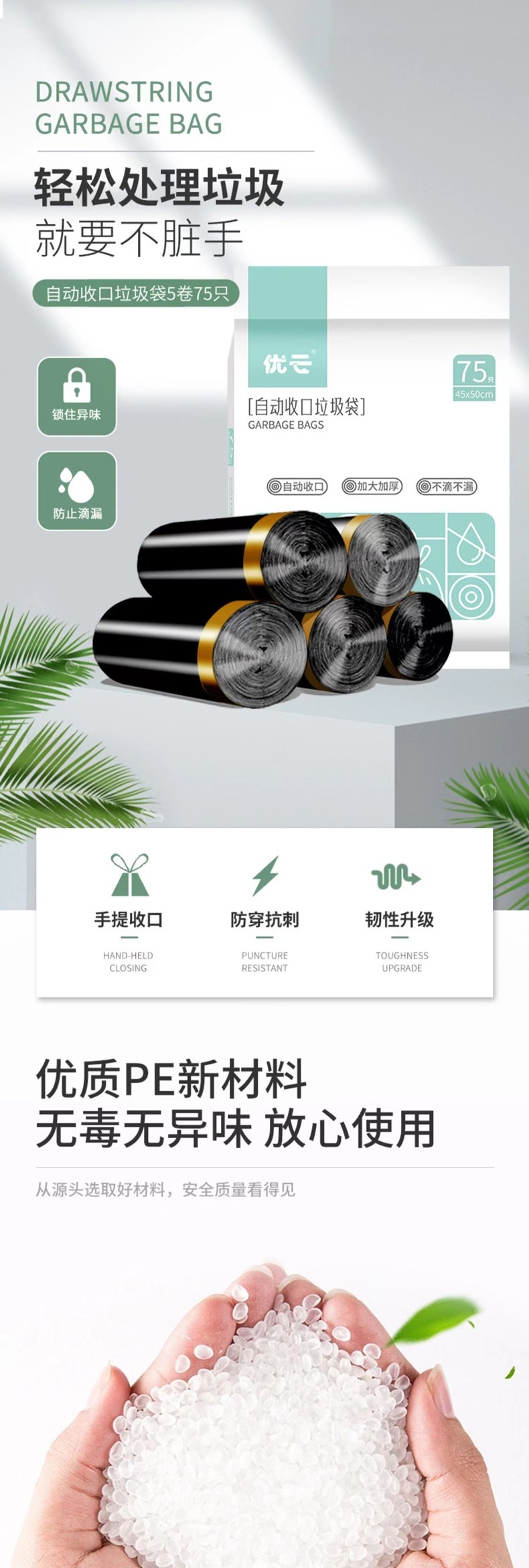 优云抽绳收口垃圾袋15只/卷*5卷 家用加厚手提式自动收口厨房厕所