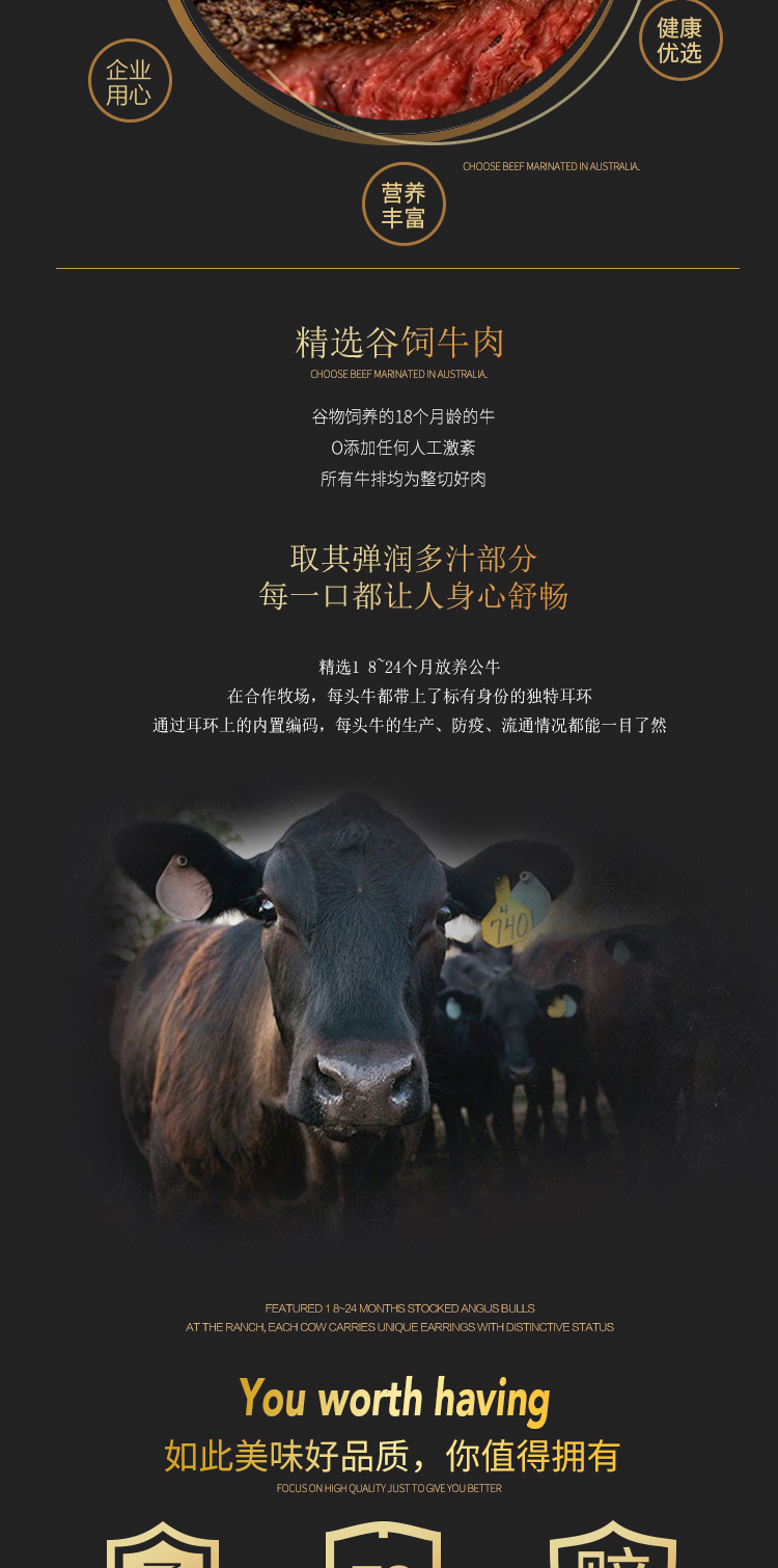 馈赠之选,品味之鉴。我们甄选全球优质牧场的谷饲牛肉,严格把控原切工艺,确保每一块都肌理细腻、油花丰盈。肉质呈现出浓郁的奶香与柔嫩多汁的卓越口感。无论是致敬重要客户,还是犒劳至亲家人,这份承载着诚意与品味的厚礼,都将让欢聚时刻,升华为一场难忘的味觉盛宴。