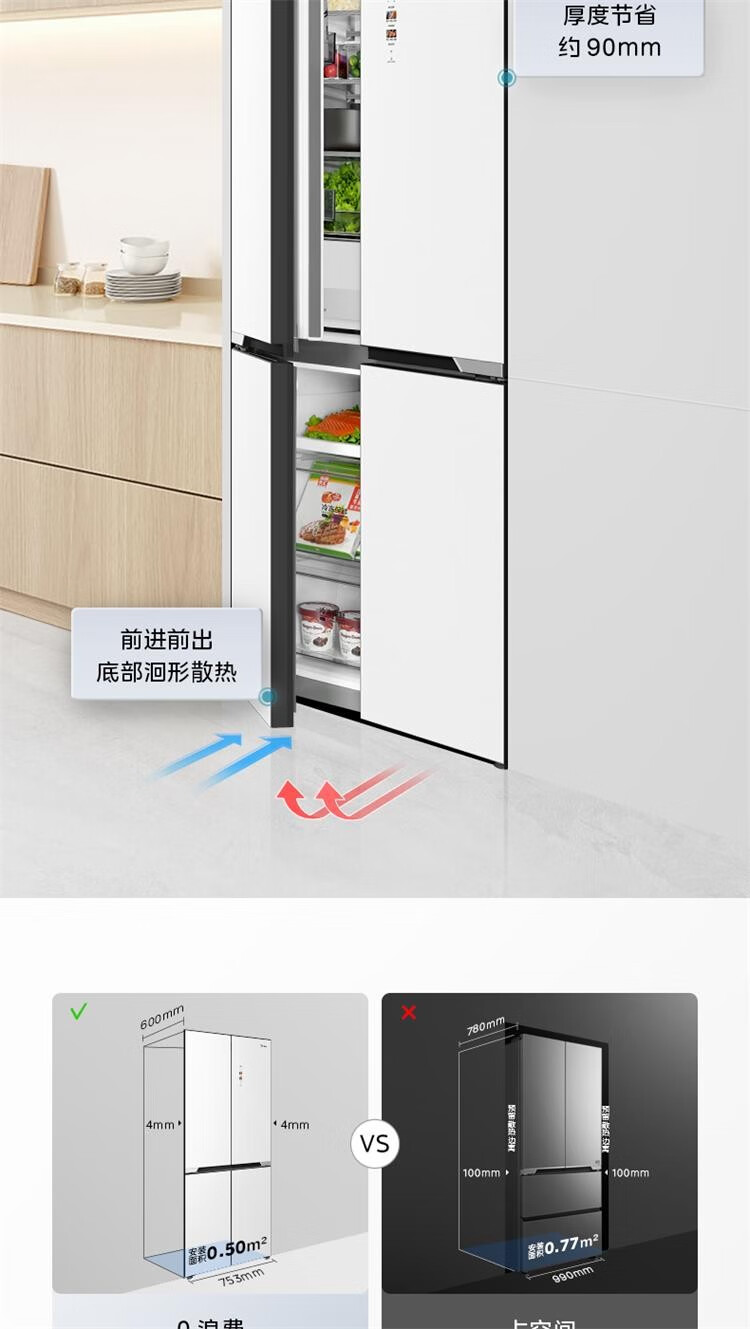 美的435升十字对开门冰箱超薄嵌入式底部散热PST智能净化钢化玻璃面板 BCD-435WUSGPZM凝光白/迷境灰