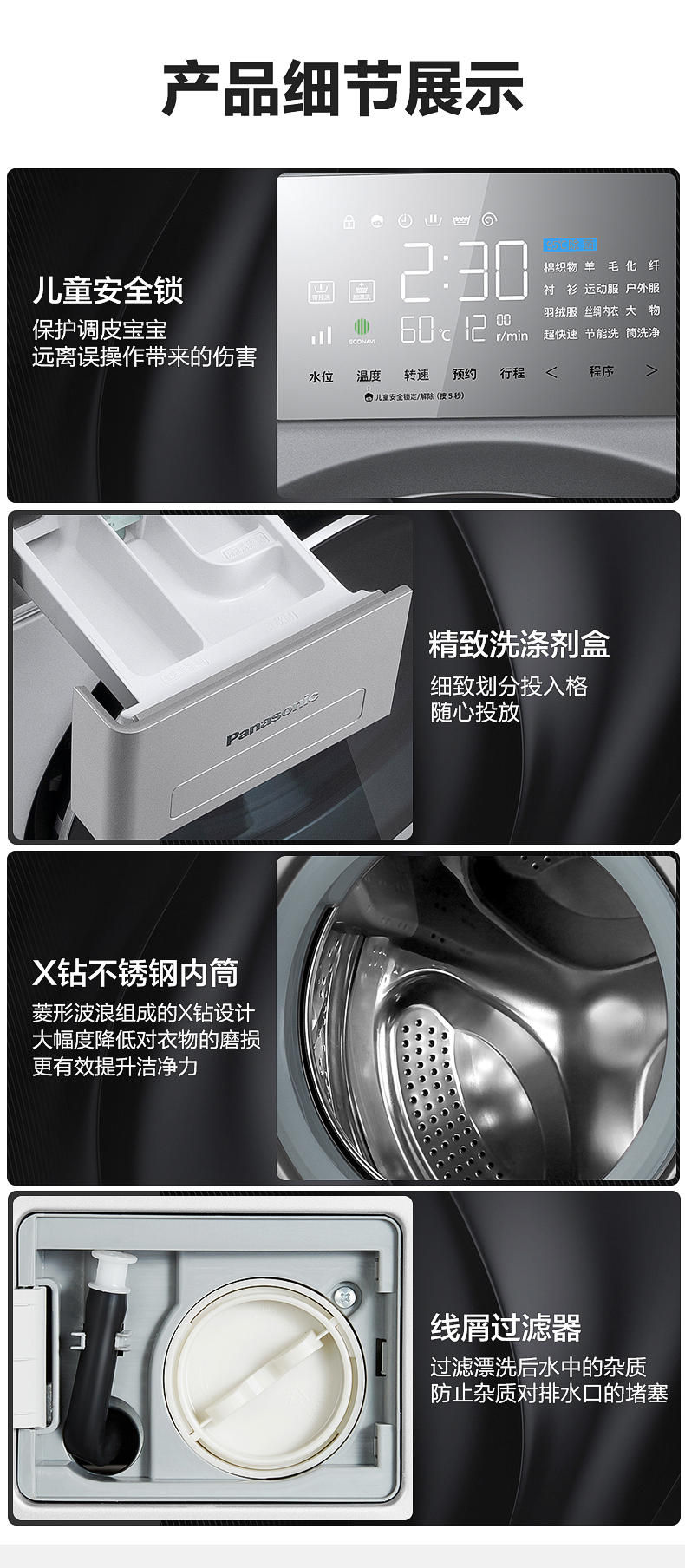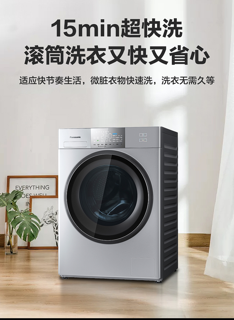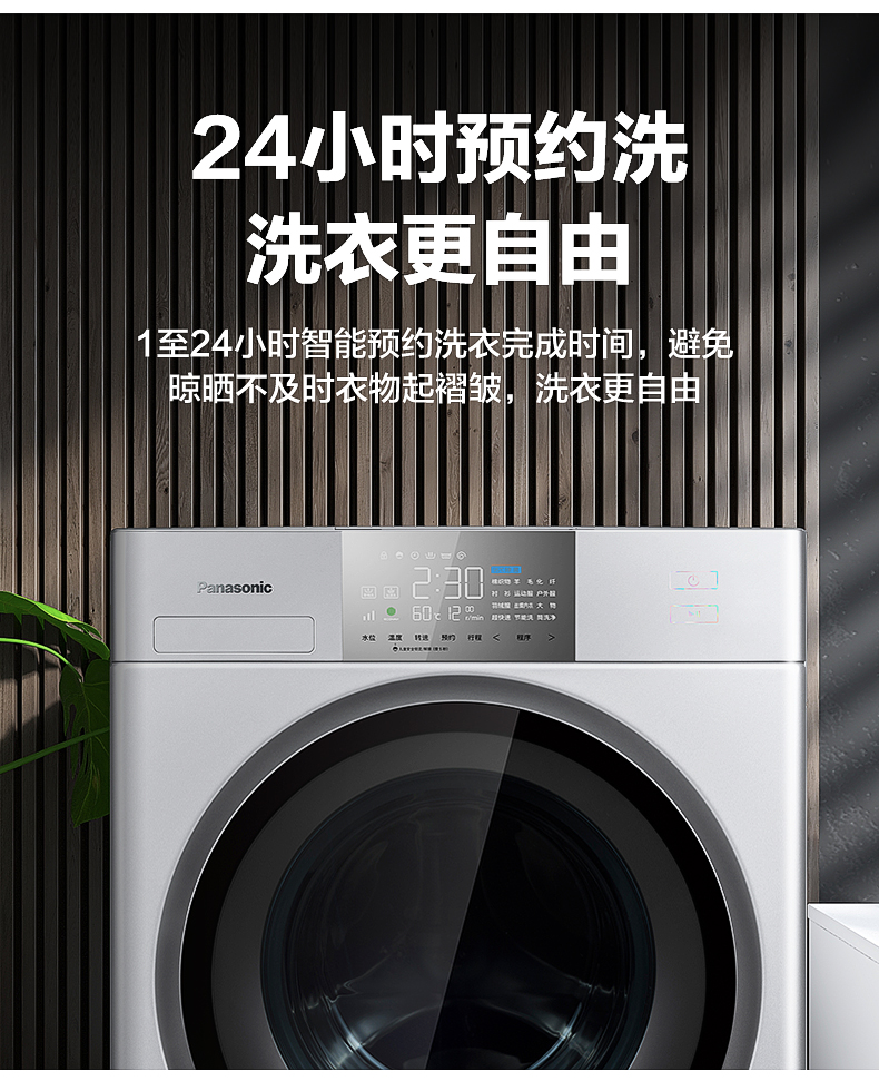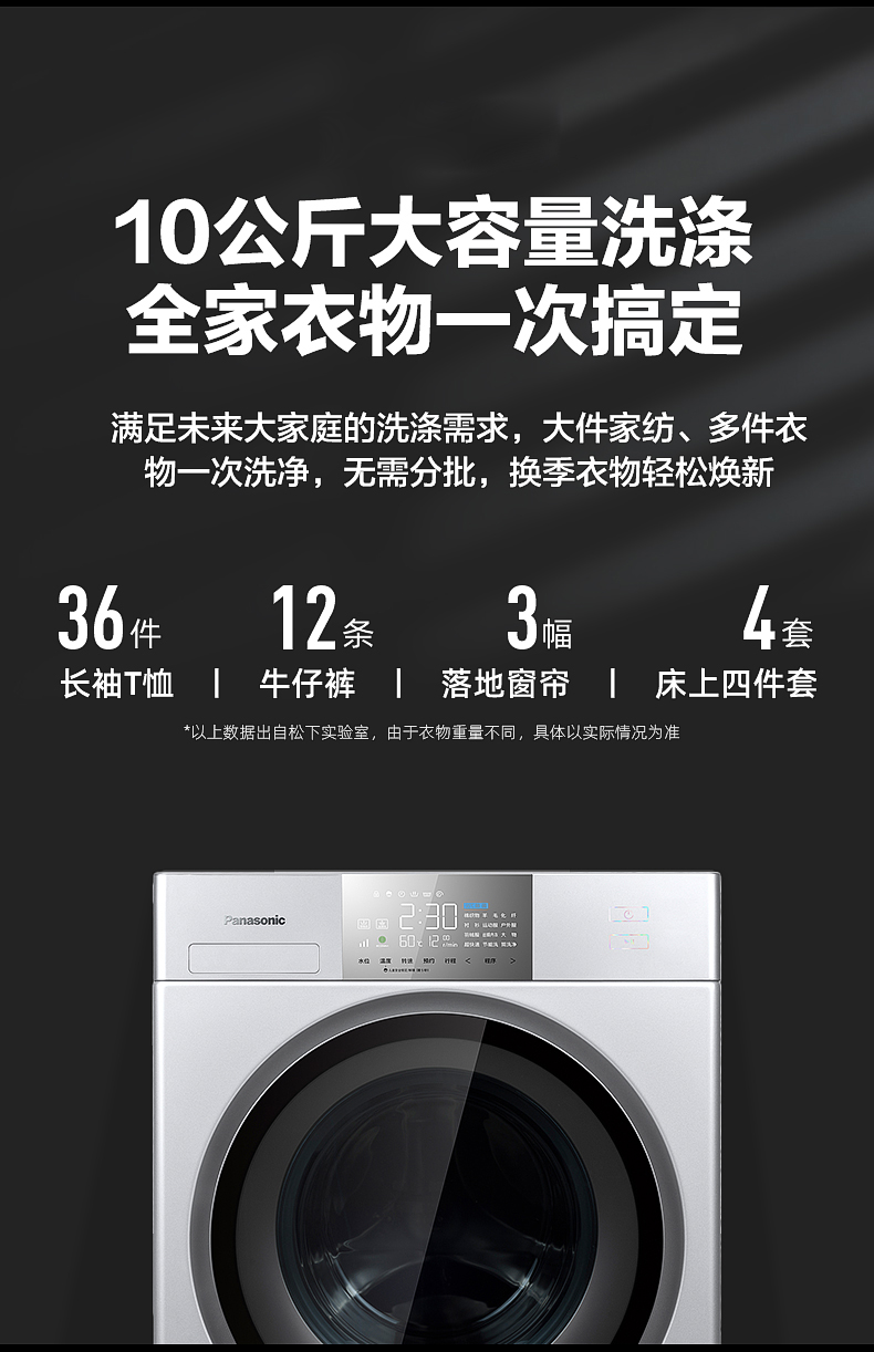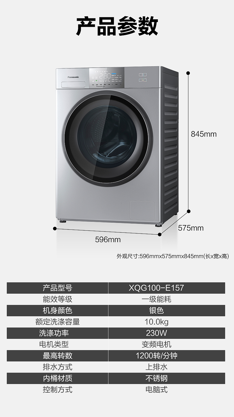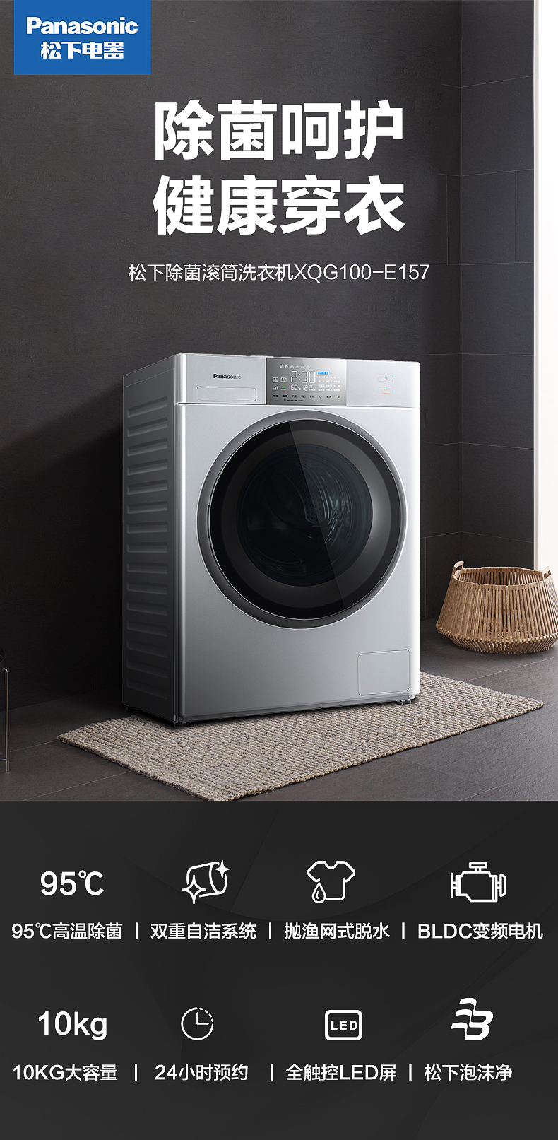 松下(Panasonic) 10公斤变频滚筒洗衣机 95度高温除菌 变频三维立体洗护 XQG100-E157