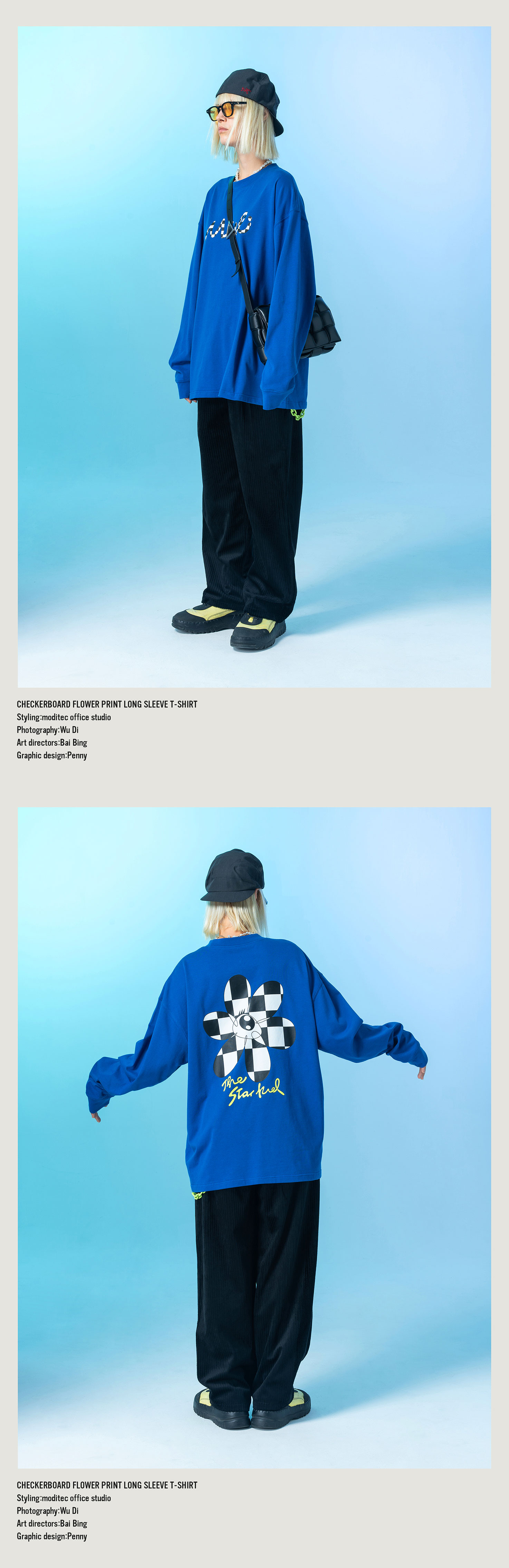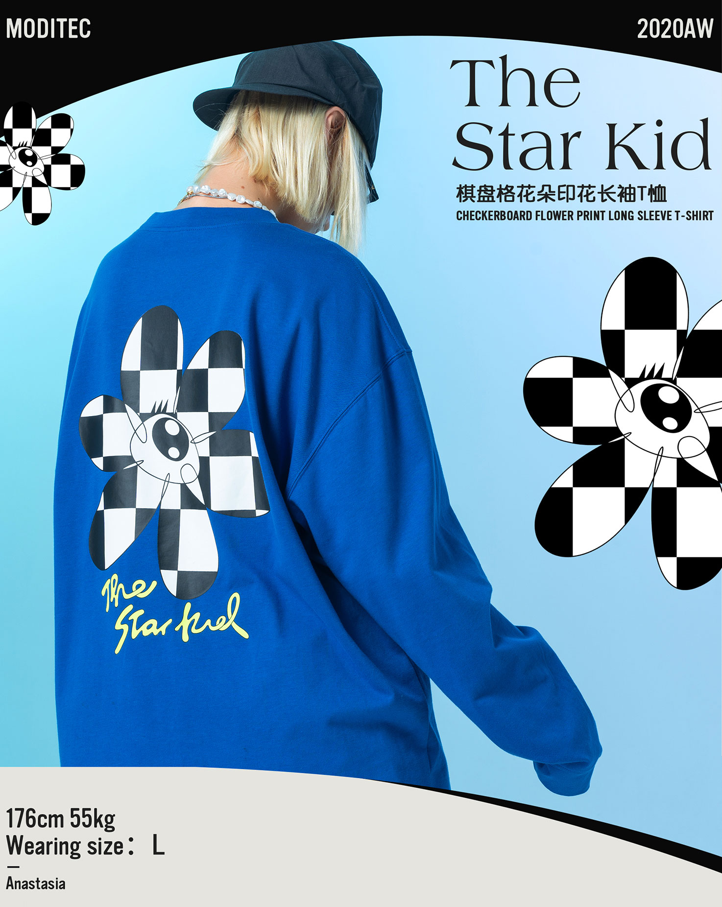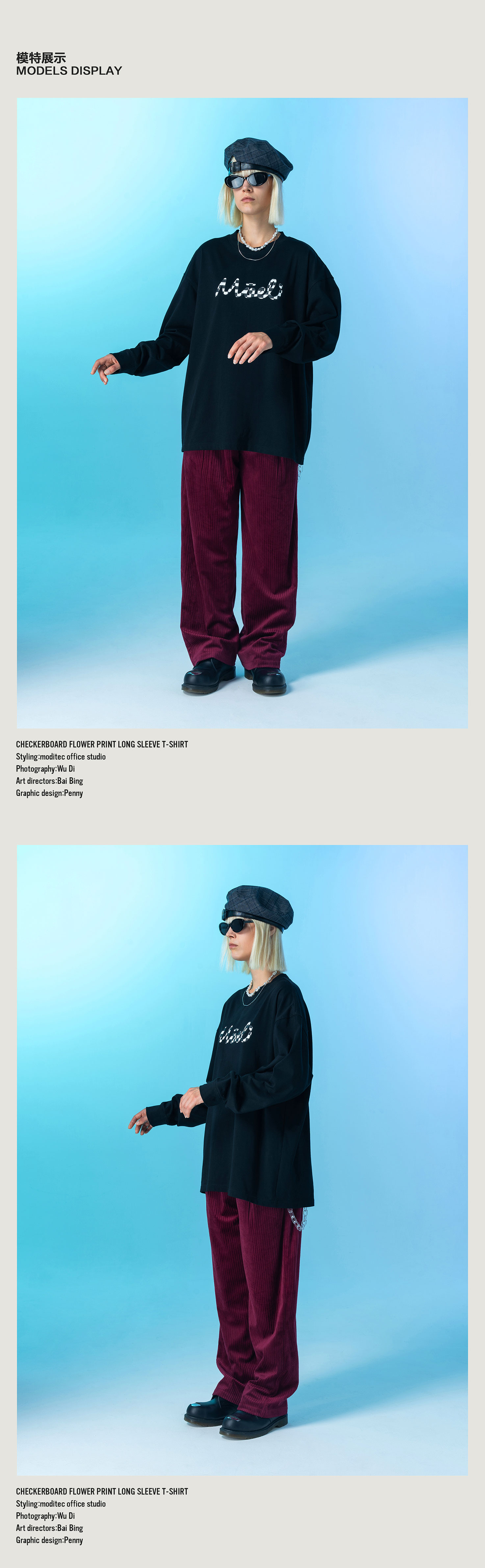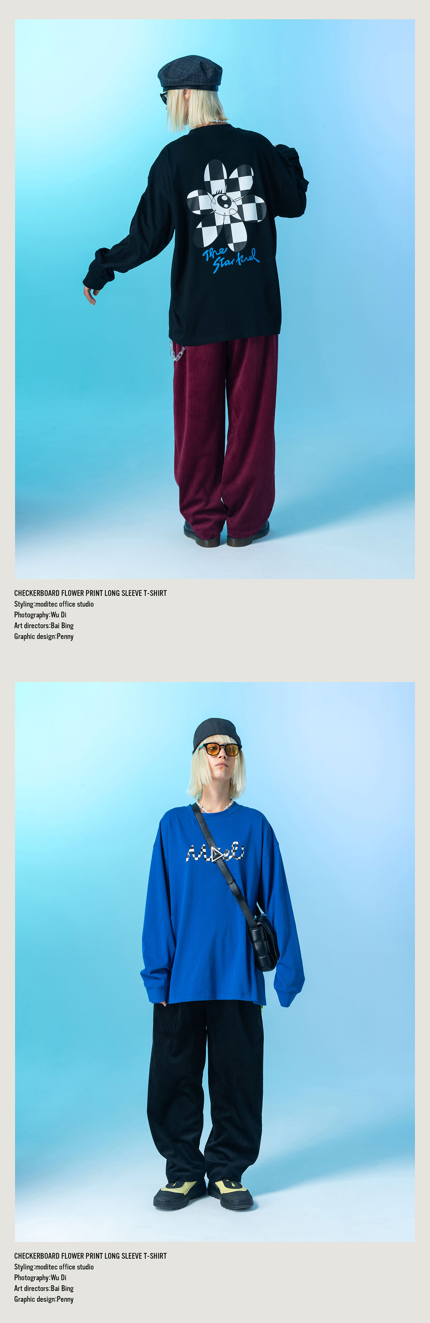 MODITEC 20FW 双色花朵棋盘格漫画长袖TEE 宽松薄款长袖 OVERSIZE