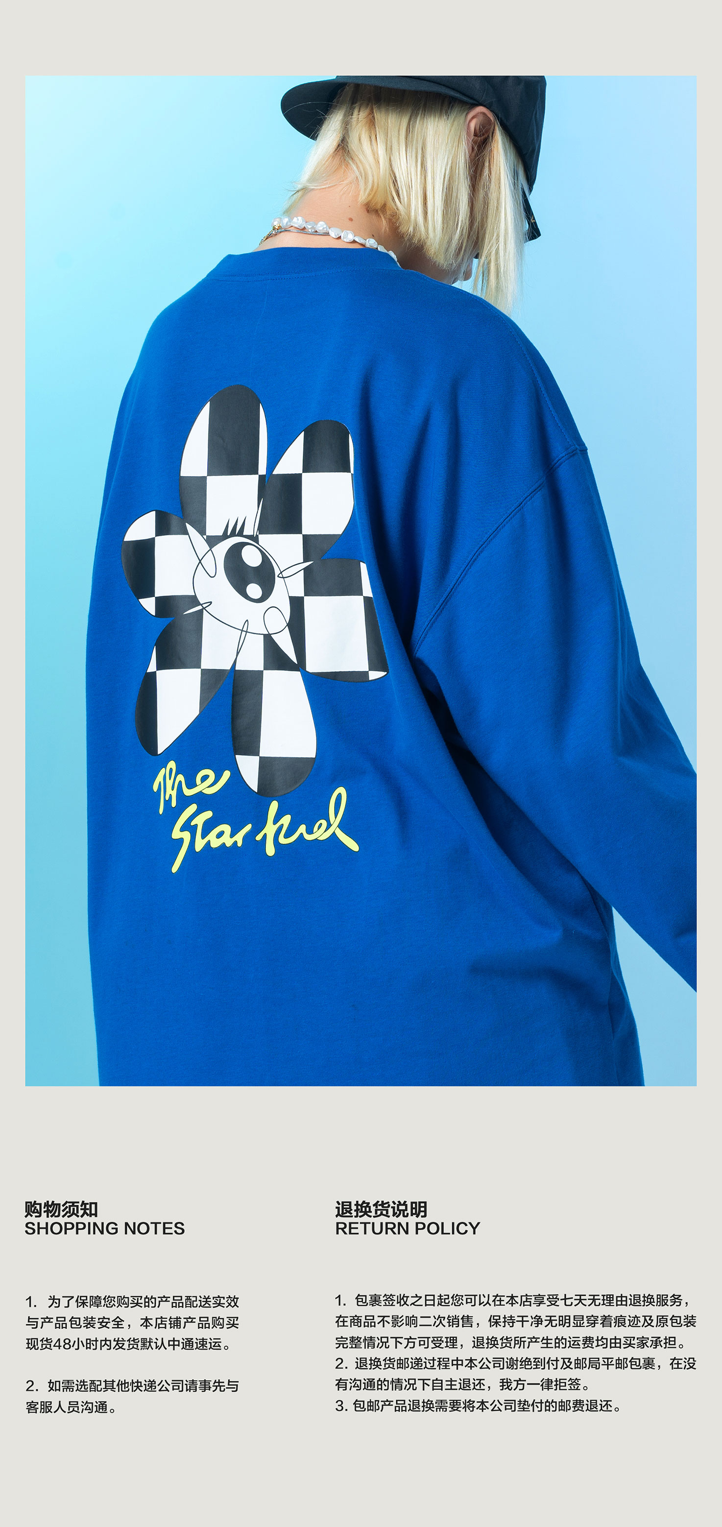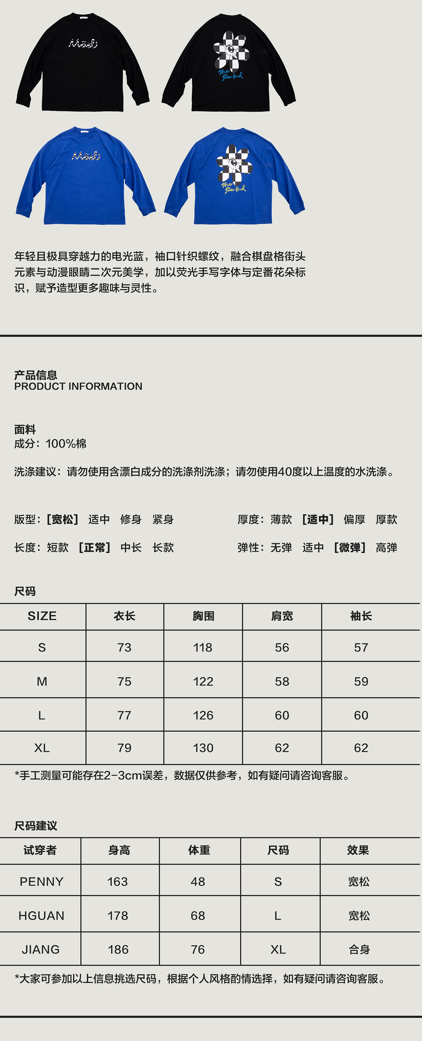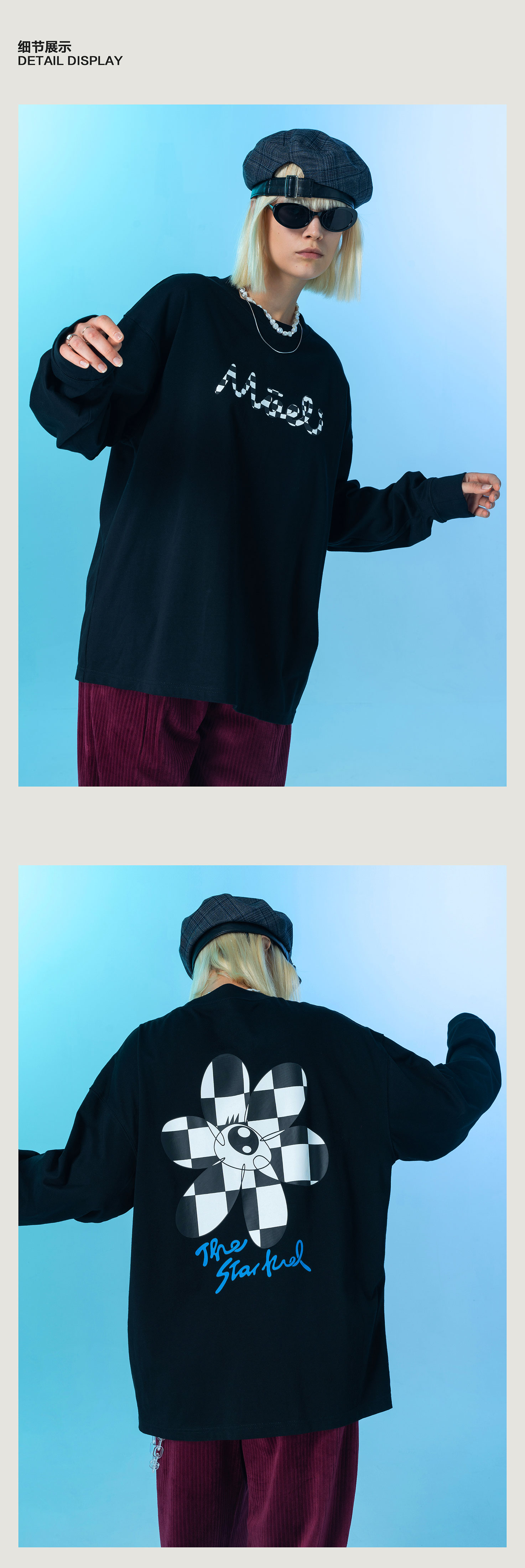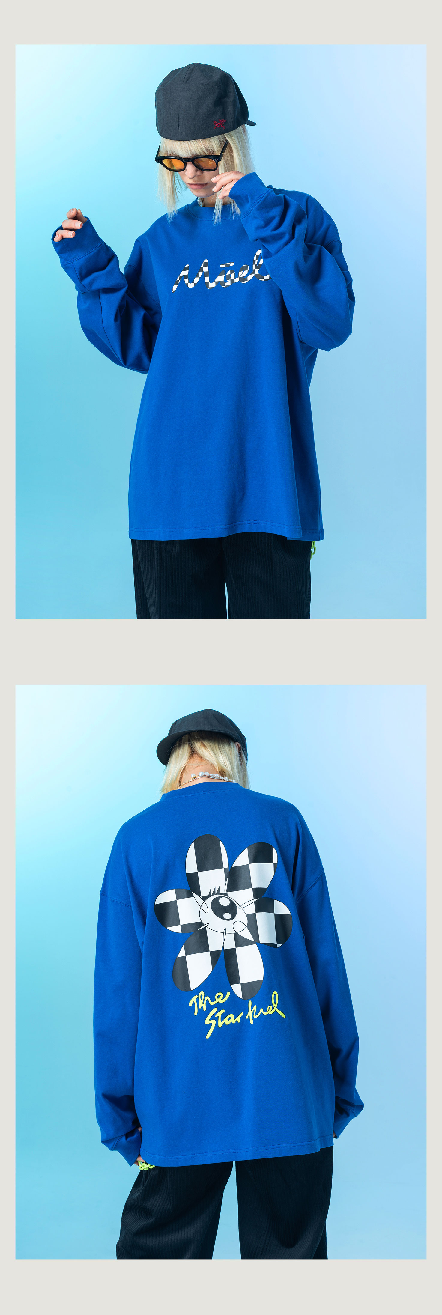 MODITEC 20FW 双色花朵棋盘格漫画长袖TEE 宽松薄款长袖 OVERSIZE