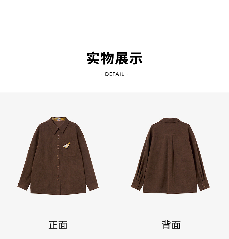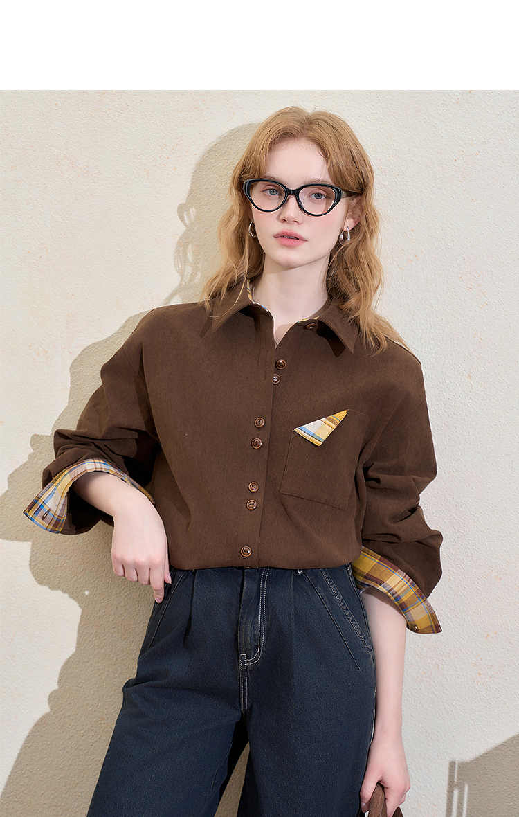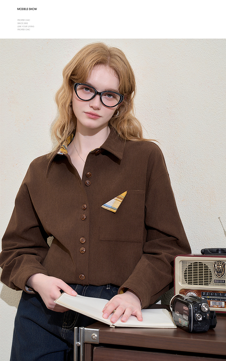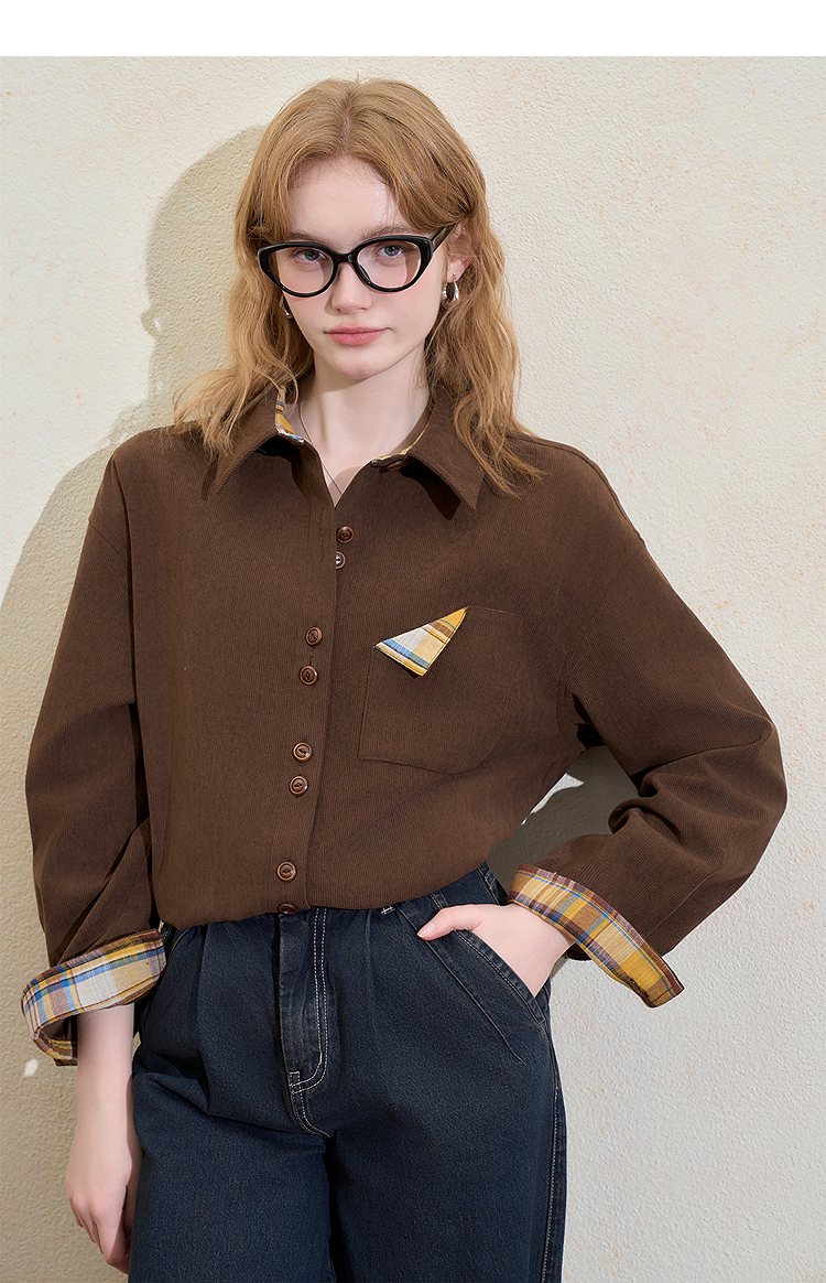 西遇复古灯芯绒衬衫女冬季新款格纹折角口袋设计宽松显瘦外套V3855312
