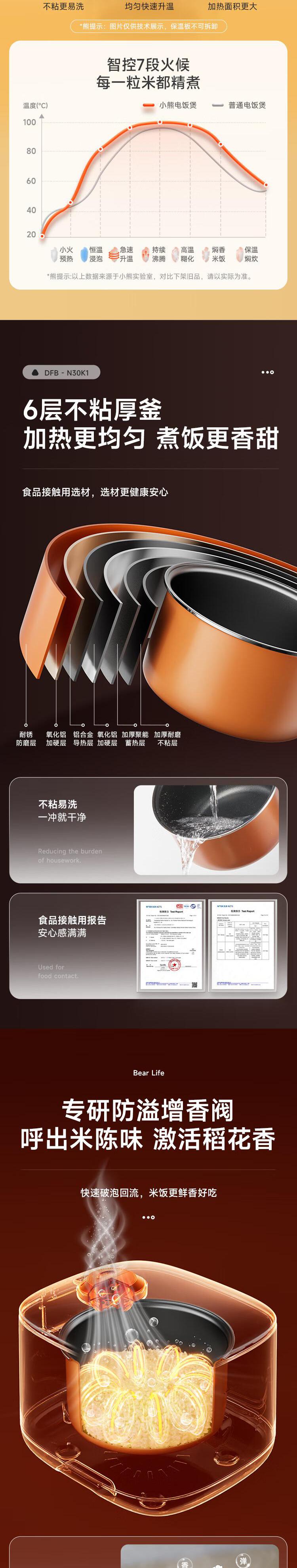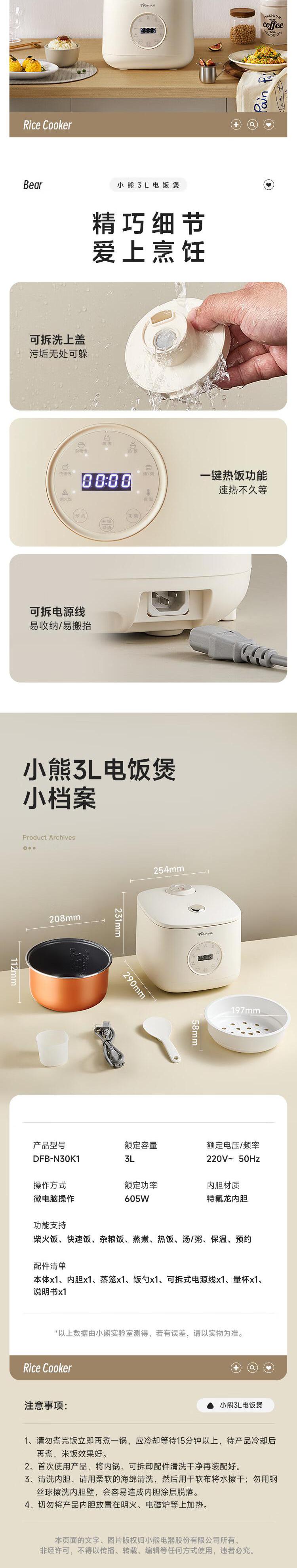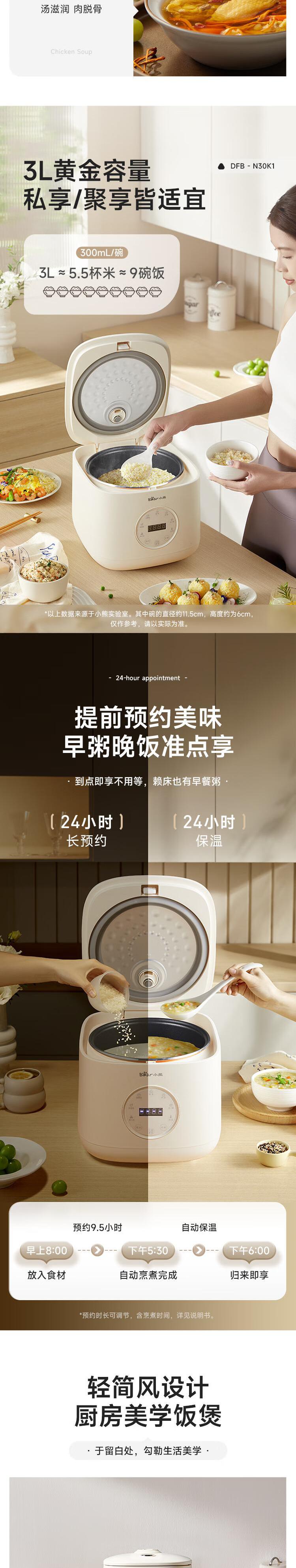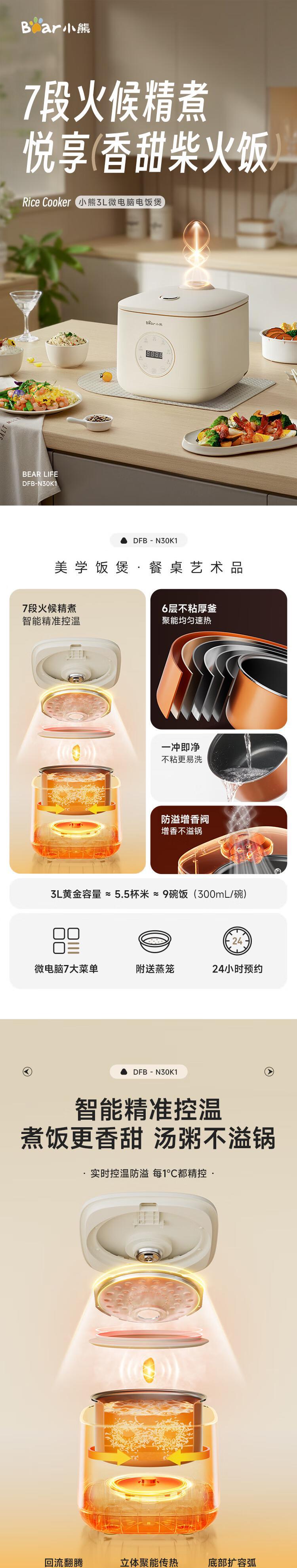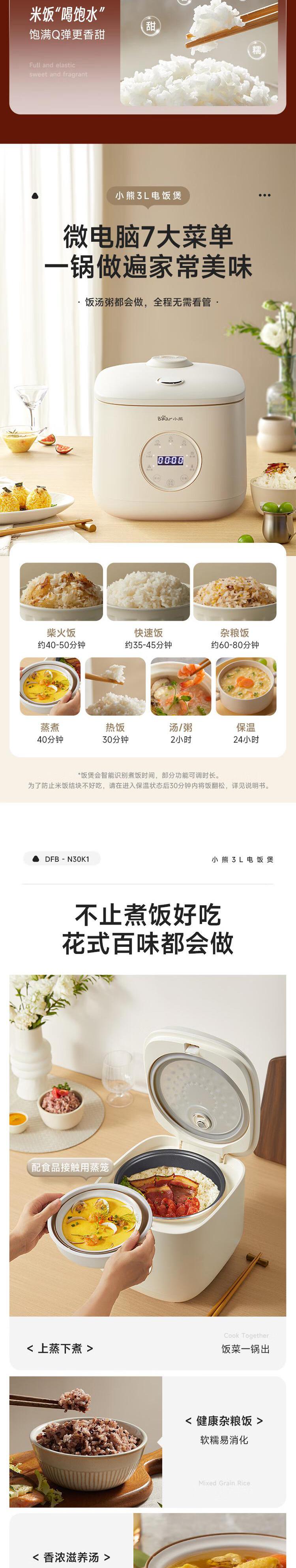 【自营】小熊(Bear)电饭煲 电饭锅3L家用3-4人快煮饭多功能预约定时电饭锅送蒸笼 3L DFB-N30K1不粘厚釜智能菜单上蒸下煮省时省电
