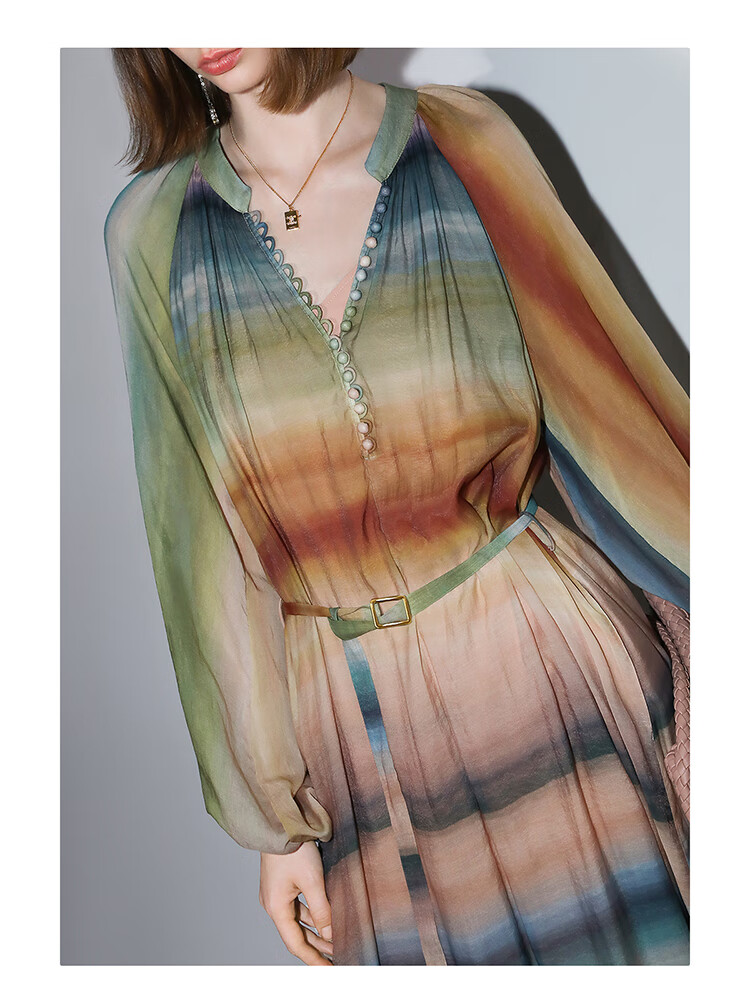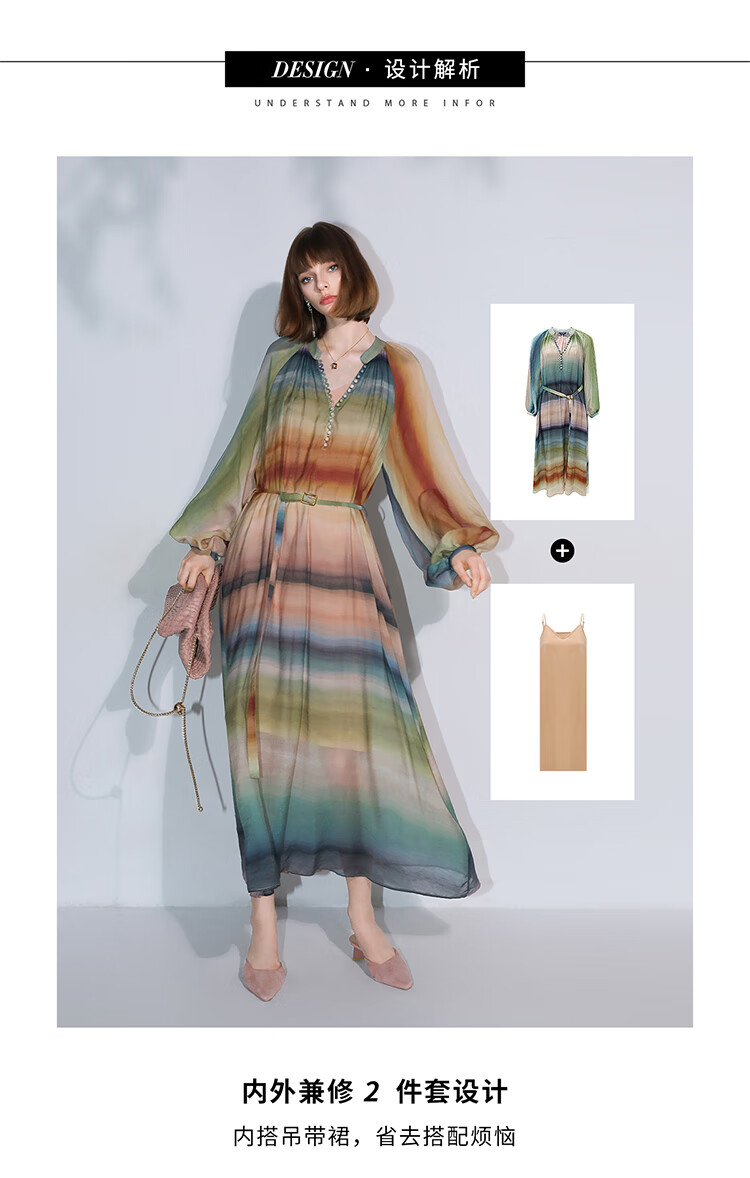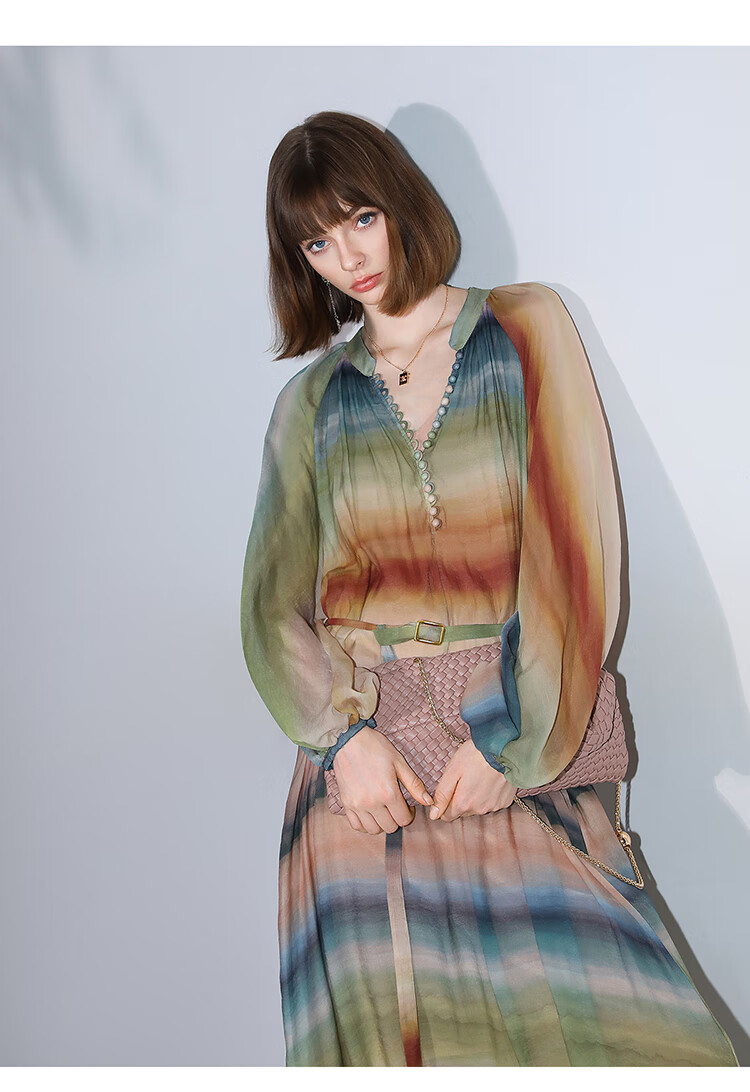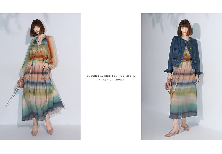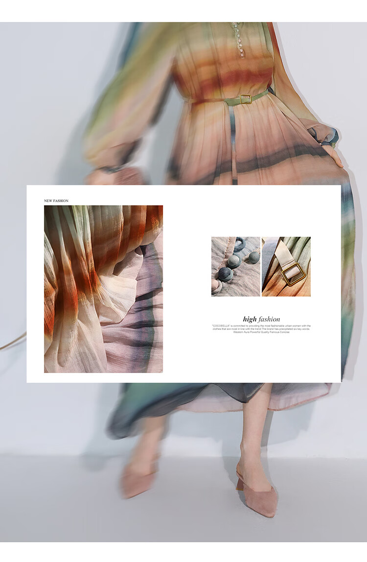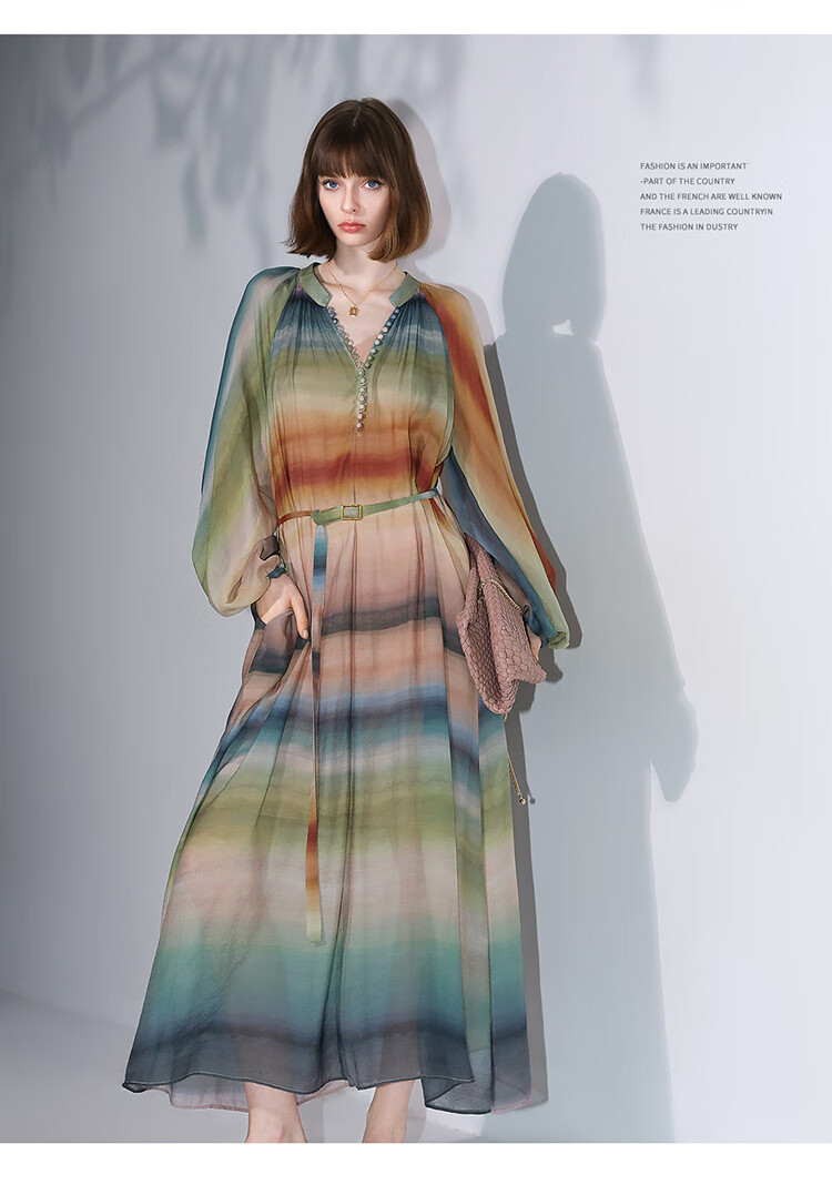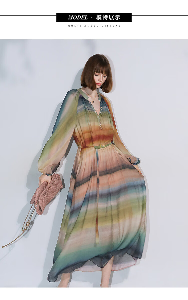 【限时秒杀】COCOBELLA[赤霞橘光]手绘彩虹条纹飘逸长袖连衣裙套装FR7045