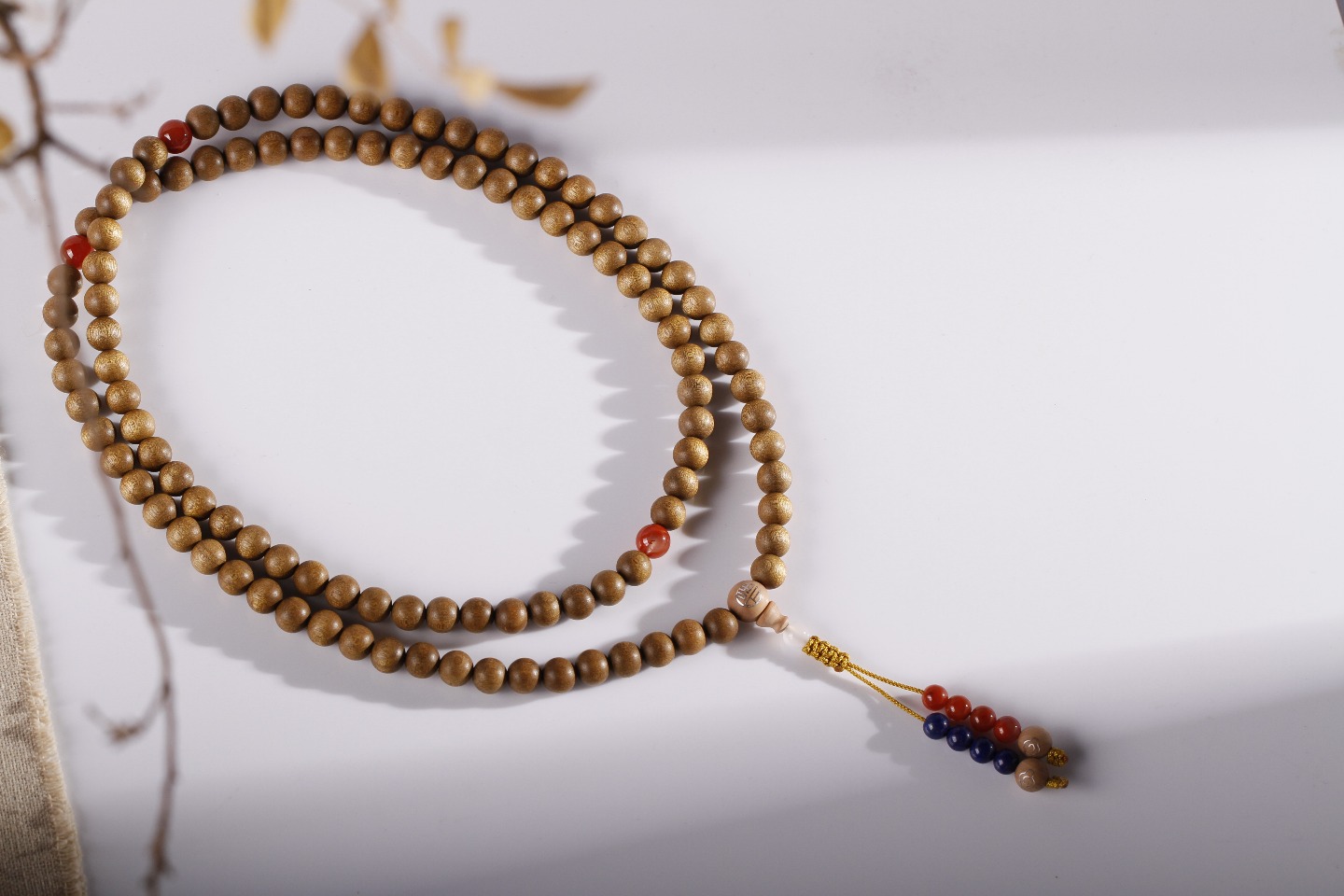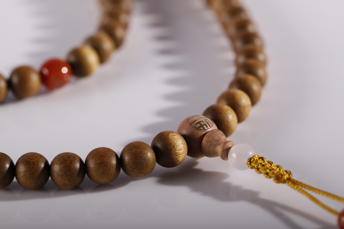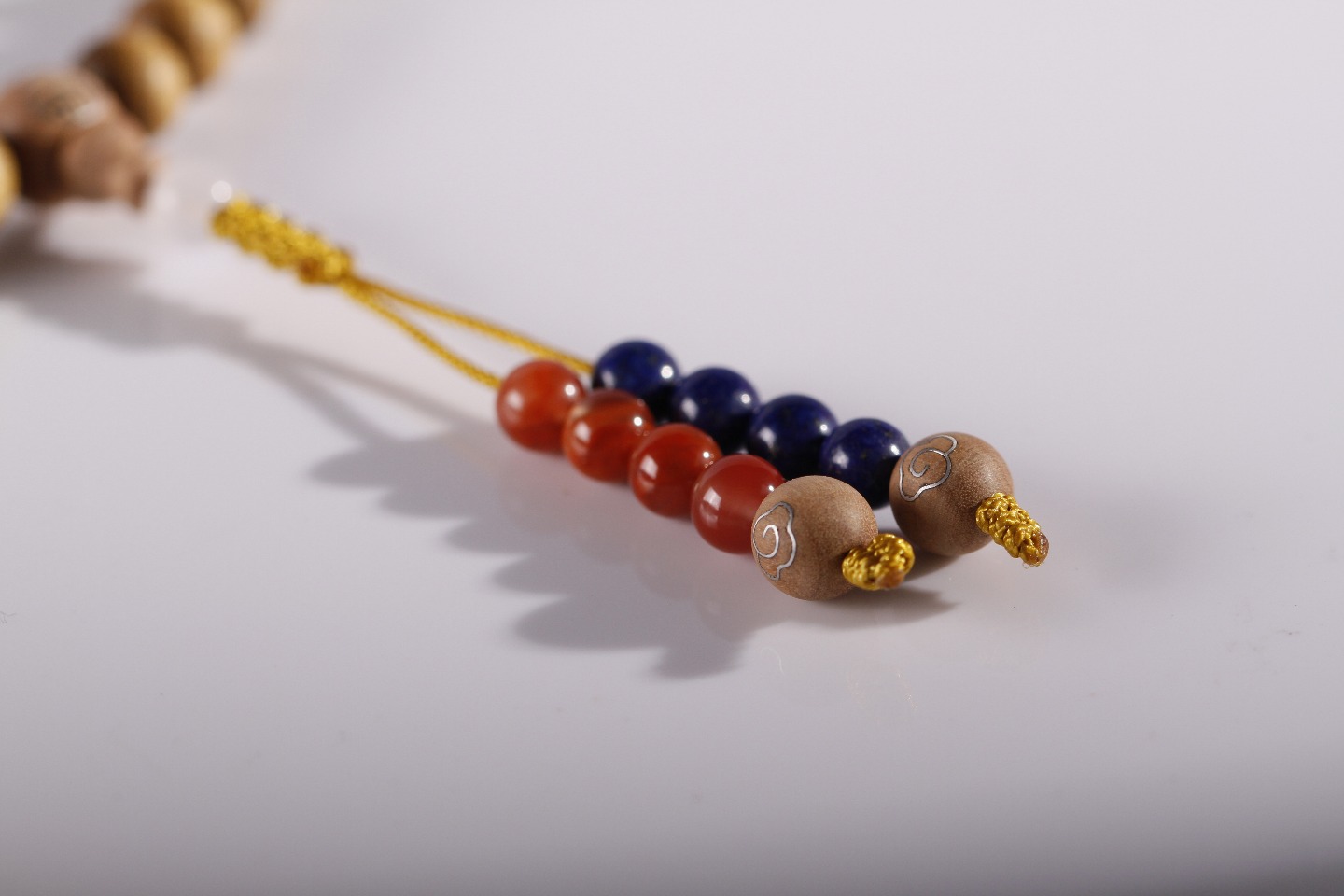 搭配:拆房老料金丝楠木为主,搭配青金、凉山南红、玛瑙、老山檀香镶银“福”字母珠及“祥云”子弟珠