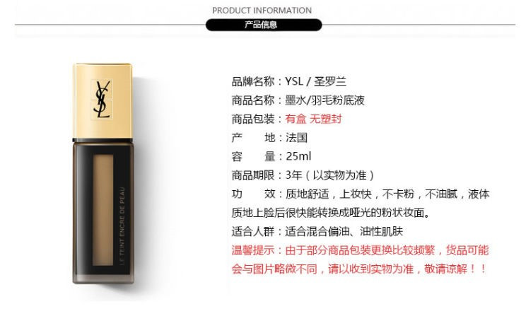 YSL圣罗兰 哑光羽毛粉底液 方管 BR20 25ML 法国