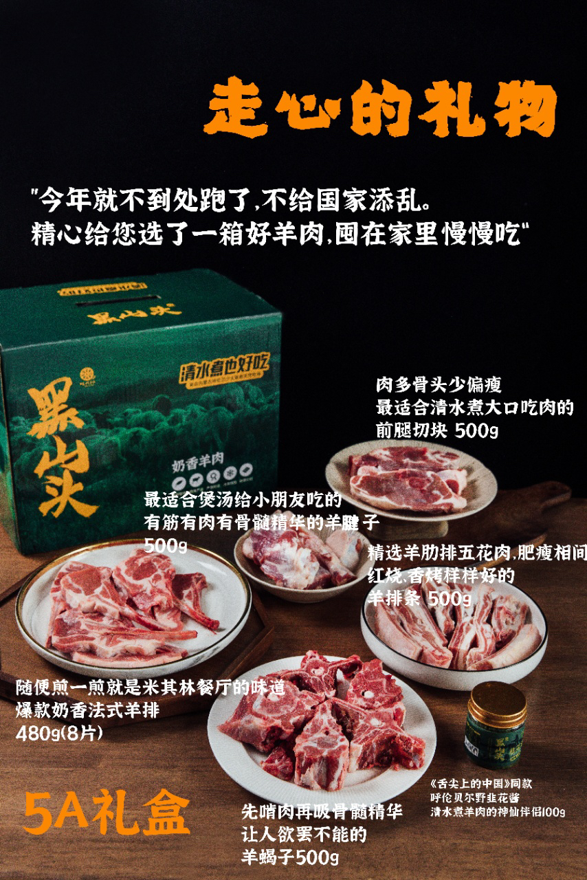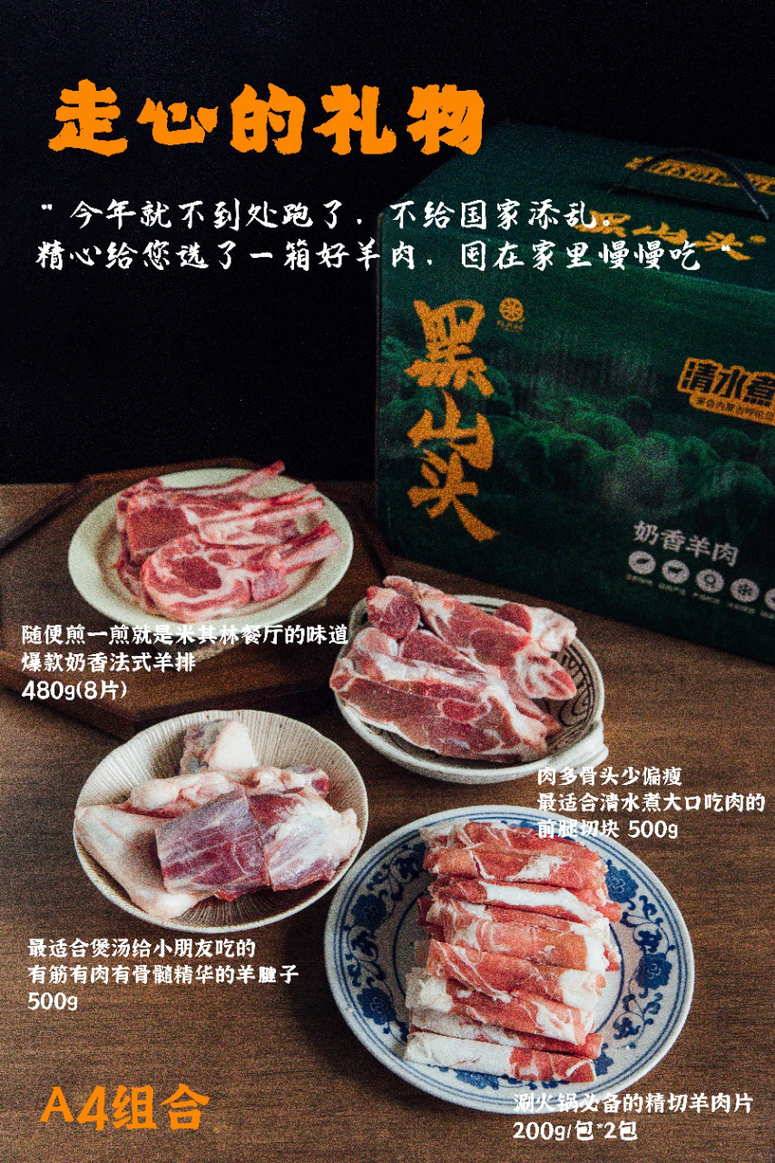 套餐A:法式羊排480g*1+精切羊肉片200g*2+前腿切块500g*1+羊腱子500g*1