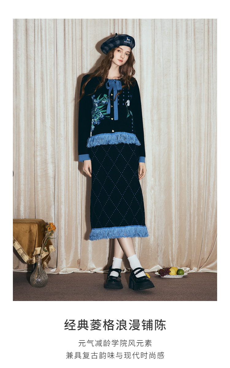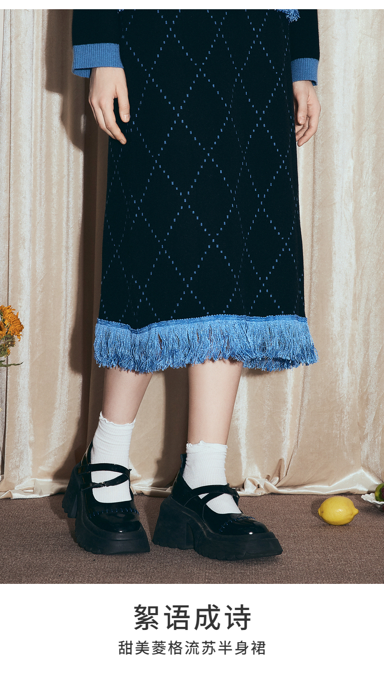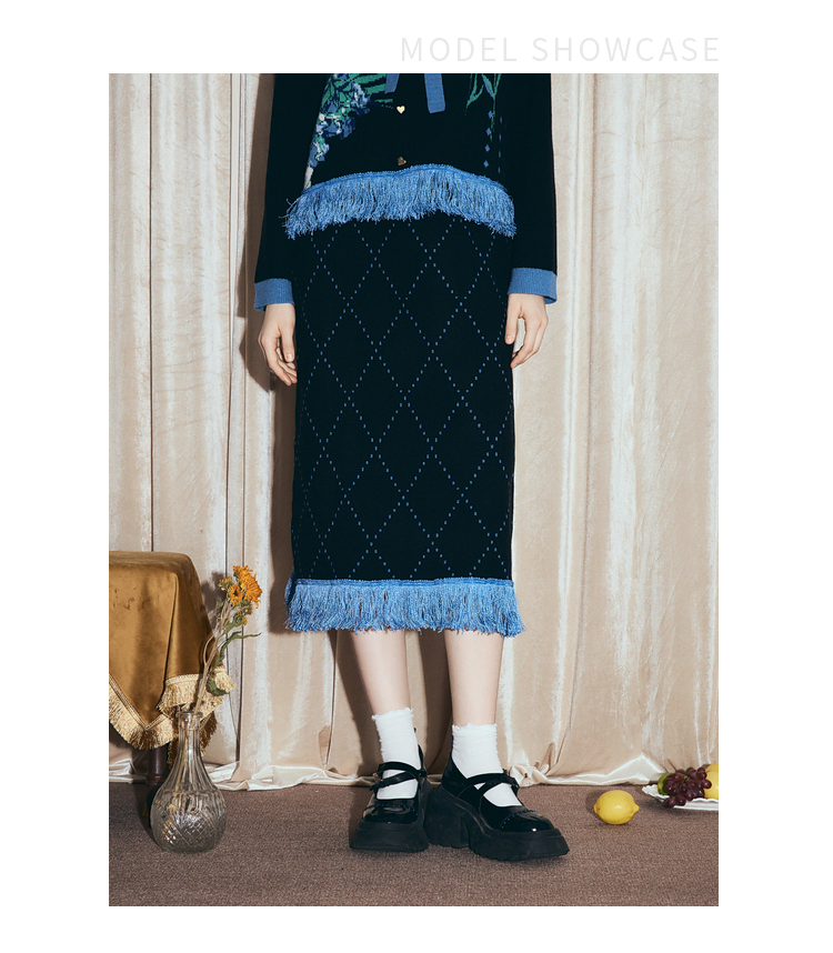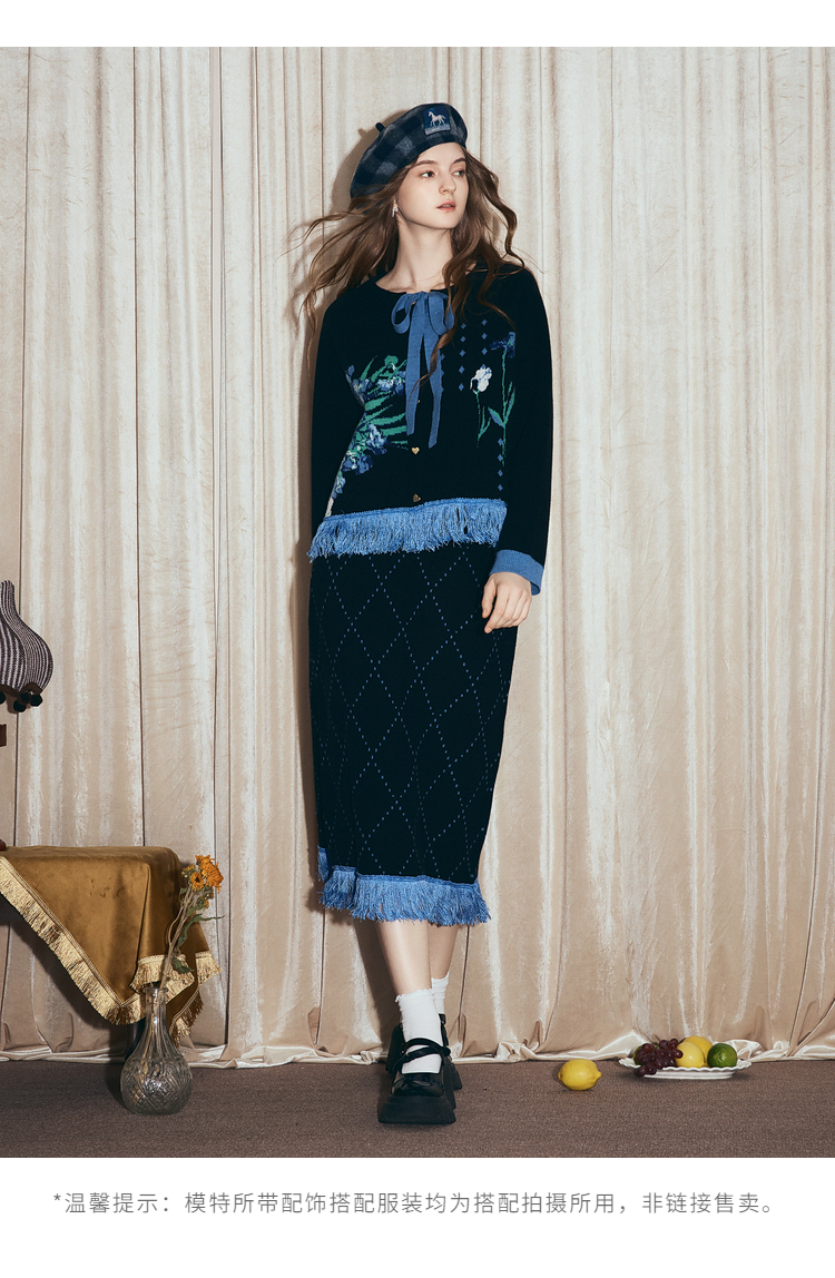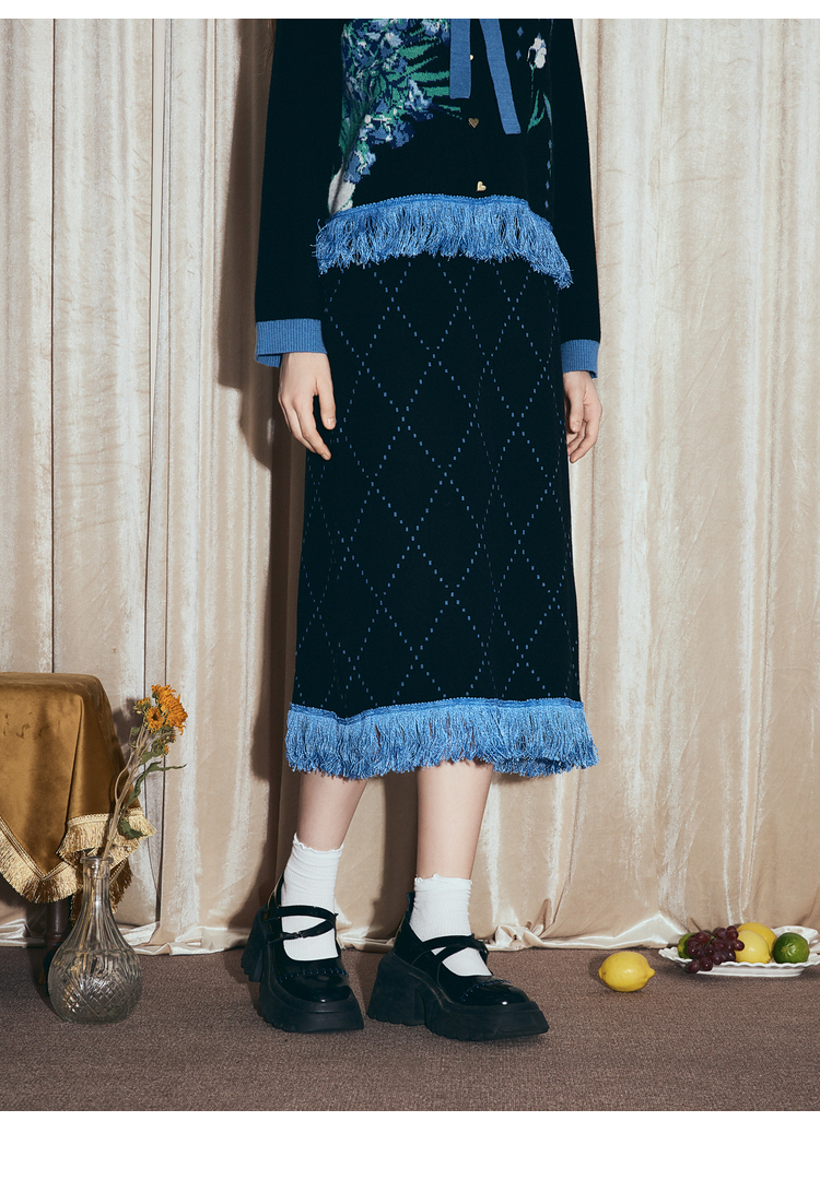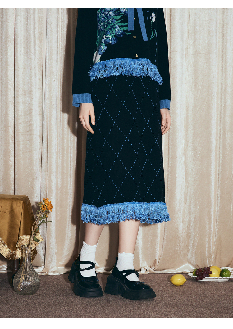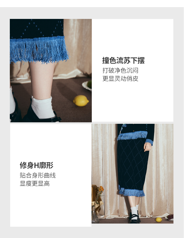 两三事梵高文艺 絮语成诗 2025冬季新款撞色流苏下摆针织半身裙