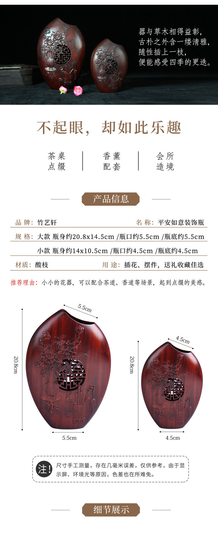 作品《平安如意》镂空装饰瓶选材上等非洲酸枝。此瓶扁圆腹,椭圆形圈足,腹部刻有吉祥图纹,两侧镂空雕刻“团禄”字窗花,并以富贵牡丹相互依衬,如意等吉祥图纹简洁明朗,寓意福禄,吉祥平安富贵。