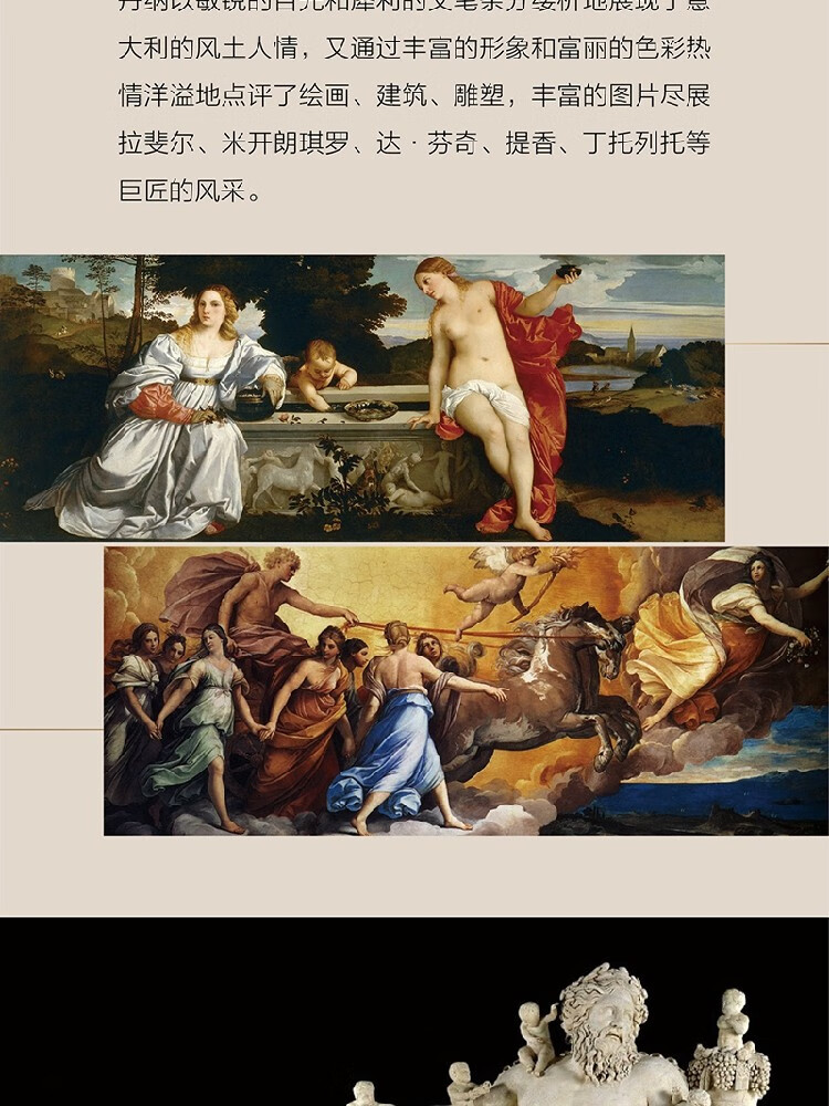 《意大利游记》是一次文明之旅,也是一场艺术巡礼,充满了即兴发挥的奇思妙想,更不乏一针见血的深刻洞见。如丹纳所说,要了解一件艺术品、一个艺术家、一群艺术家,必须正确地设想他们所属时代的精神风貌和风俗概况。因此,他以敏锐的目光和犀利的文笔条分缕析地剖析了意大利的社会、历史、民族,又通过丰富的形象和富丽的色彩热情洋溢地点评了绘画、建筑、雕塑。丹纳的博学多才、远见卓识在此大放异彩,在妙语连珠中尽展意大利文艺复兴巨匠的风采。