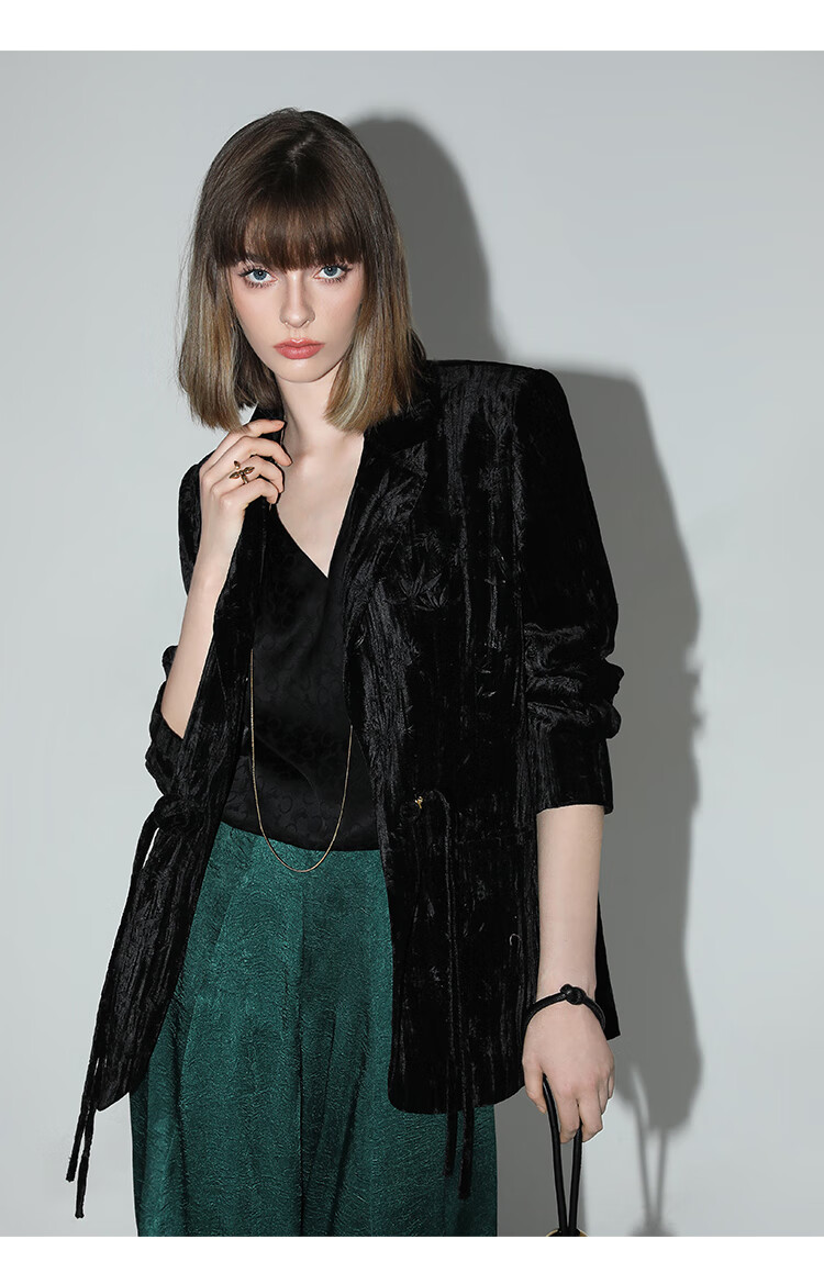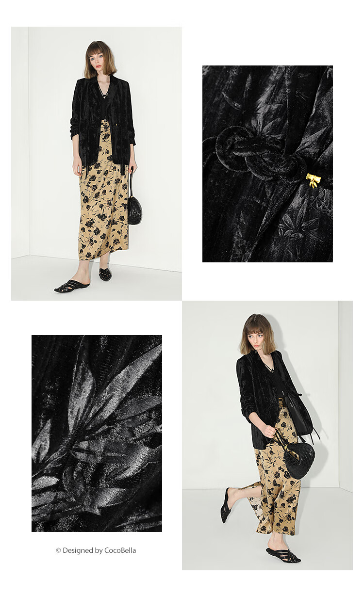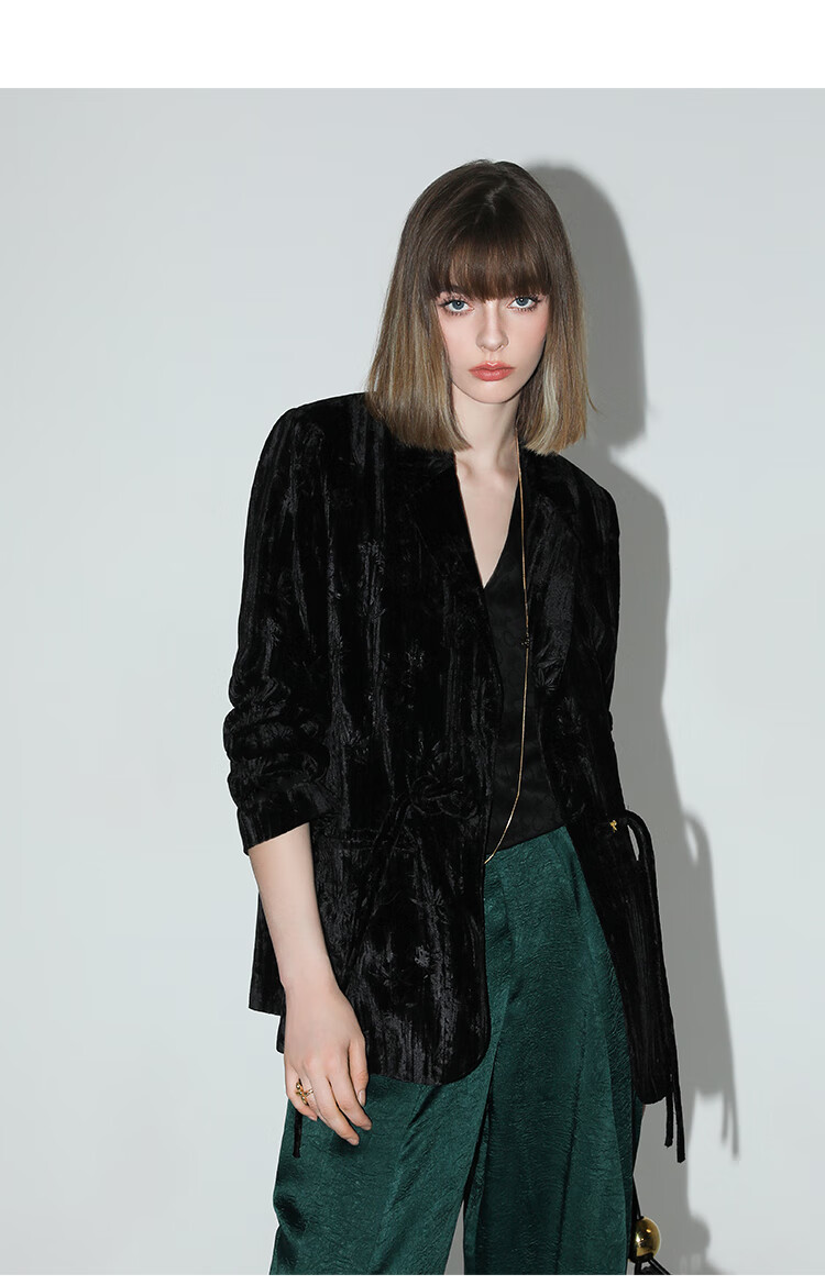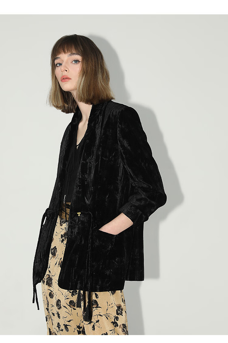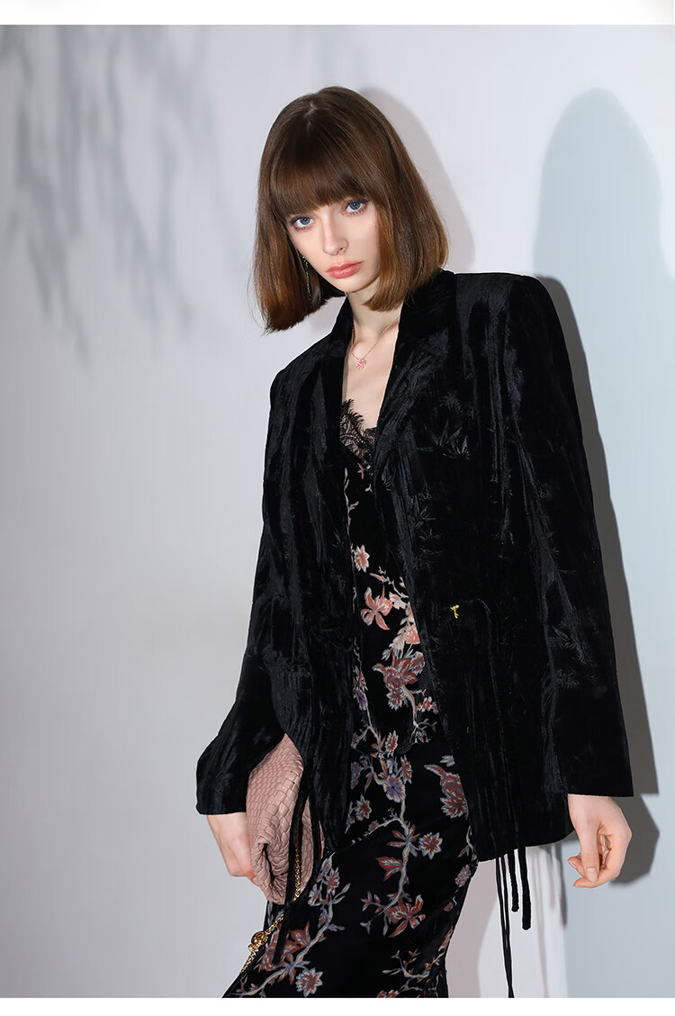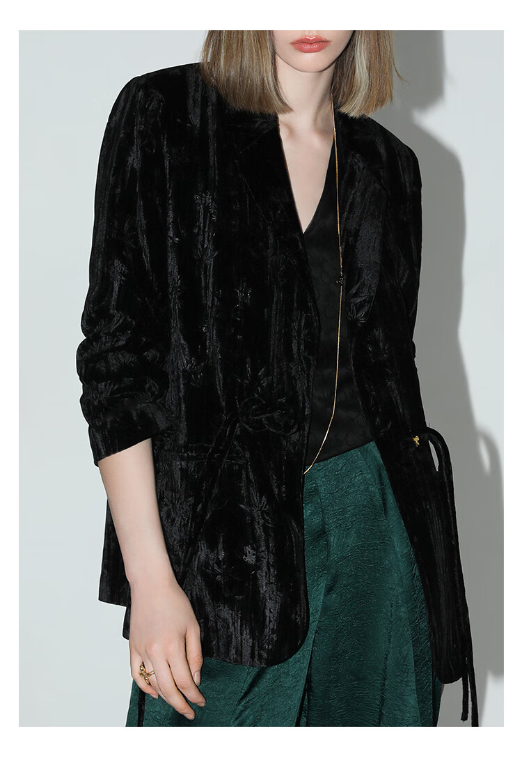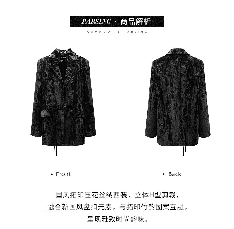 【有赞】COCOBELLA新中式竹叶拓印压褶丝绒西装女国风盘扣外套SI3007B