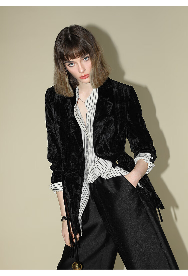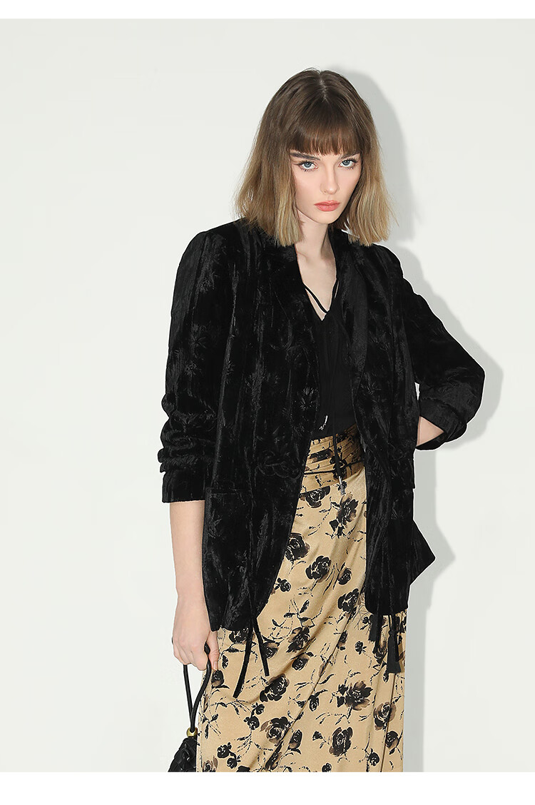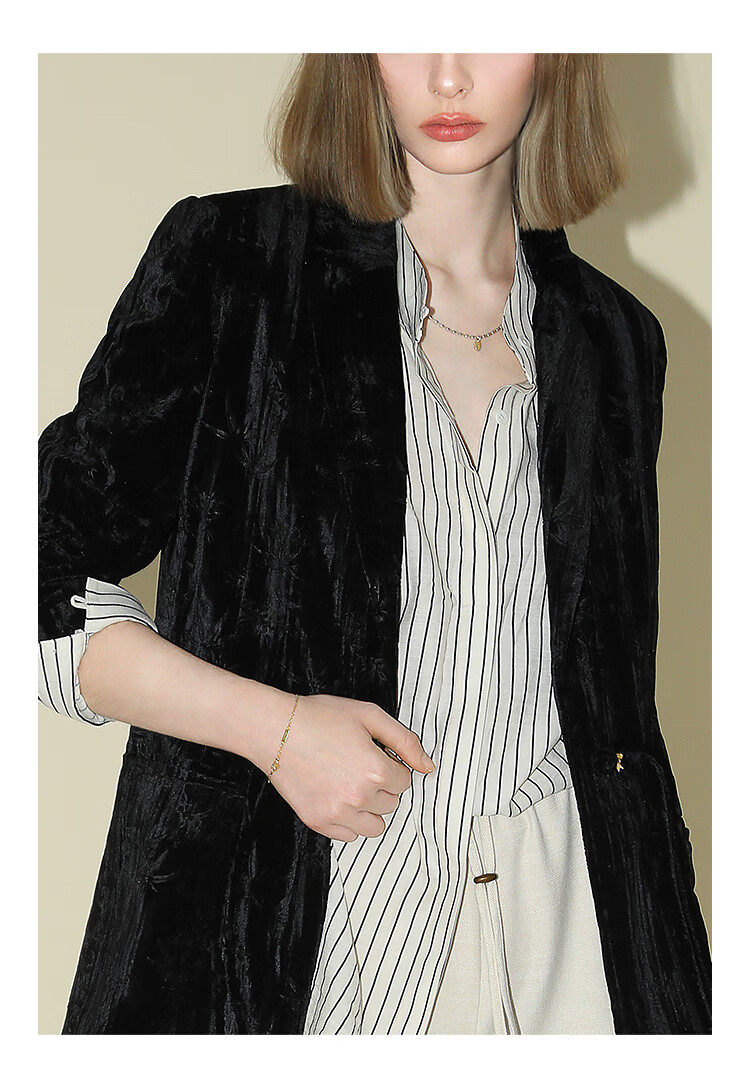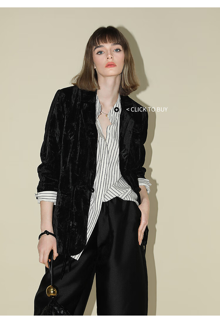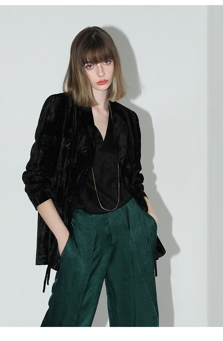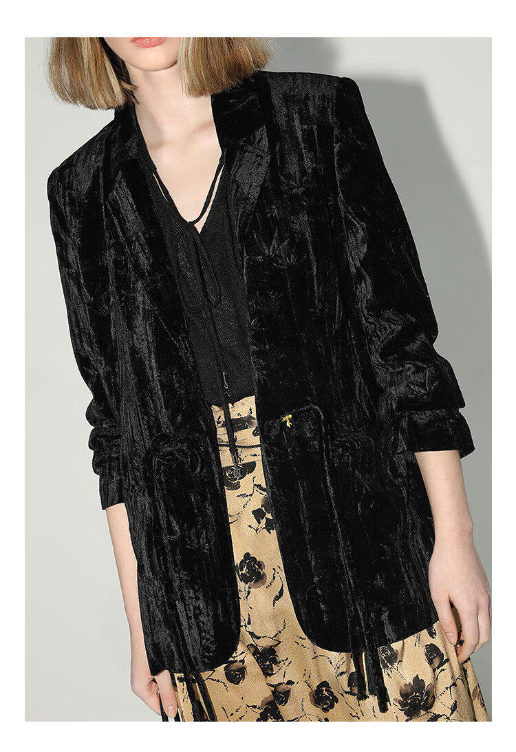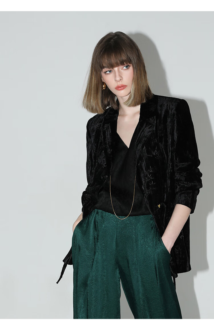 【有赞】COCOBELLA新中式竹叶拓印压褶丝绒西装女国风盘扣外套SI3007B