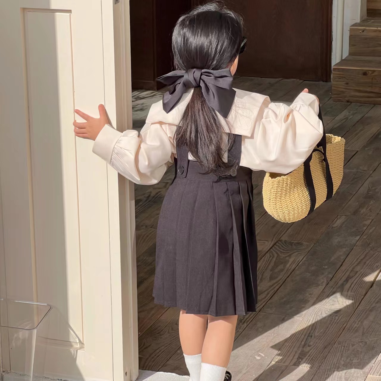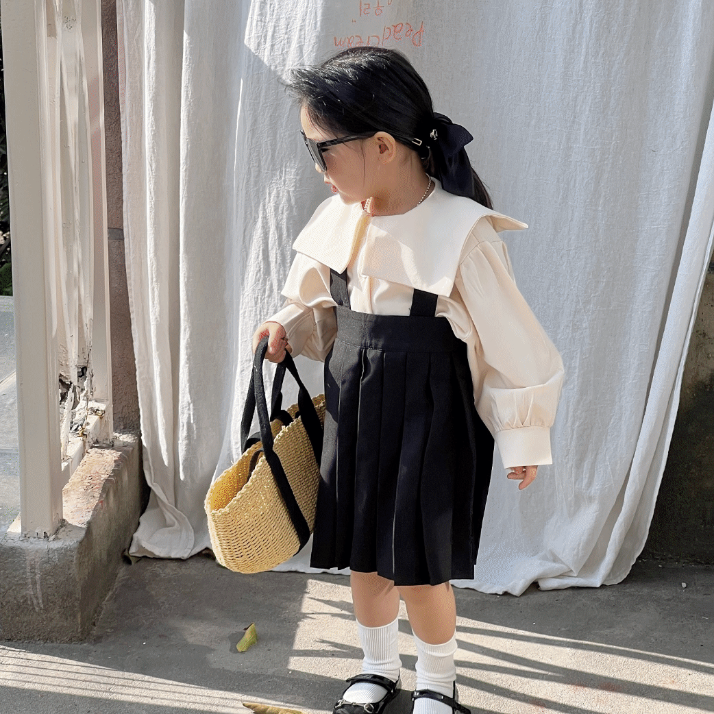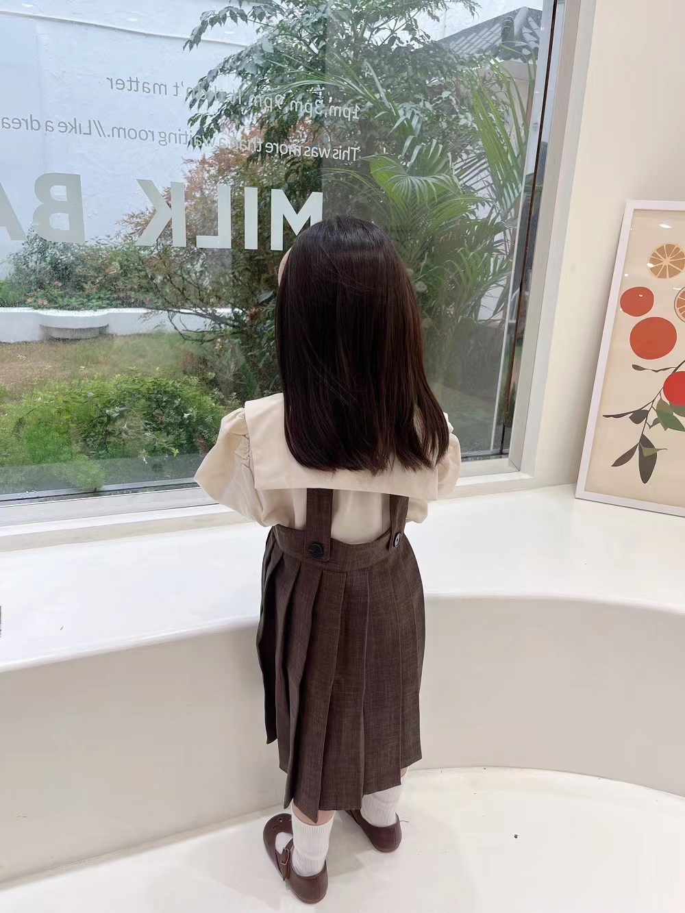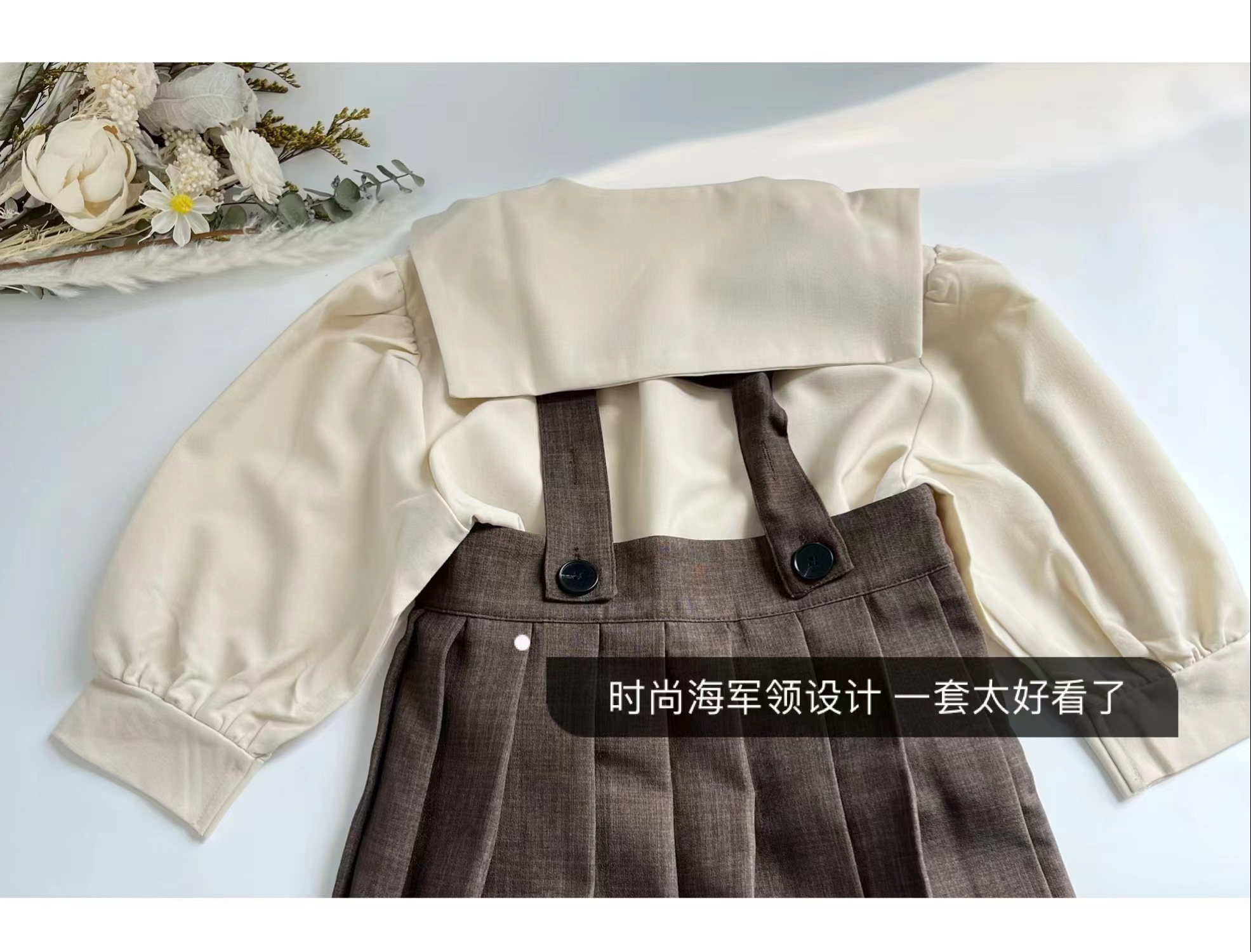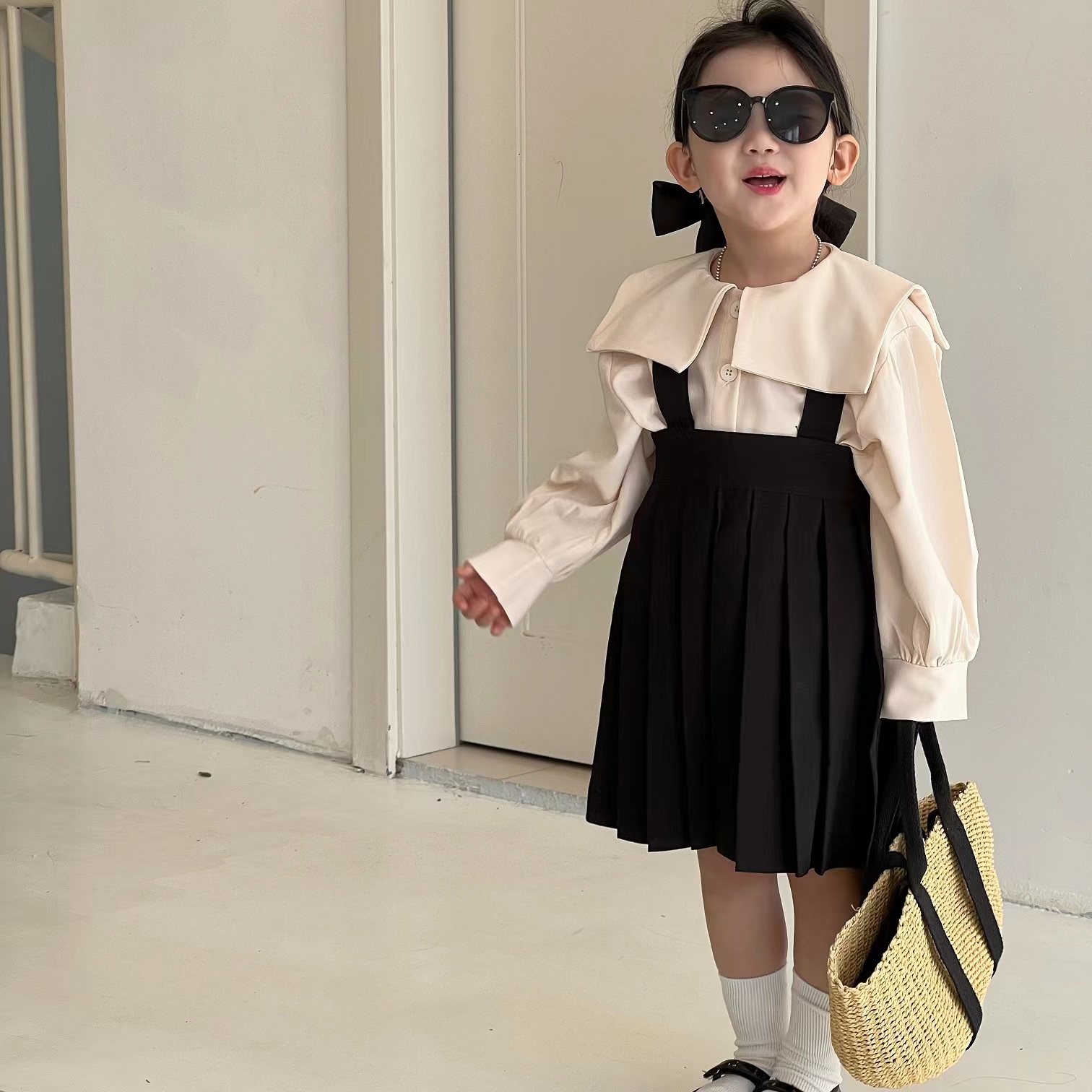 海军大翻领设计衬衫+百搭的黑色百褶背带裙~