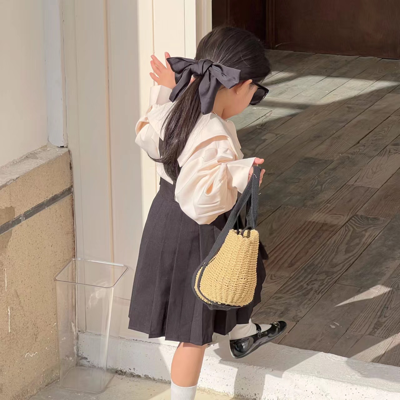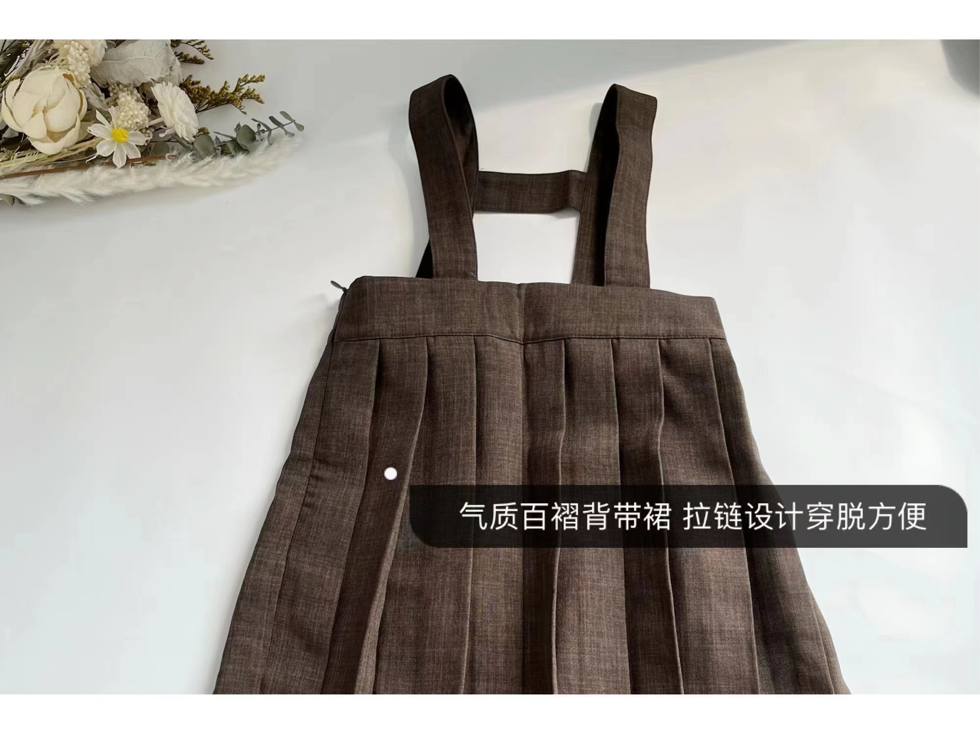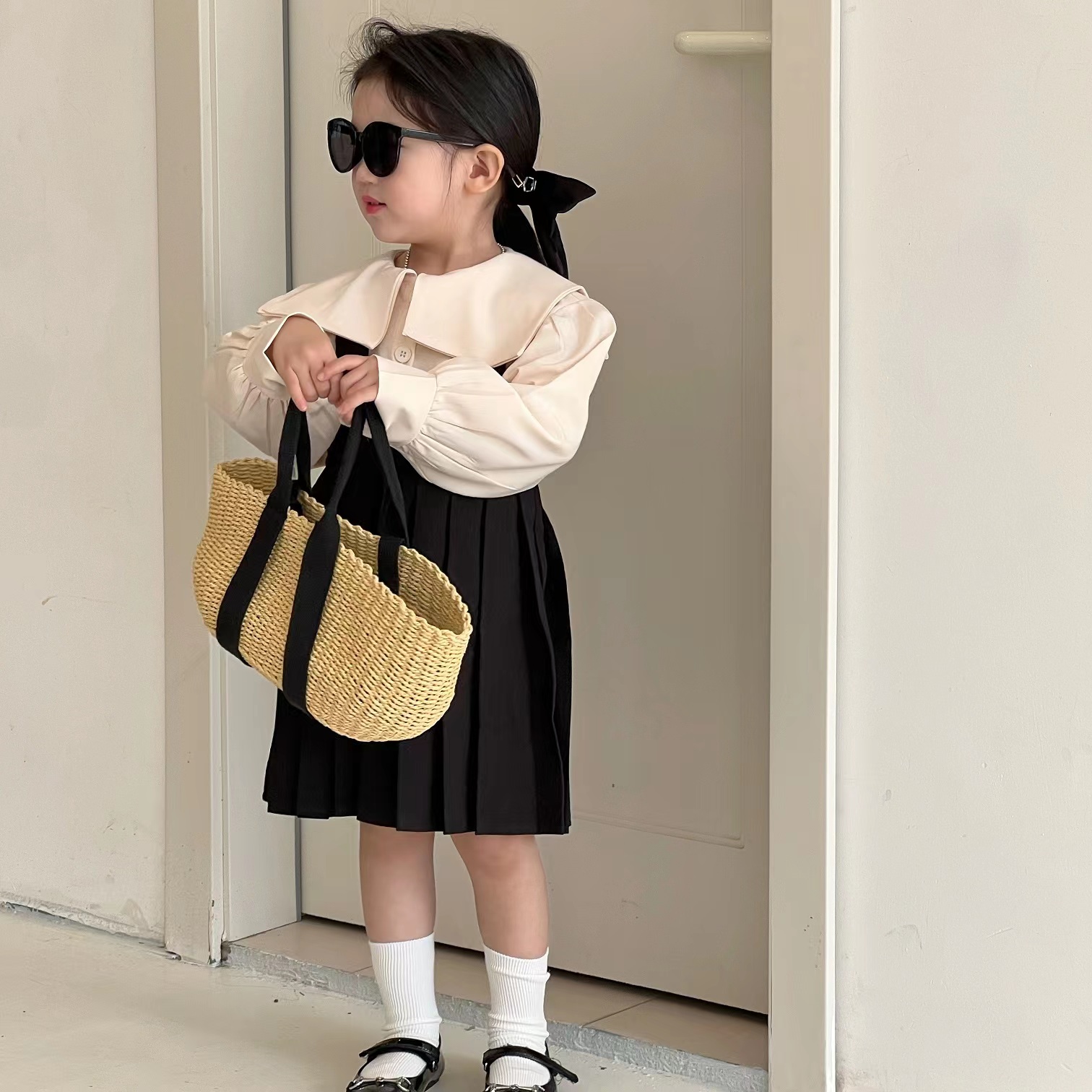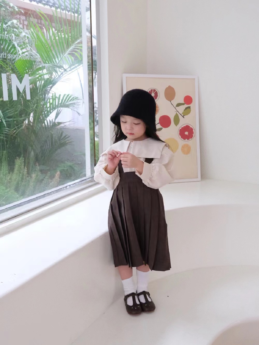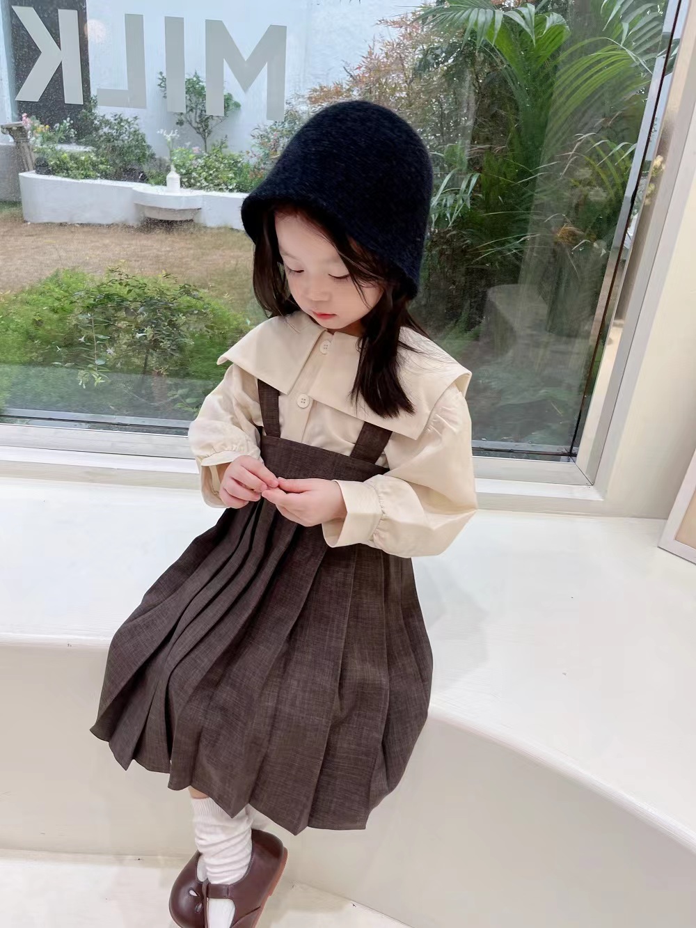 海军大翻领设计衬衫+百搭的黑色百褶背带裙~