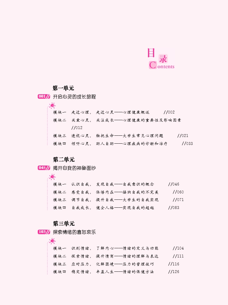 《大学生心理健康教育》共九单元,具体内容包括心理健康概述、人格与自我意识、情绪、恋爱与性、人际关系、生命与危机、学习、原生家庭和职业生涯规划等方面知识,涵盖了大学心理健康教育的常见问题,涉及大学生心理健康教育各主要方面。本教材采用了近几年发表的新资料,尽量多吸收国内外专家的新成果,并结合实例,力求使心理健康理论联系大学生实际。本教材以《大学生心理健康教育指导纲要》为依据,结合当前大学生的心理健康状况,帮助大学生正确认识和处理好学习成才、择业交友、健康生活方式等方面的具体问题,对大学生在认知、情绪、意志、行为等心理过程和人格、能力等个性心理中表现出来的发展特点,以及在学习、生活、人际、恋爱、职业等多种实践中遇到的困惑等进行了讲解。