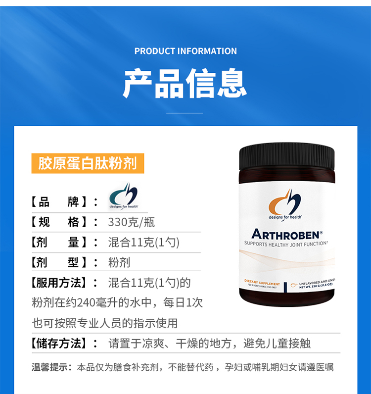【效期至27年3月】胶原蛋白肽粉剂 Designs for health Arthroben® (Unflavored) 330g/瓶