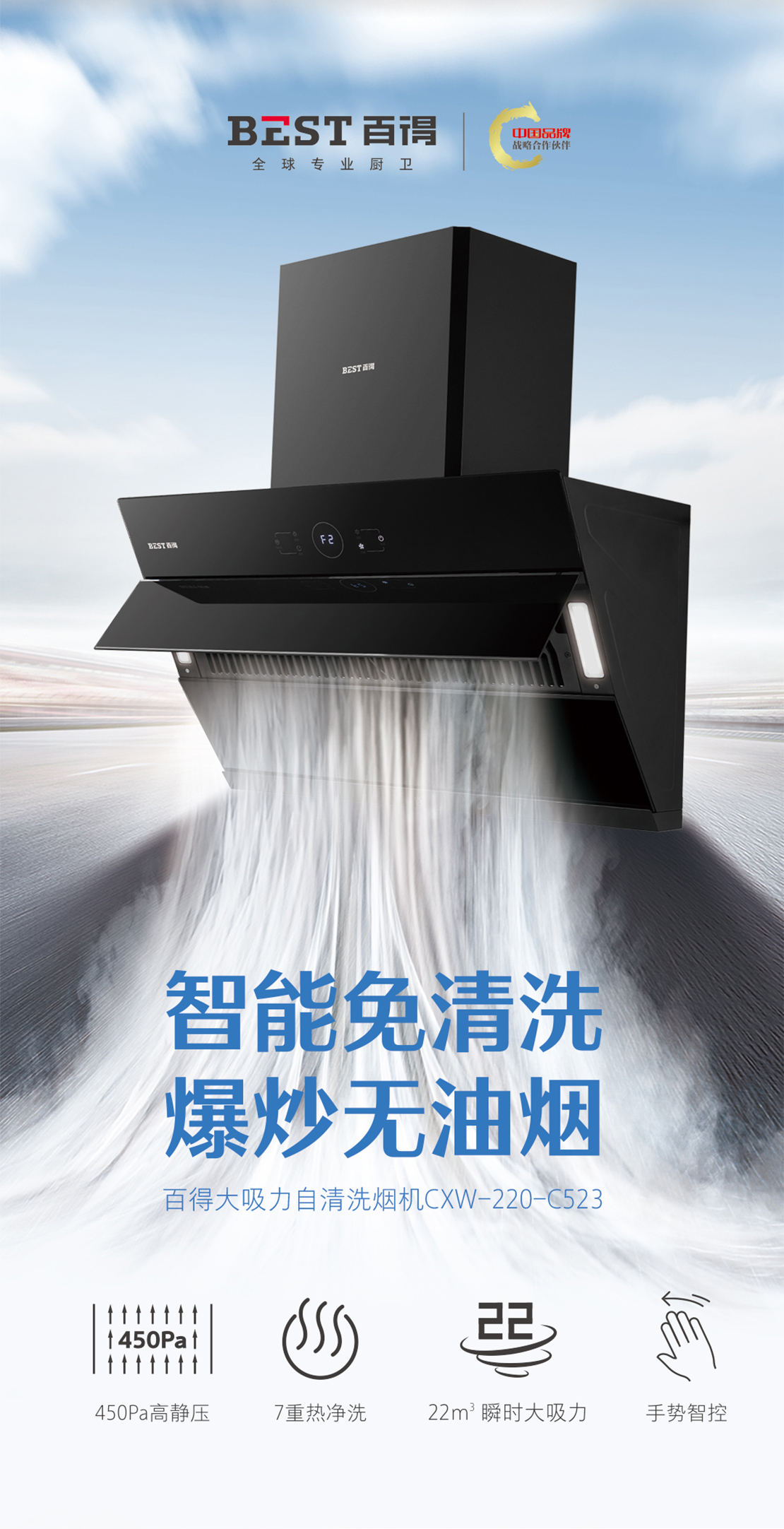 百得油烟机 CXW-220-C523 侧吸 22立方大吸力 手势智控 脱排 7重热净洗 一级能效