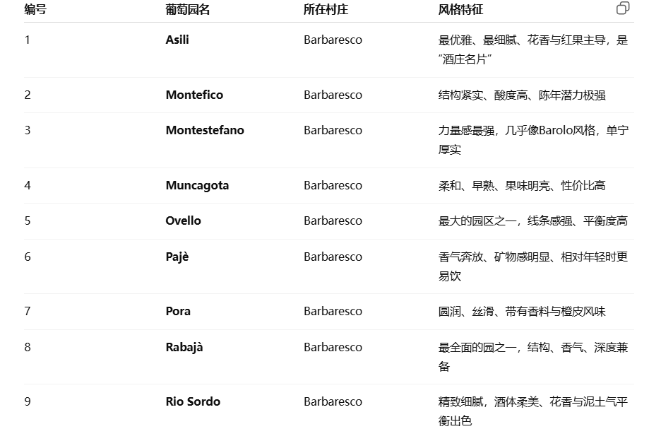 这 9个园区 是他们的经典“九大单一园”,代表整个 Barbaresco 村的核心风土