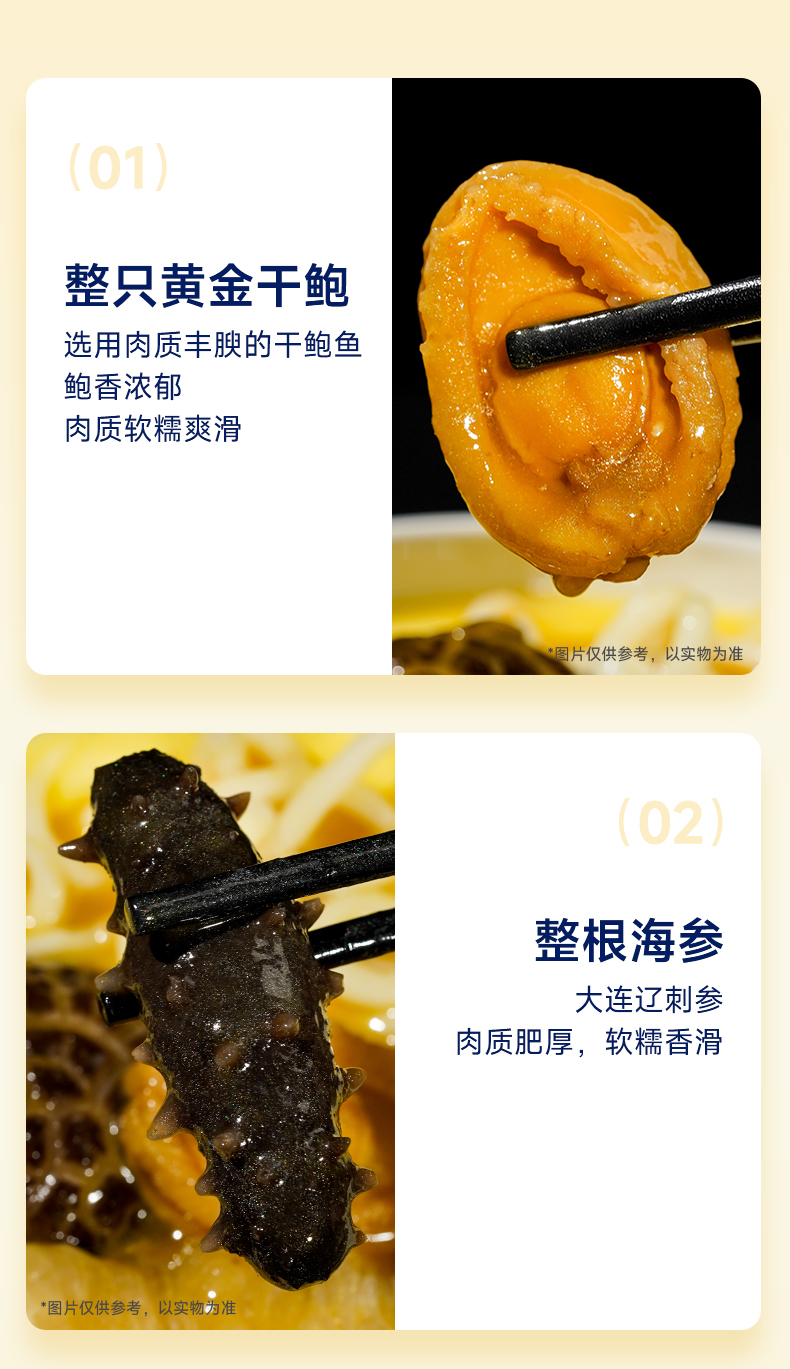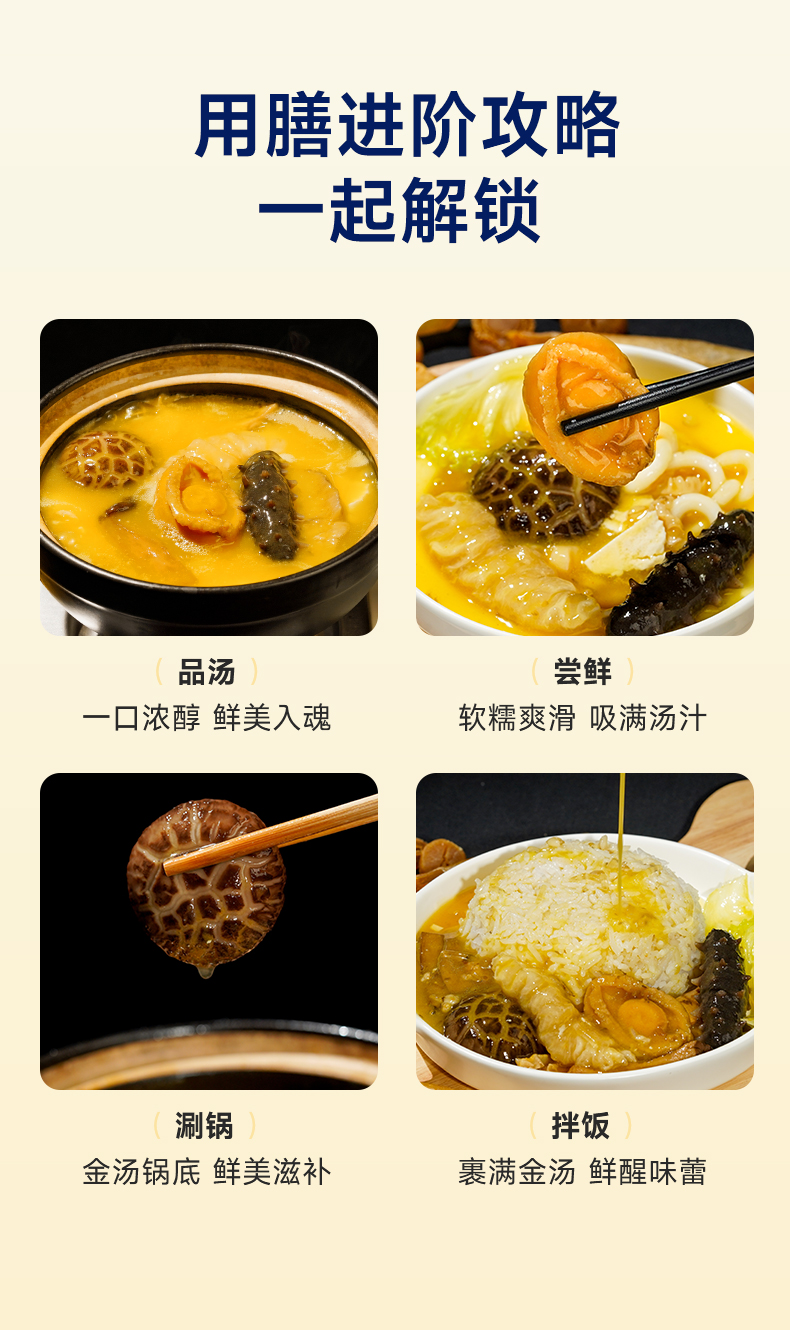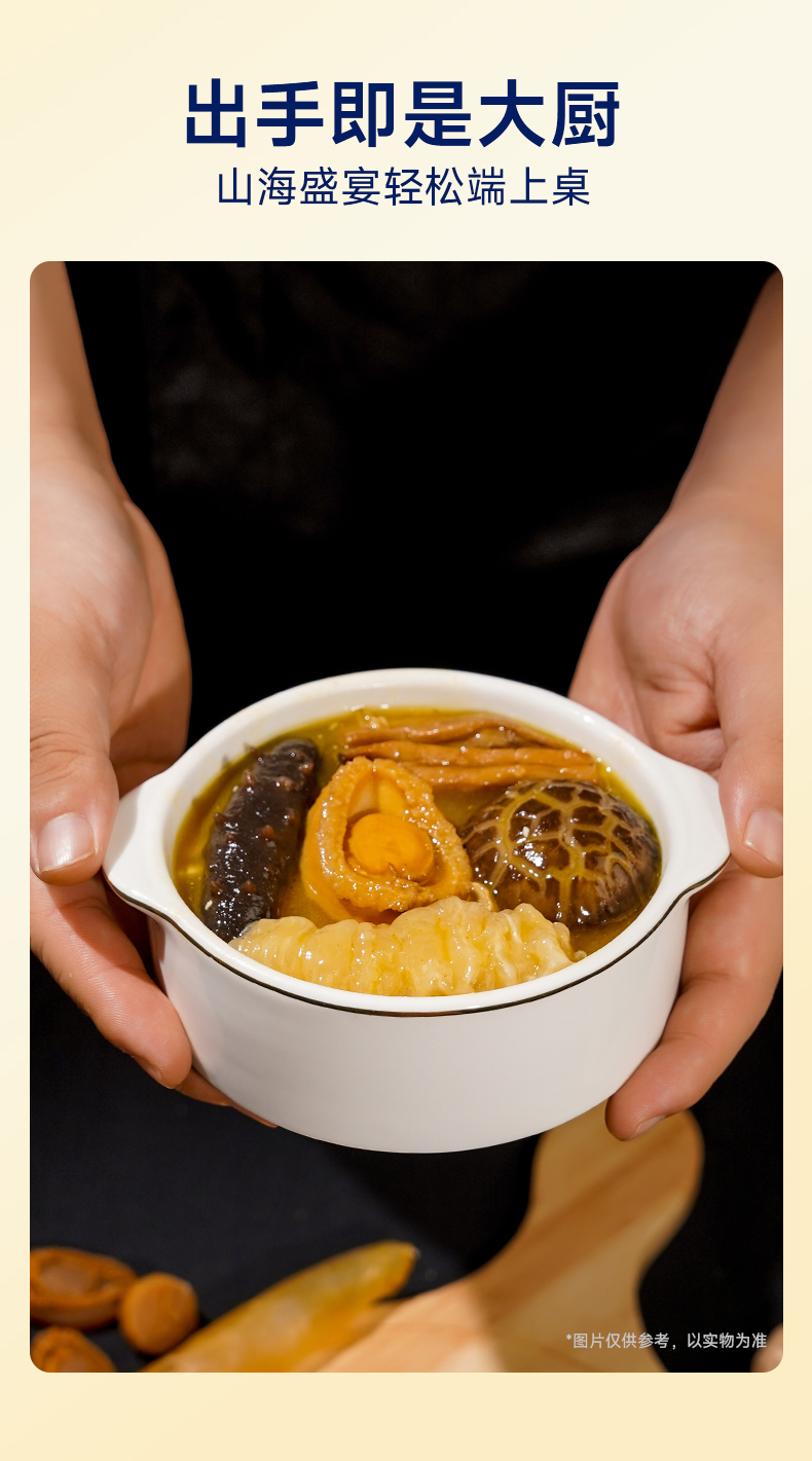 - 让更多家人实现鲍参翅肚自由~ 鲍、参、花胶、燕窝等滋补营养品世家; 高端预制菜源头供应链
