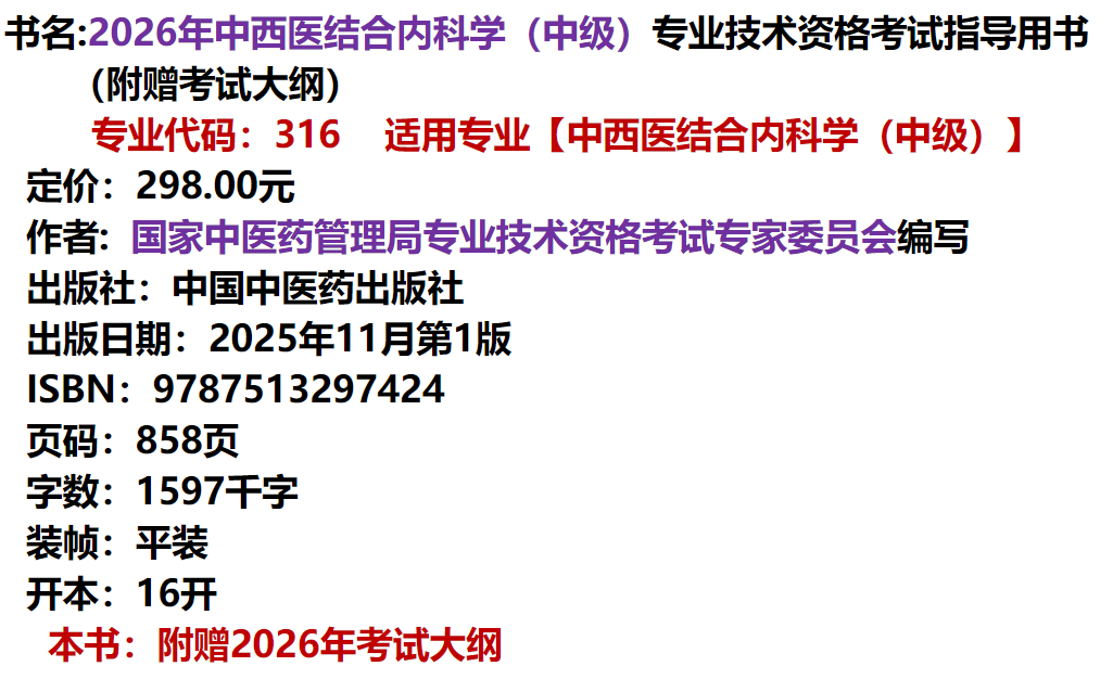 2026年中西医结合内科学(中级)专业技术资格考试指导用书 代码316 国家中医药管理局专业技术资格考试专家委员会 中医药出版社