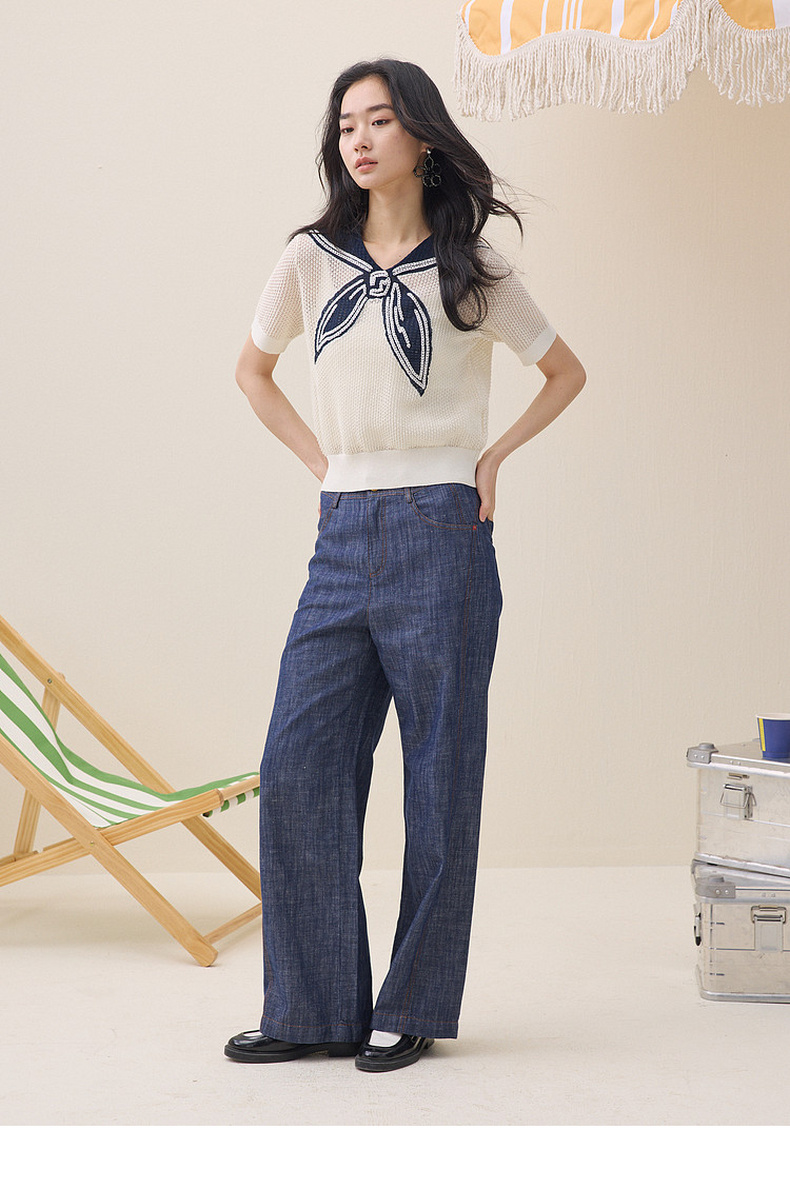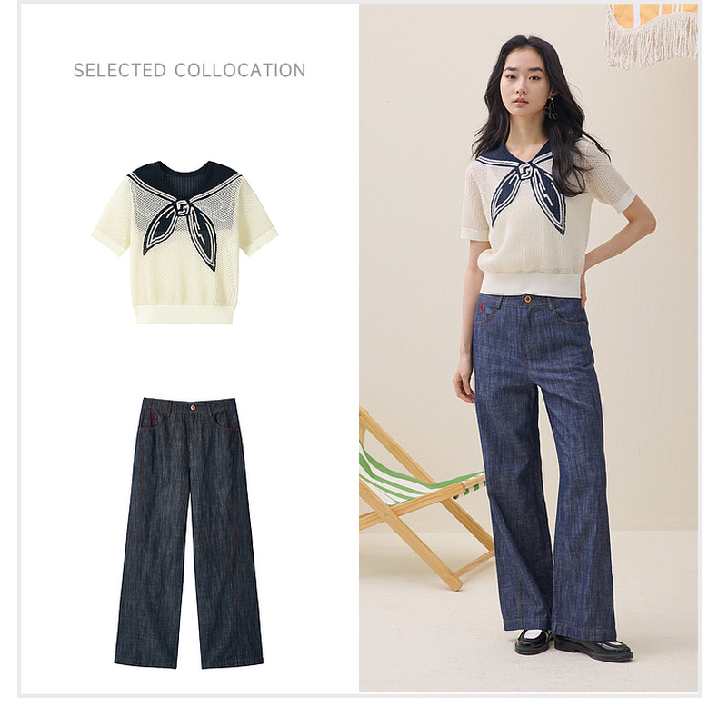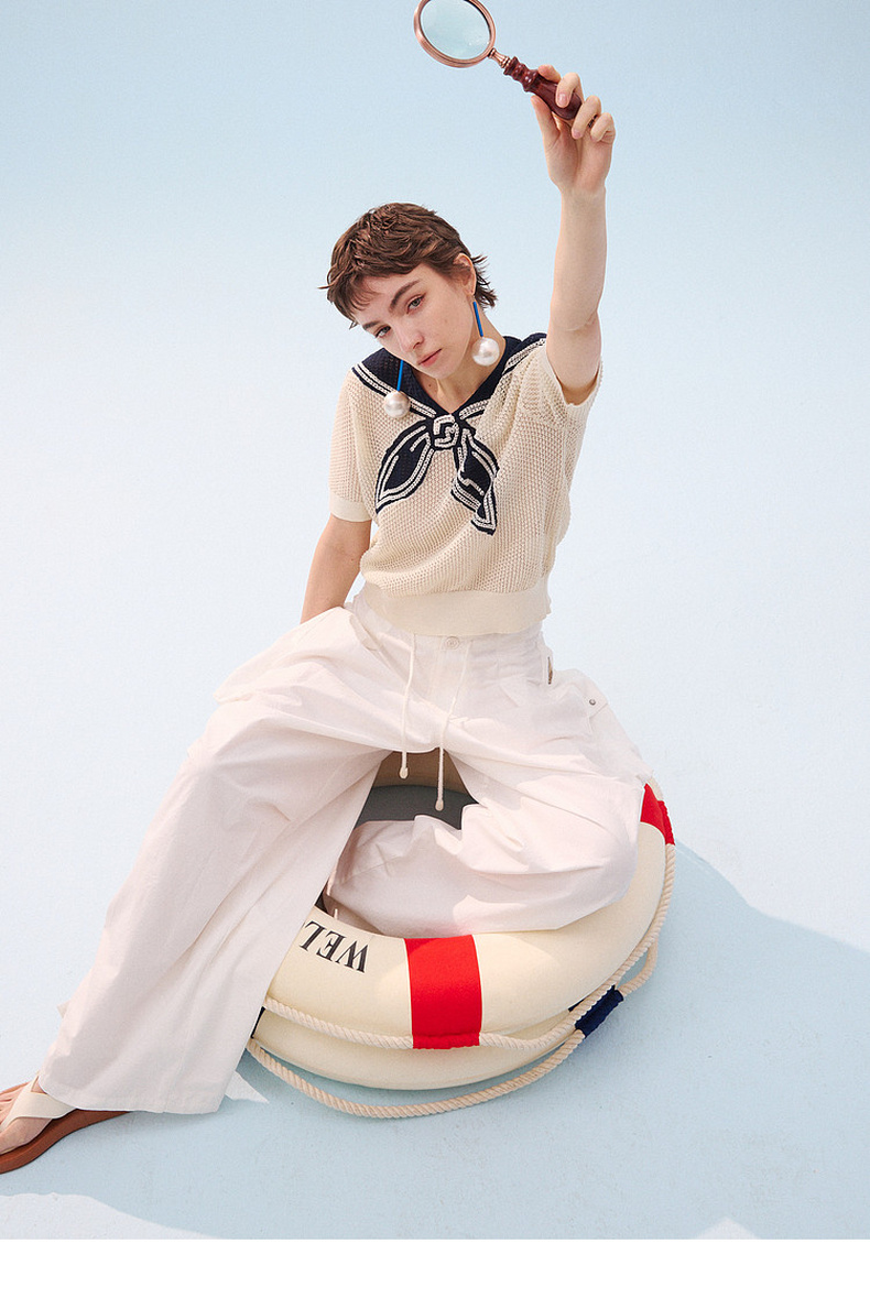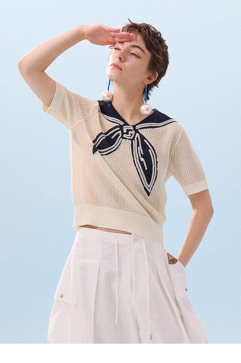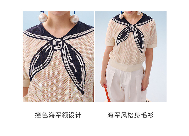谜底套头针织衫短袖2026夏季新品海军领提花舒适毛衣女262MZ0789