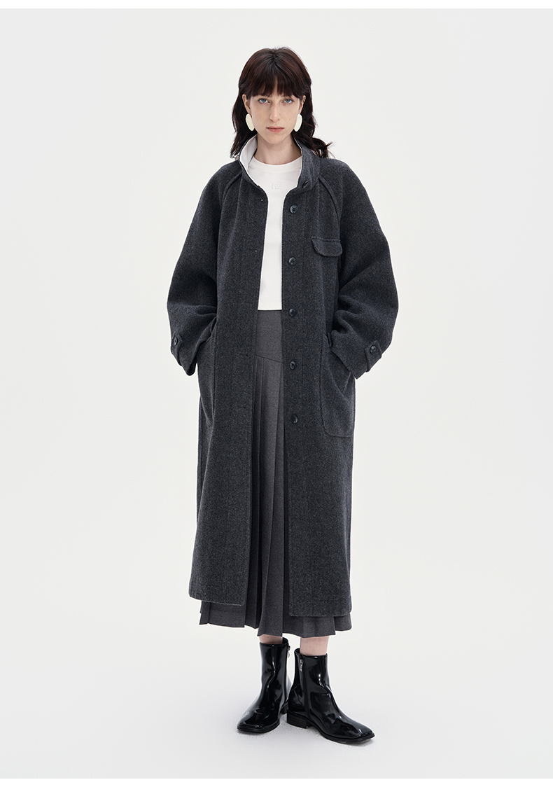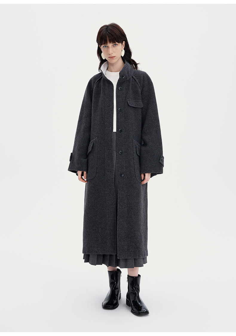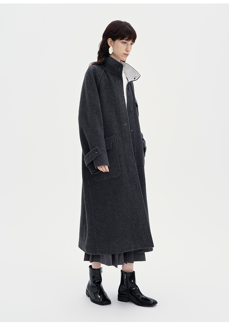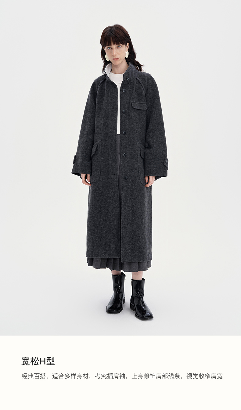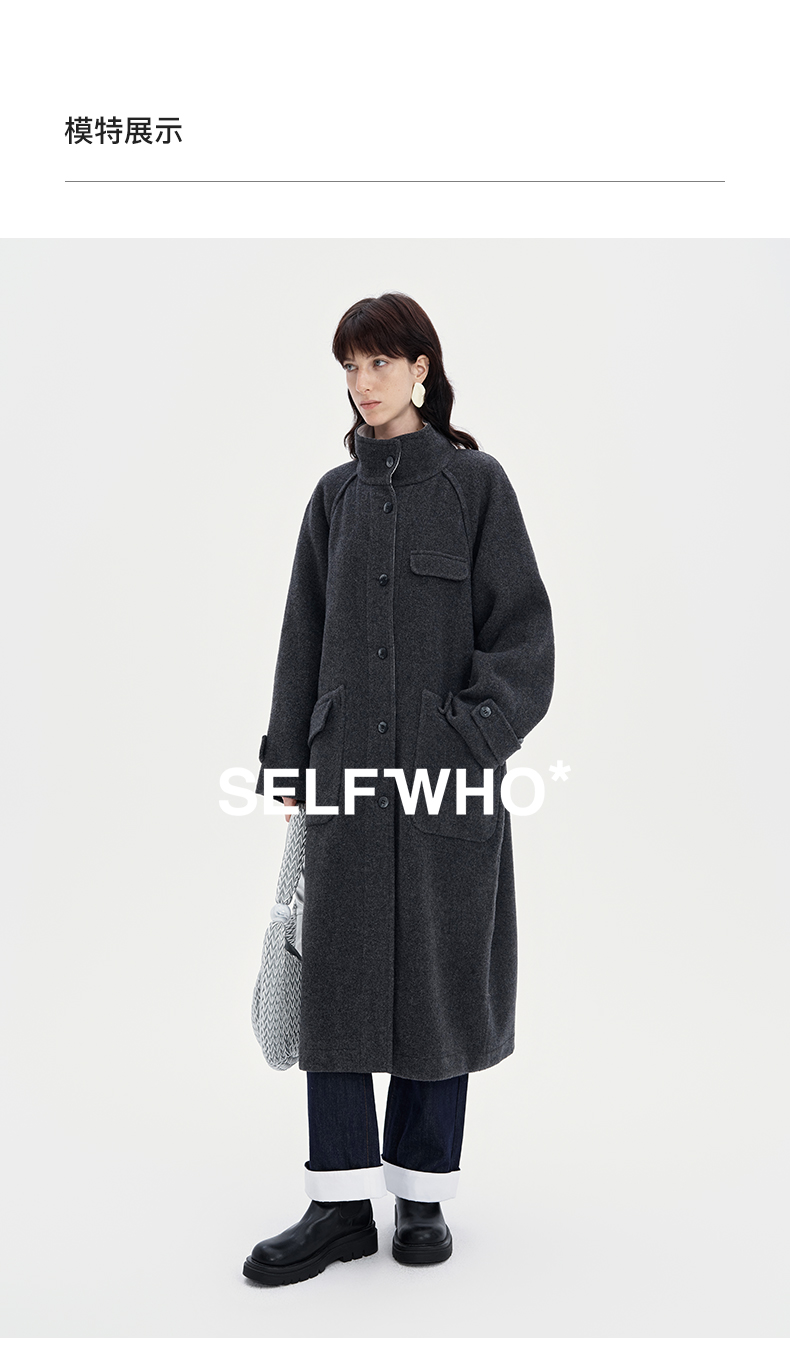 SELFWHO100%羊毛灰色大衣女2立领宽松保暖防寒长款外套