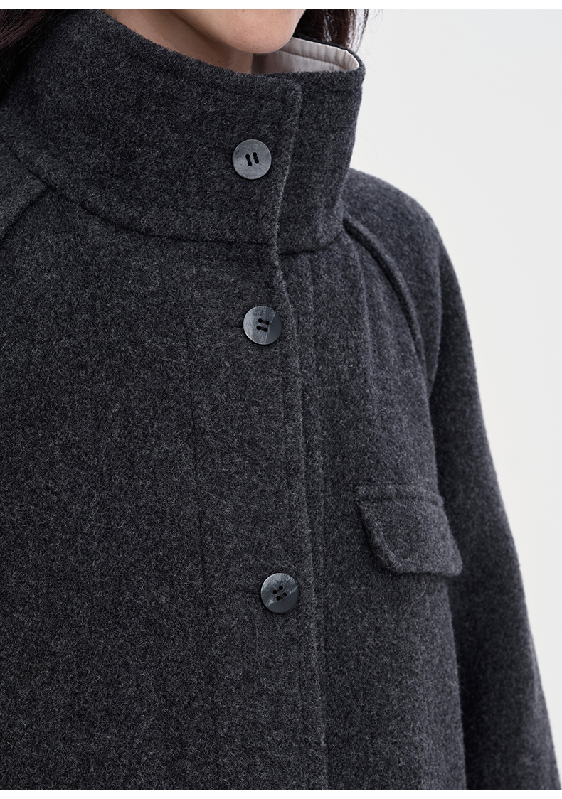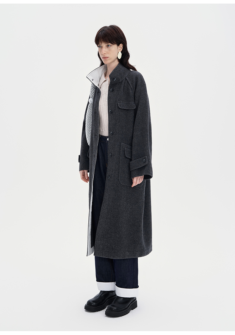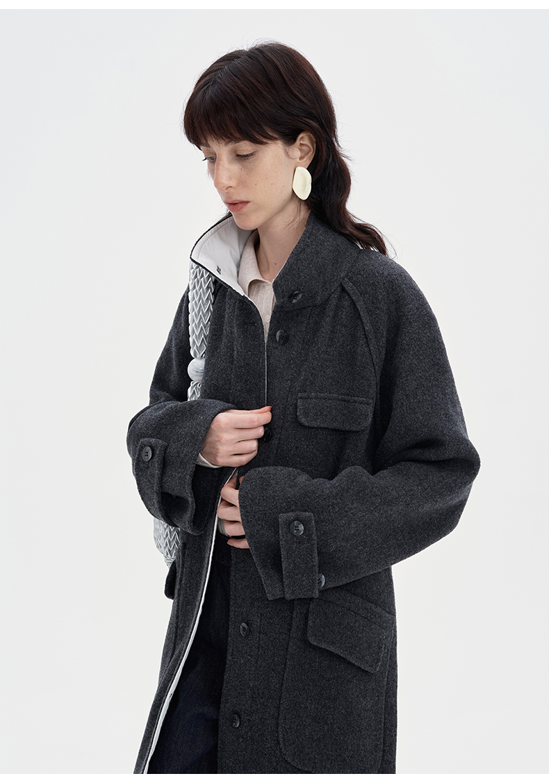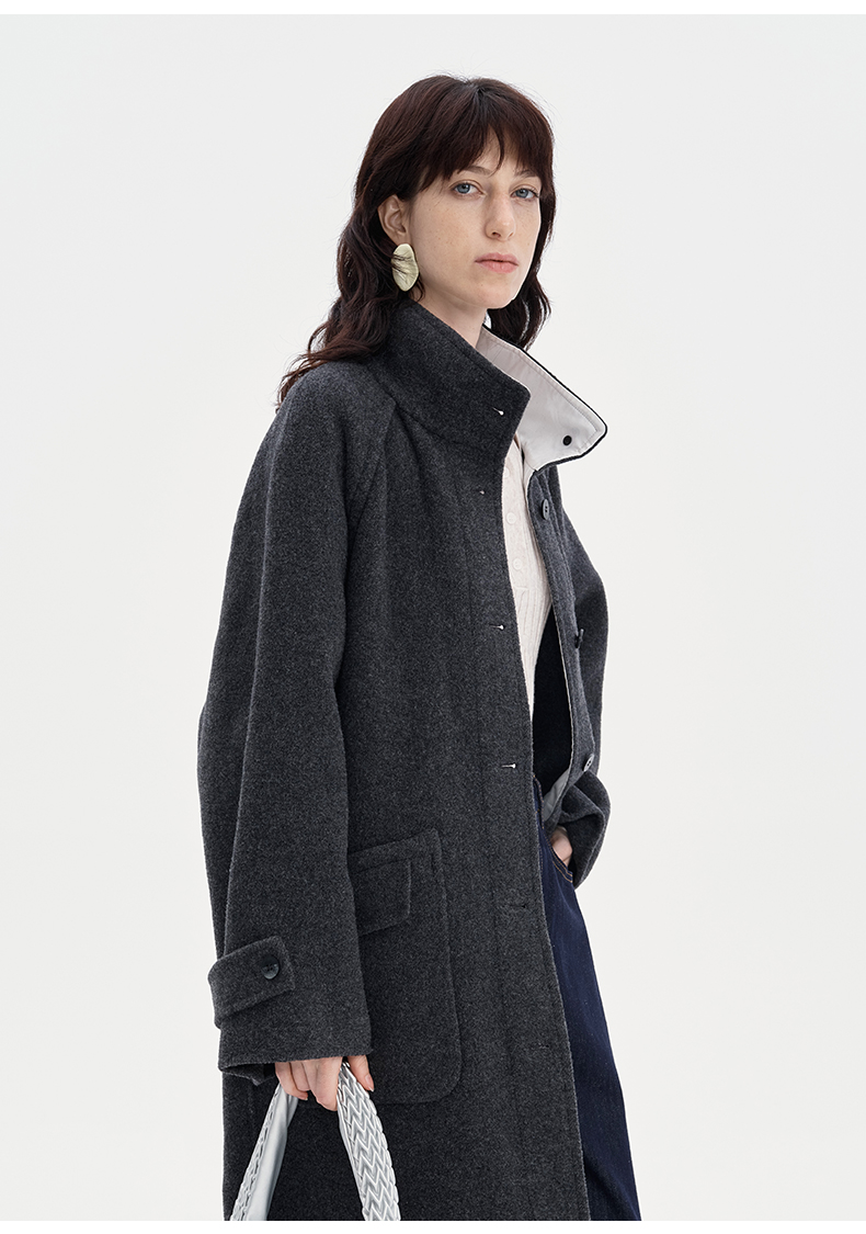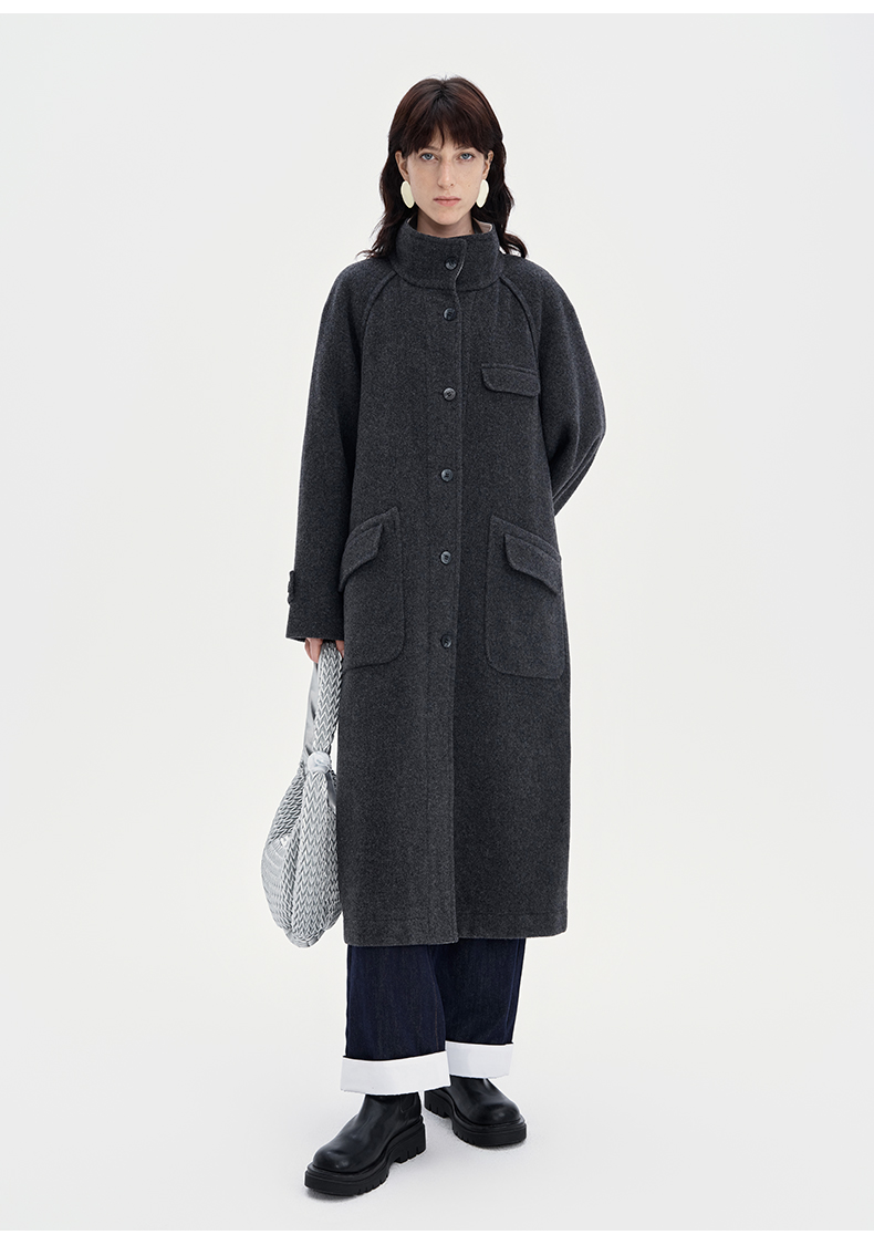 SELFWHO100%羊毛灰色大衣女2立领宽松保暖防寒长款外套