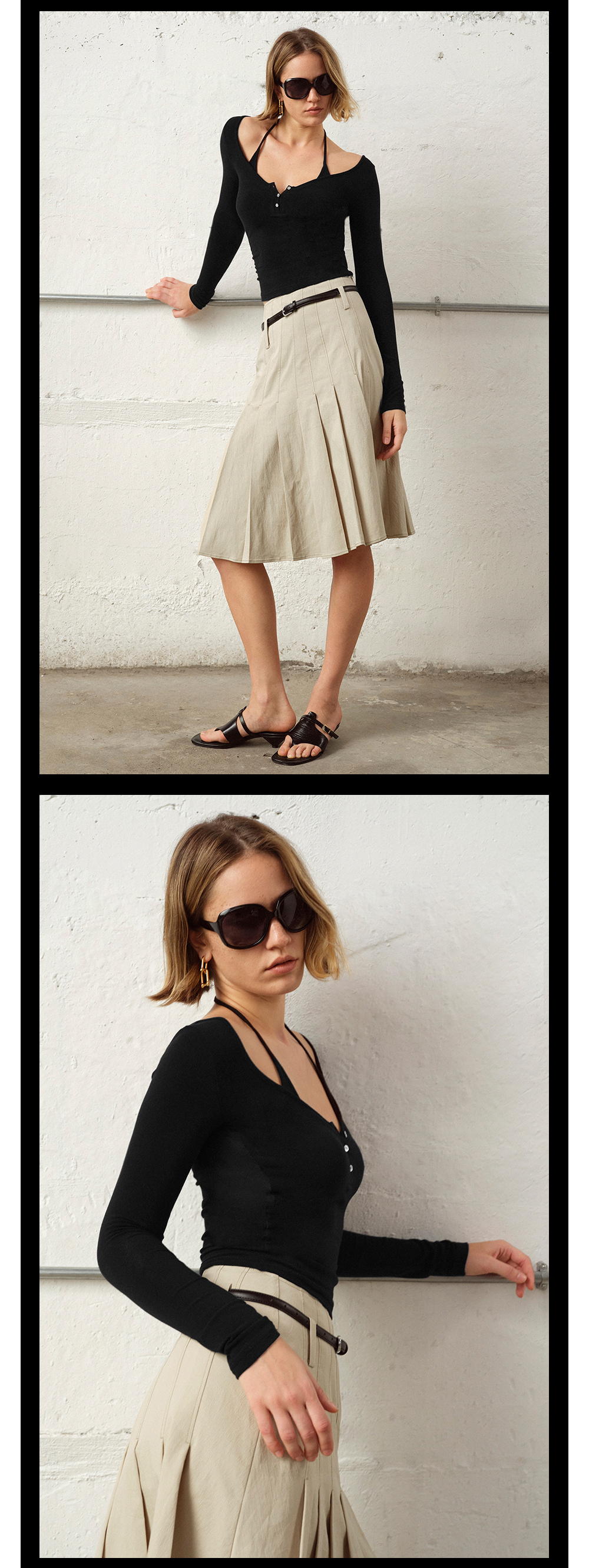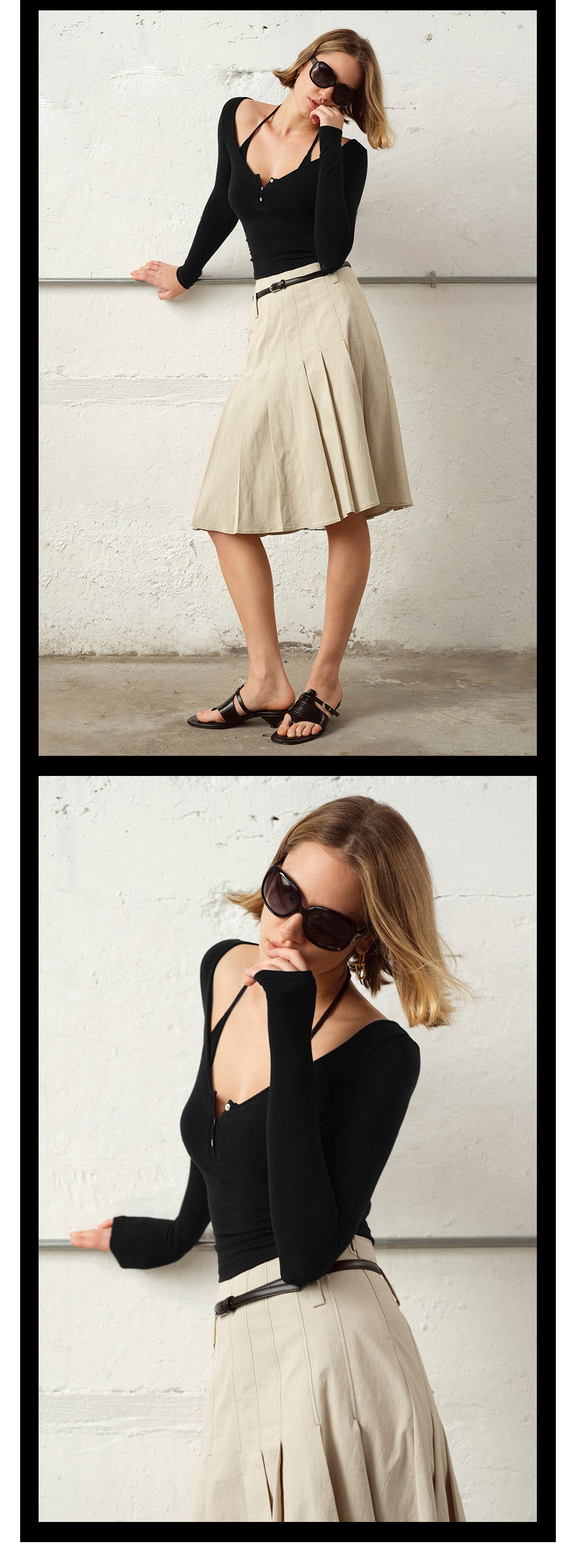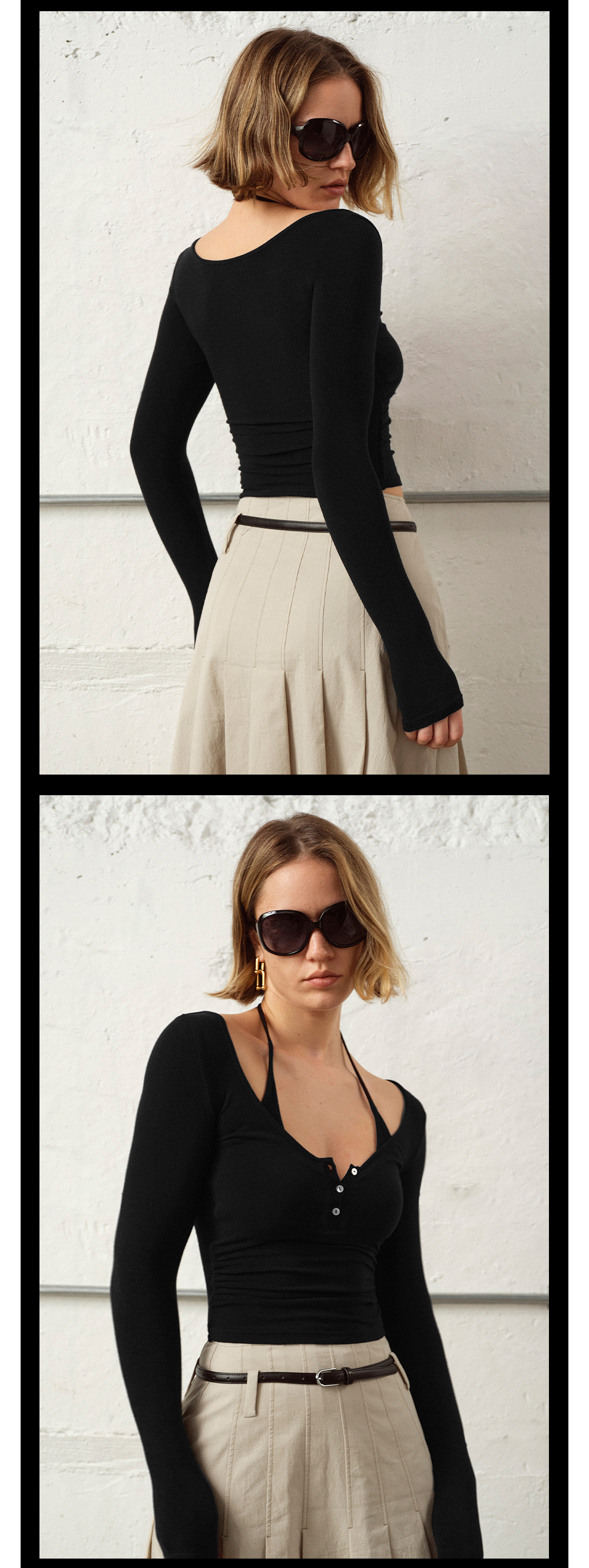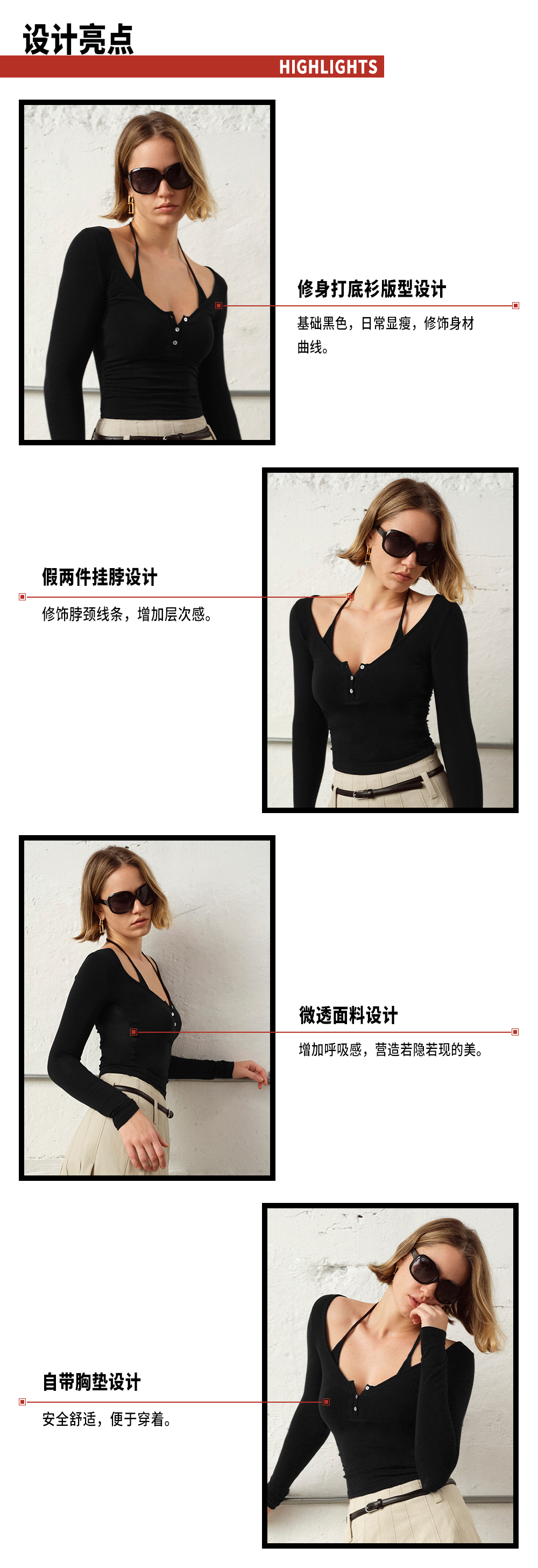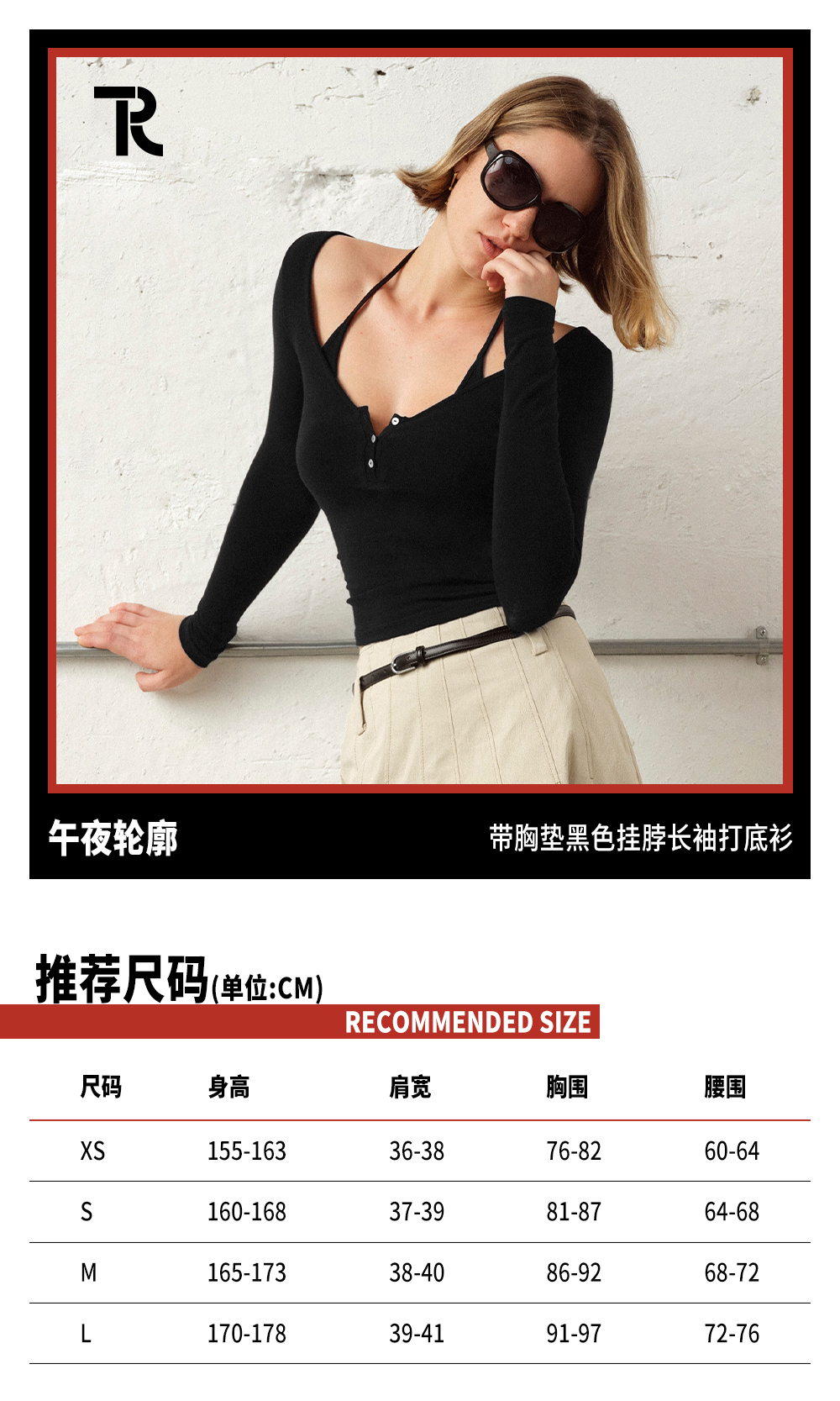 TR她热 午夜轮廓 黑色棉感弹力修身显瘦带胸垫挂脖打底衫上衣