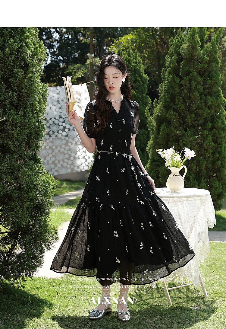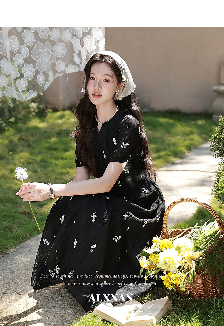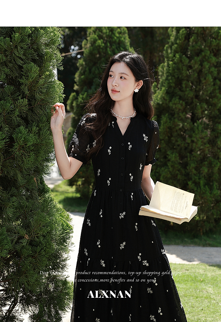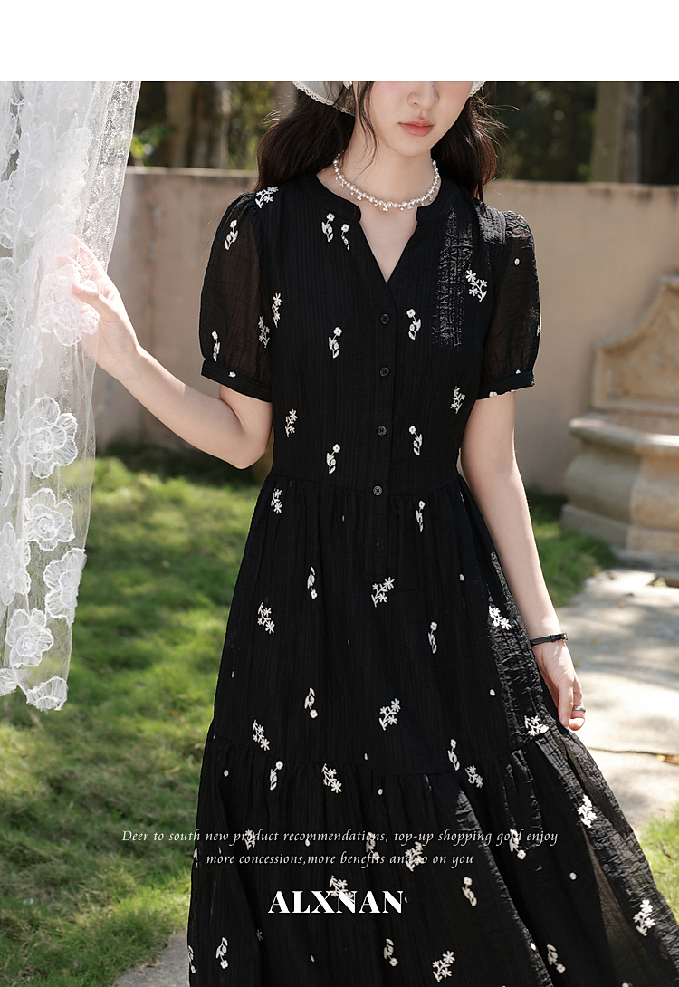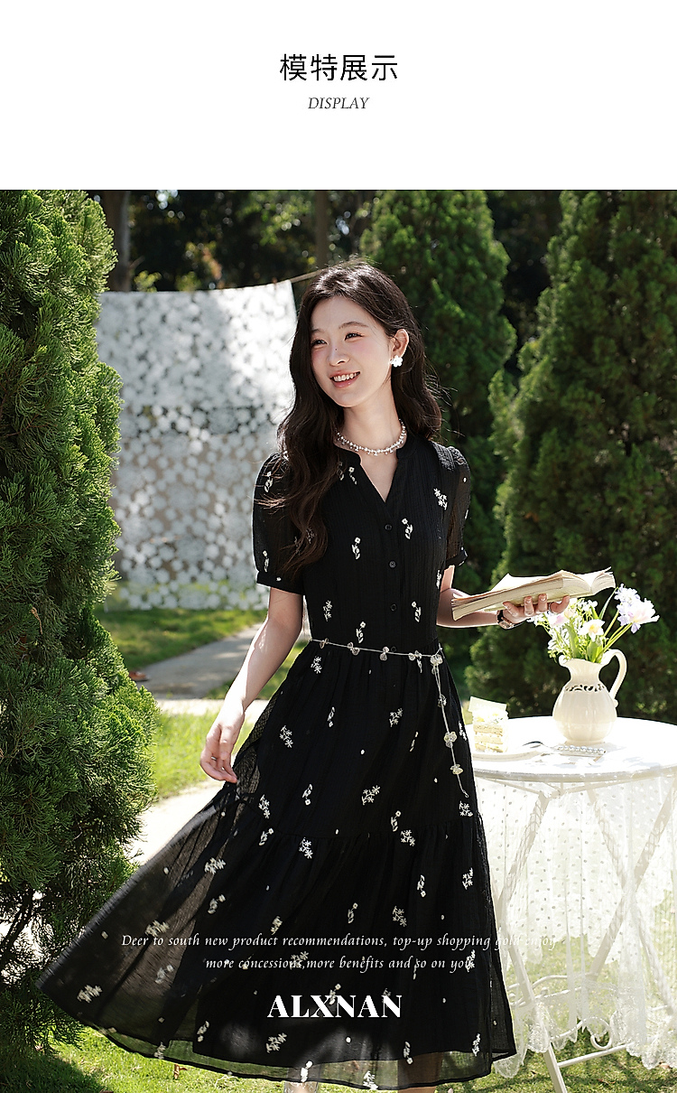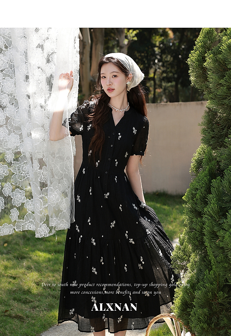 鹿向南「雾漫山野」黑色短袖连衣裙女夏新款修身时尚印花A字长裙