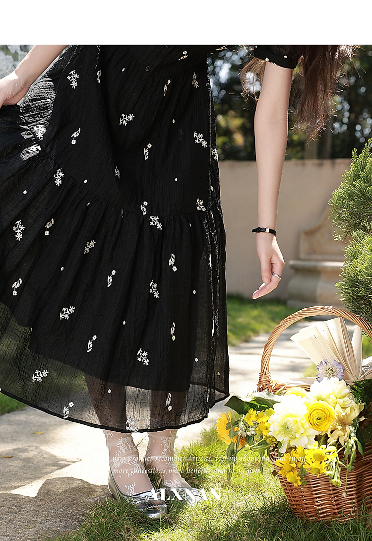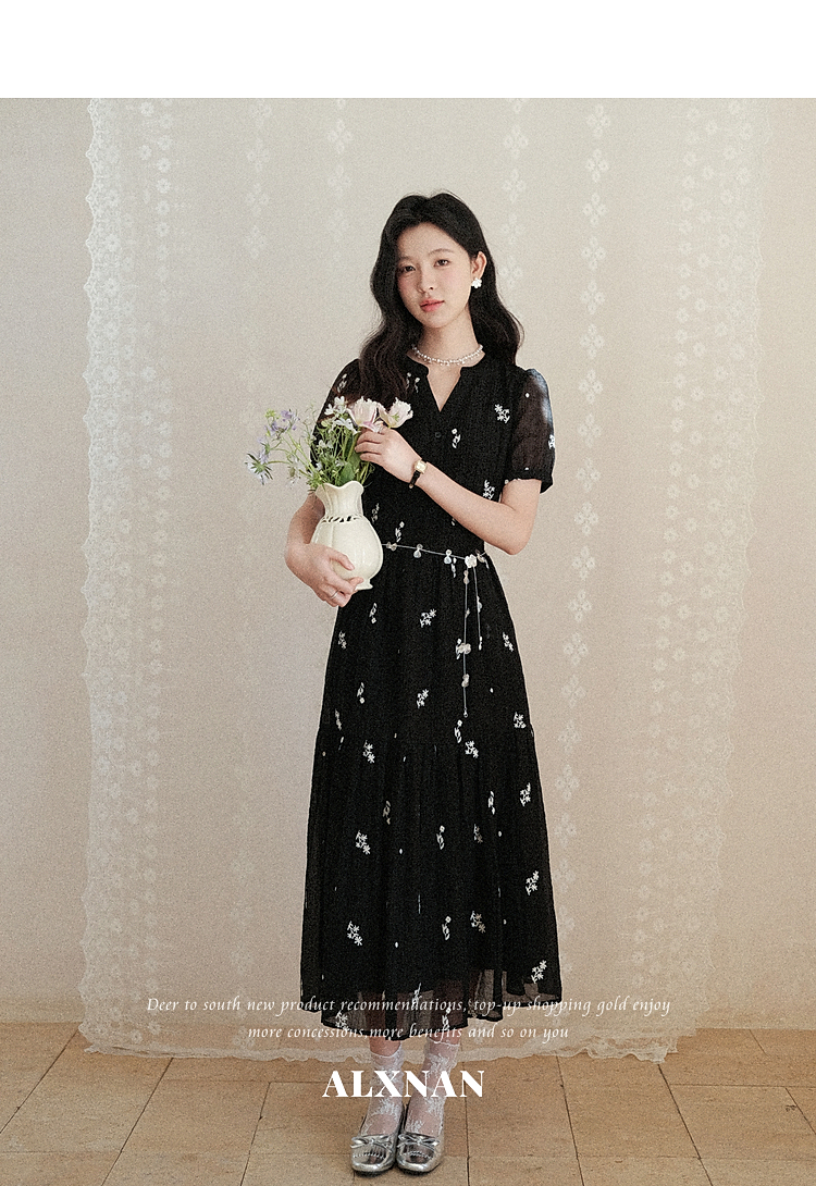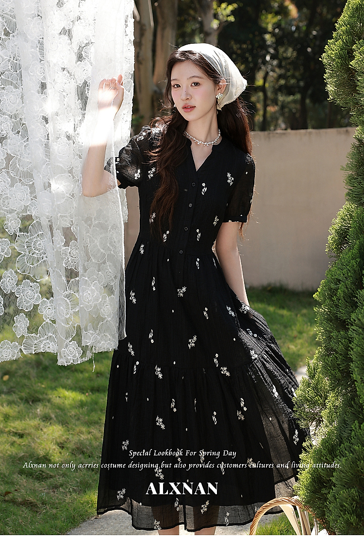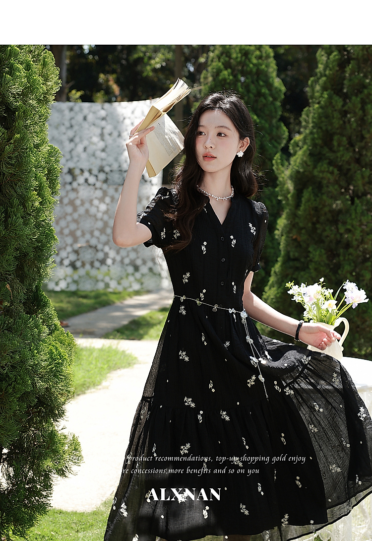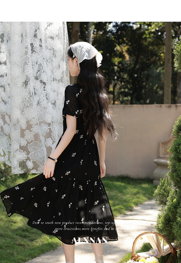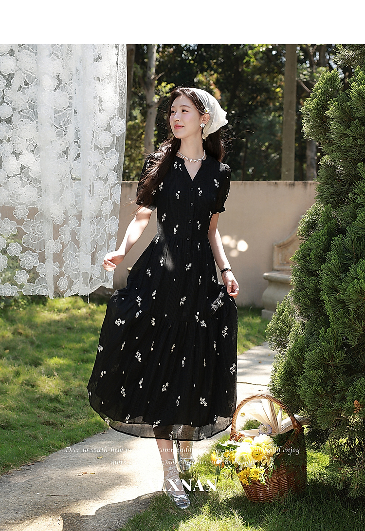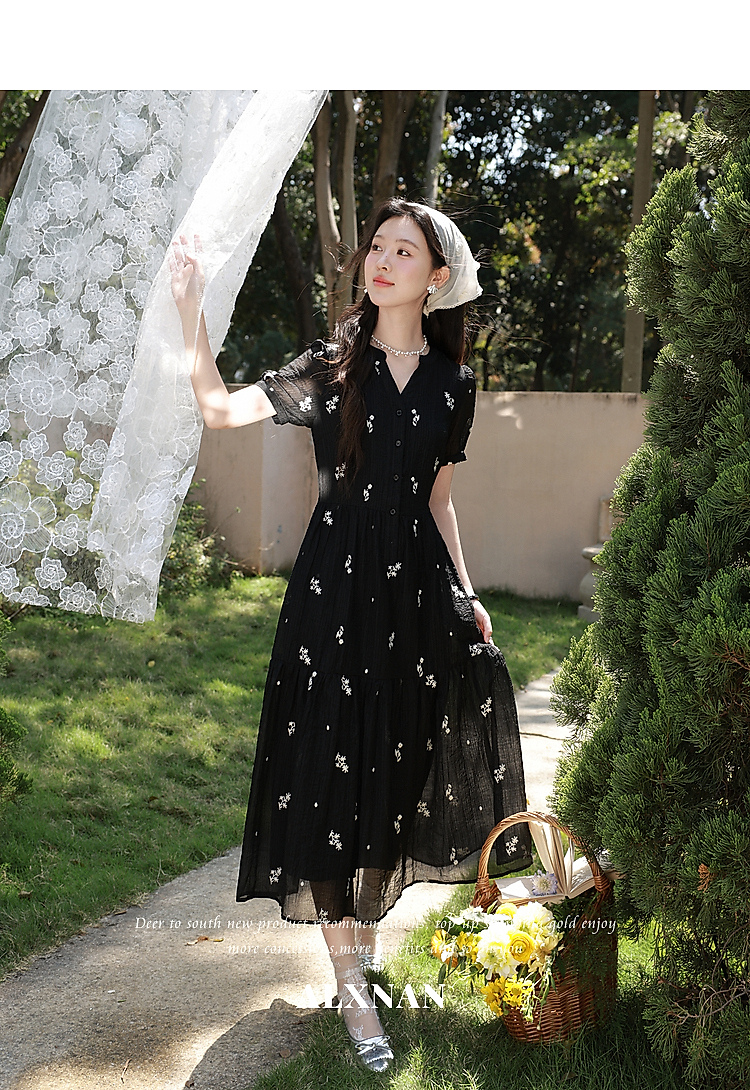 鹿向南「雾漫山野」黑色短袖连衣裙女夏新款修身时尚印花A字长裙