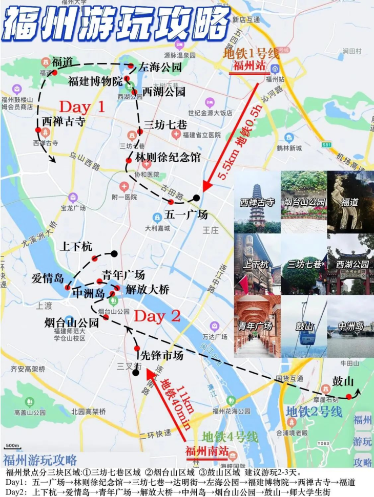 林觉民・冰心故居→严复故居→福建民俗博物馆→闽台历史文化研究院→永和鱼丸→同利肉燕→小黄楼→郭柏荫故居→水榭戏台→福建省非物质文化遗产博览苑→金鱼弄→“山海福厝” 国潮生活馆→古厝福礼・文创研究院→福州市海上丝绸之路展示馆→爱心树→林聪彝故居(城市会客厅)→福建华侨主题展示馆→“寻梦闽都” 沉浸式演出