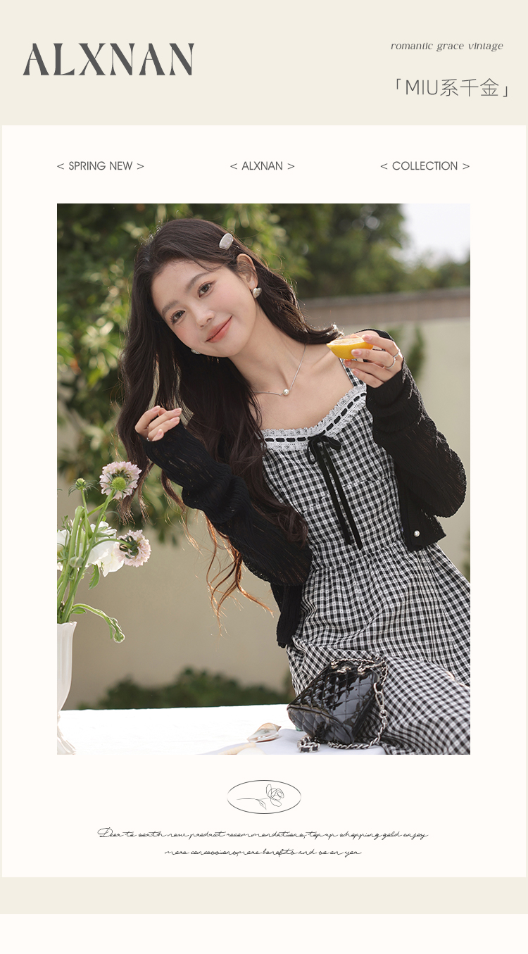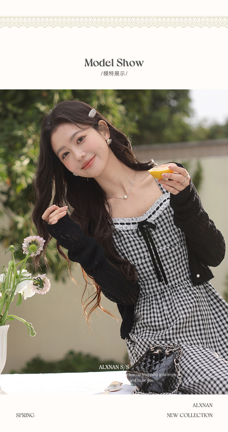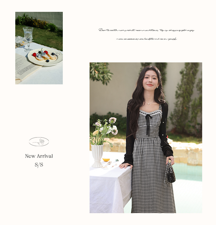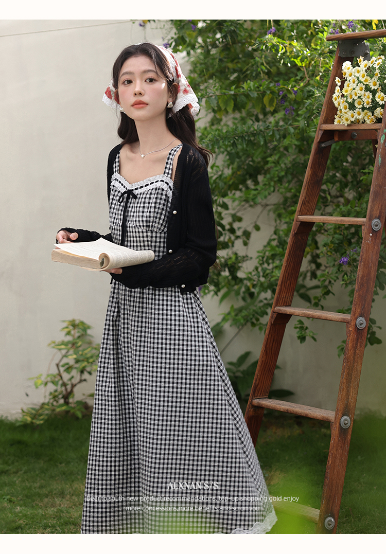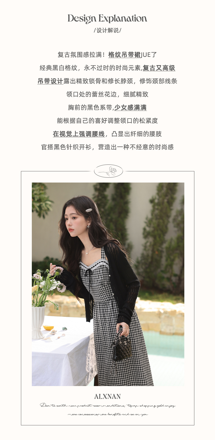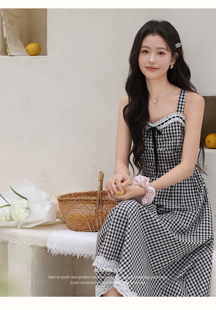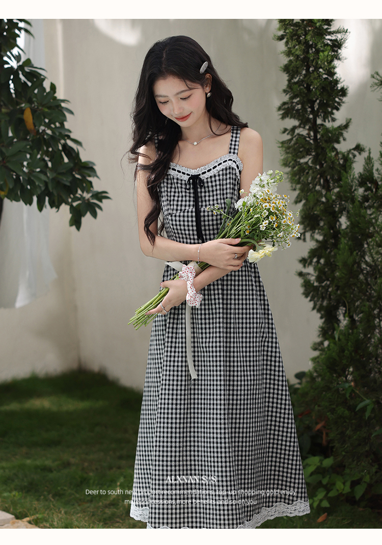 鹿向南「miu系千金」黑白格蕾丝边连衣裙女夏新款设计感吊带长裙