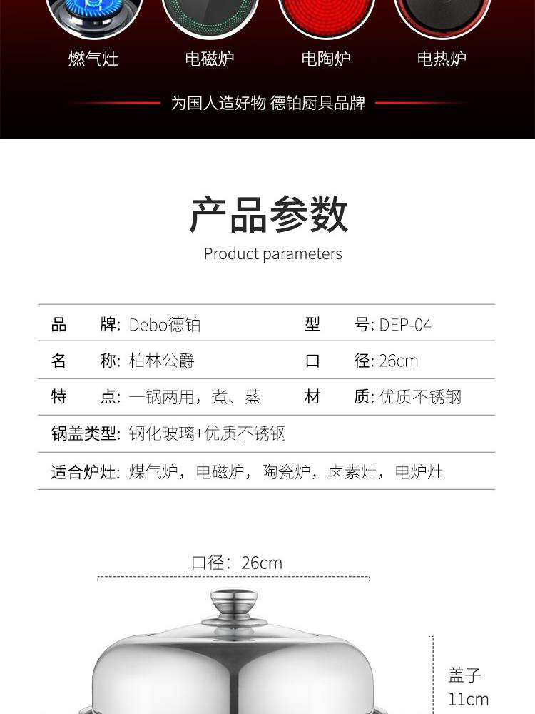德铂Debo 柏林公爵汤蒸锅 DEP-04 26CM 不锈钢用锅
