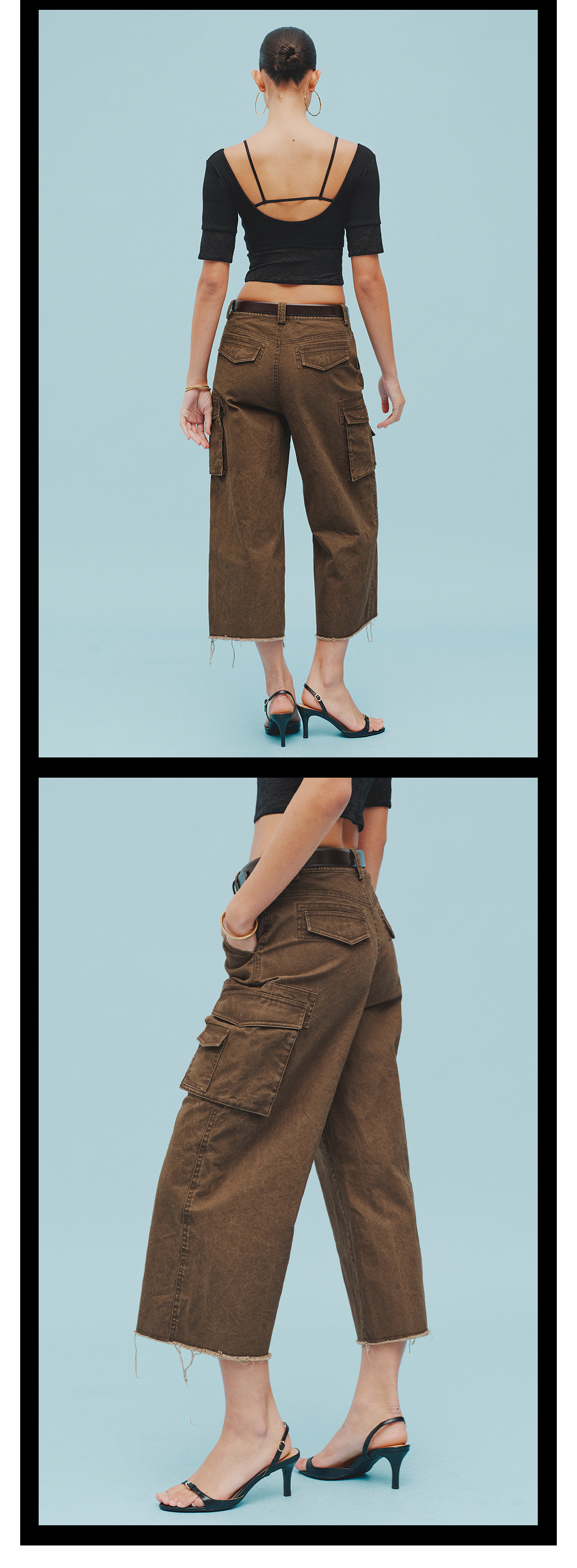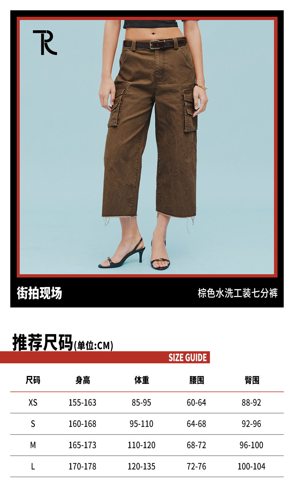 TR她热 街拍现场 棕色水洗做旧毛边复古松弛口袋工装七分牛仔裤